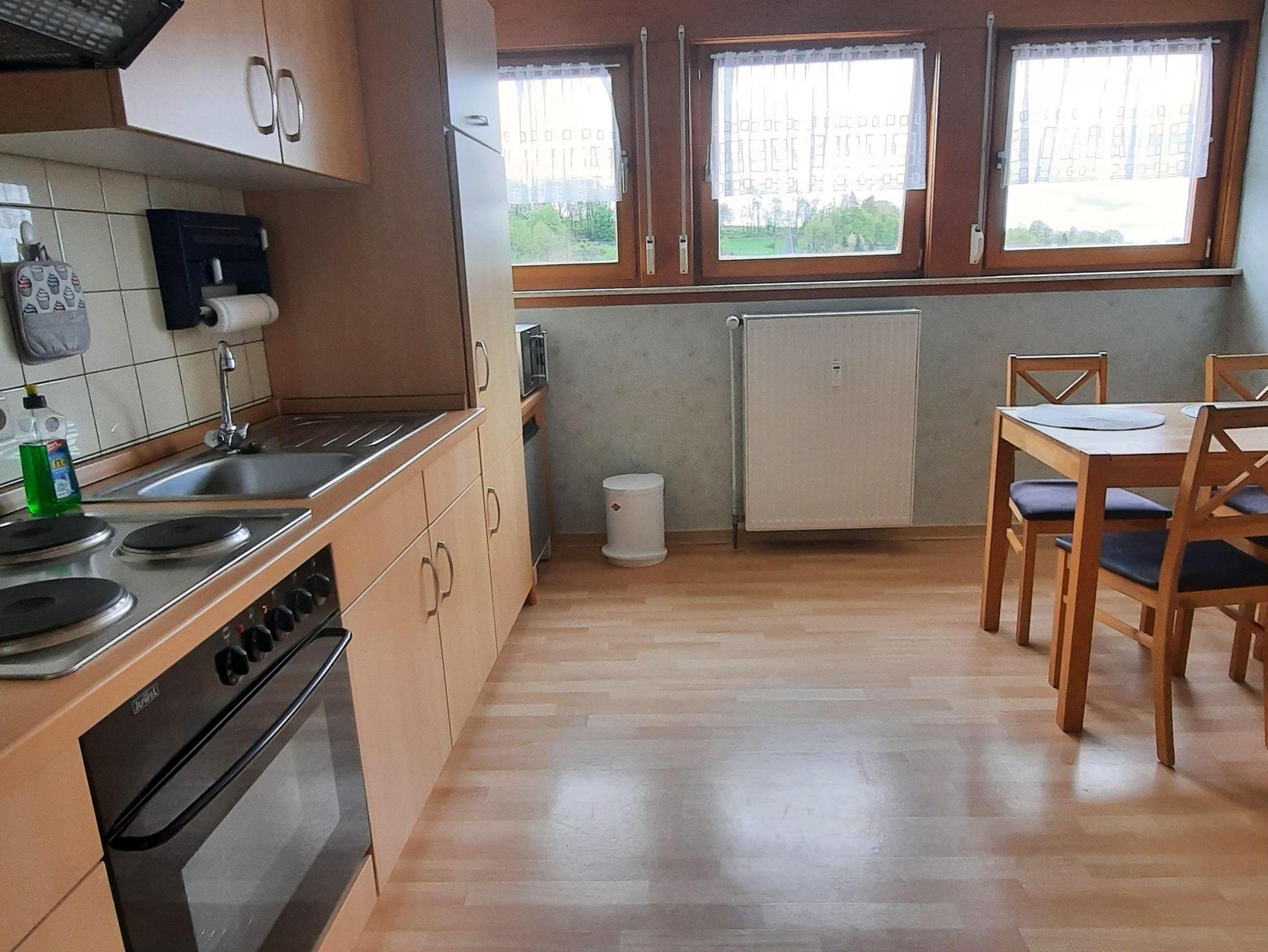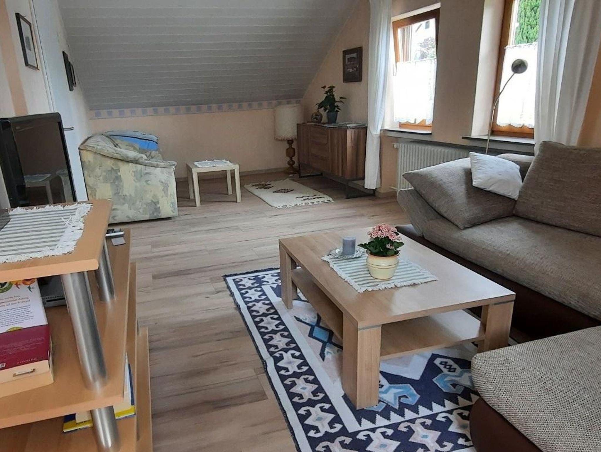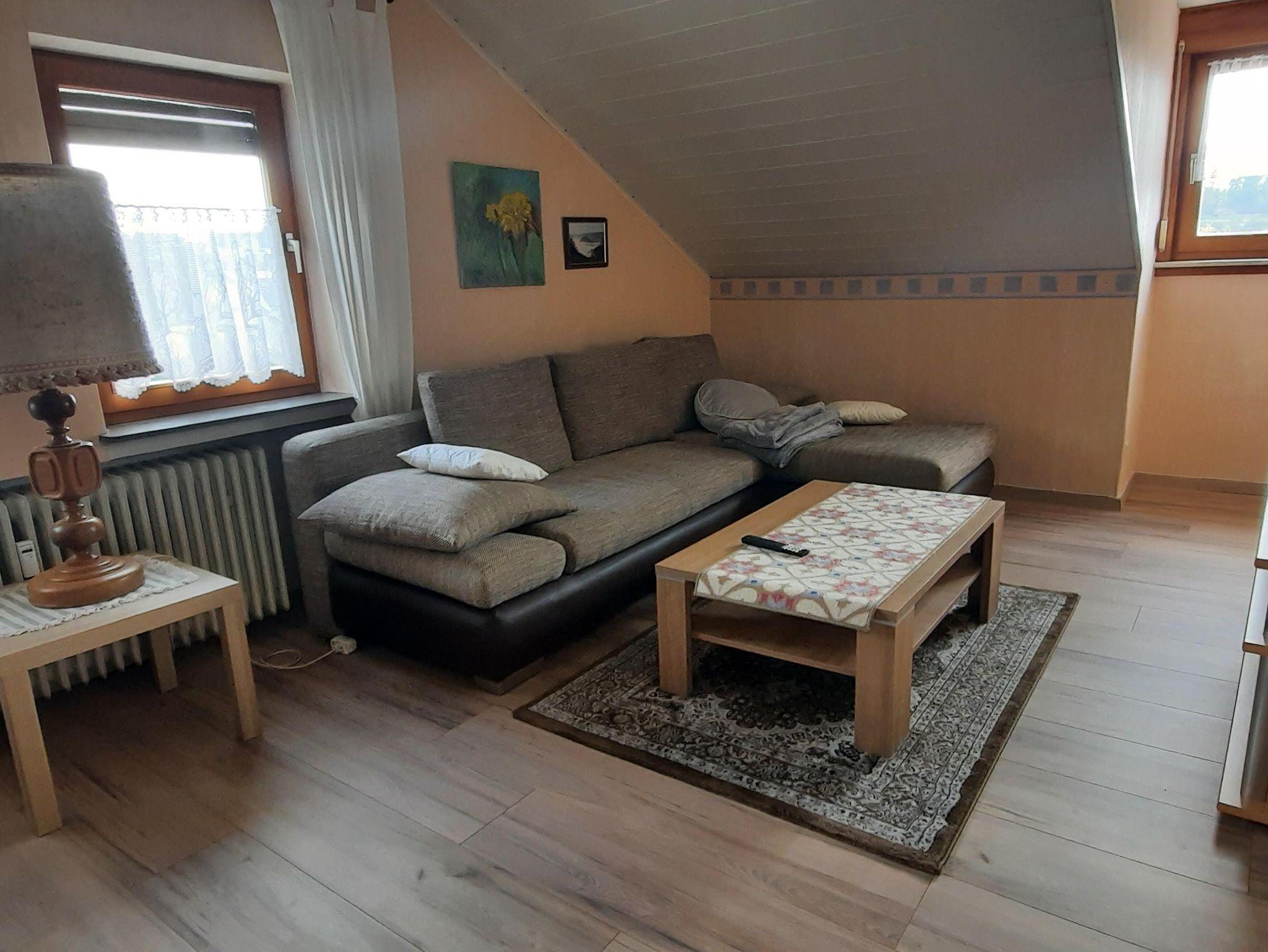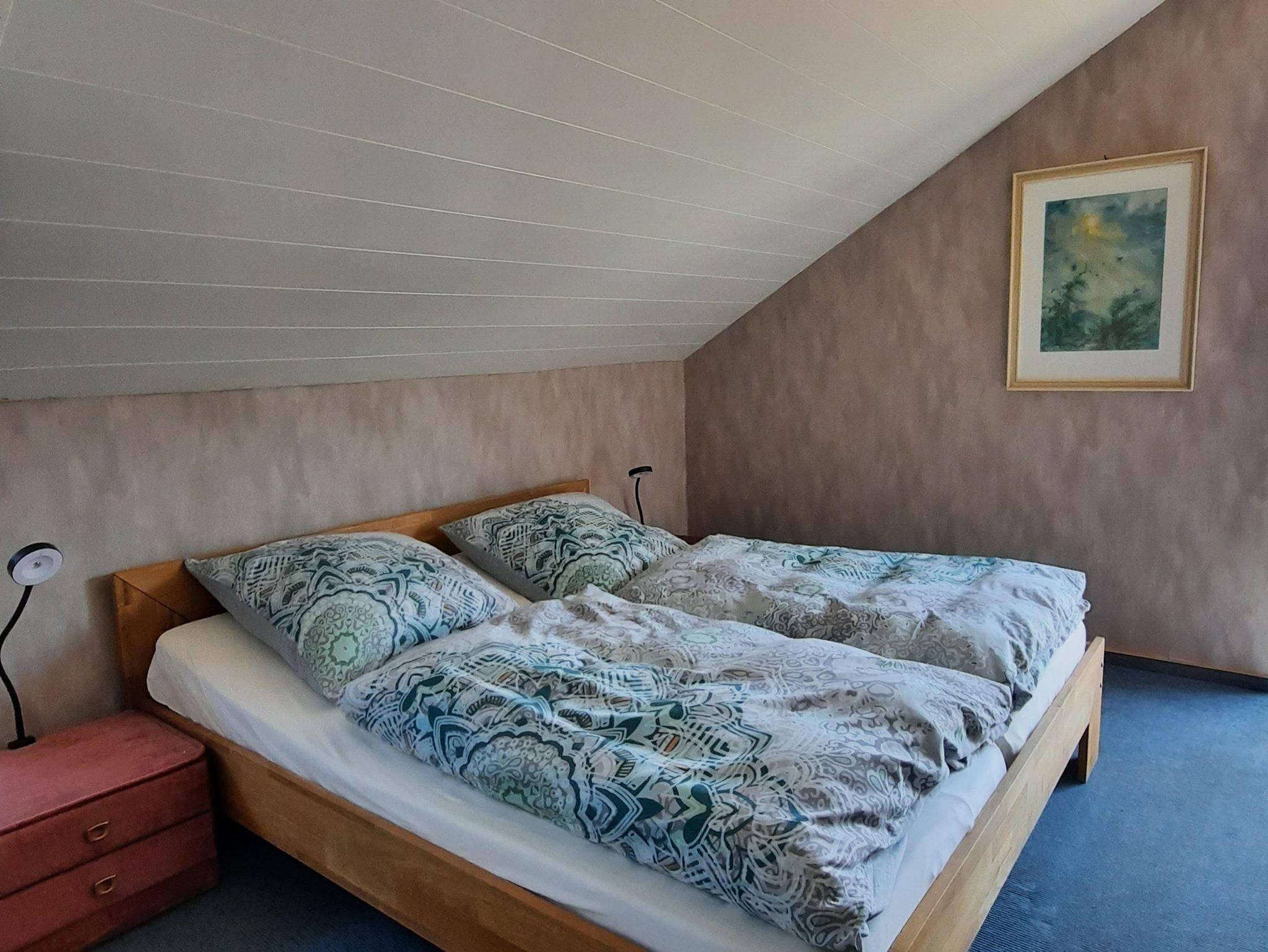 Die gemütliche Wohnung bietet Platz für bis zu vier Personen und verfügt über ein 24 qm großes Wohnzimmer mit Flachbildfernseher, WLAN, Eck- und Schlafcouch sowie einem Sideboard. Die voll ausgestattete Küche (10 qm) umfasst einen Elektroherd mit Backofen, Kühlschrank, kleinen Gefrierschrank, Toaster, Mikrowelle, Wasserkocher sowie einen Esstisch für vier Personen. Das 14 qm große Schlafzimmer ist mit einem Doppelbett, Bettwäsche und einem Kleiderschrank ausgestattet und bietet direkten Zugang zur großen Sonnenterrasse mit herrlicher Weitsicht. Im 8 qm großen Bad befinden sich Dusche, Waschbecken, Toilette, Handtücher und eine Waschmaschine. Zusätzlich stehen eine abgeschlossene Fahrradgarage mit Lademöglichkeit sowie ein PKW-Stellplatz zur Verfügung.