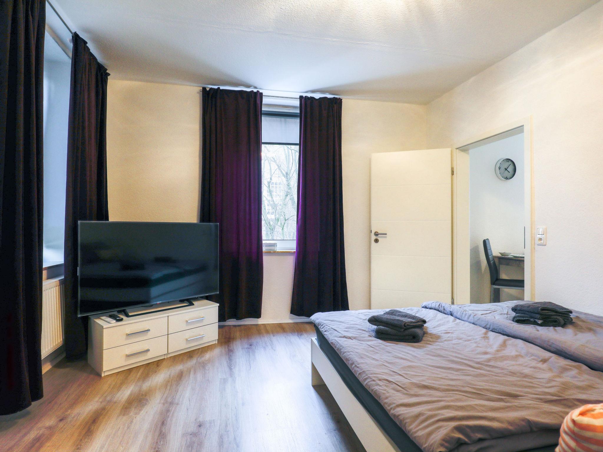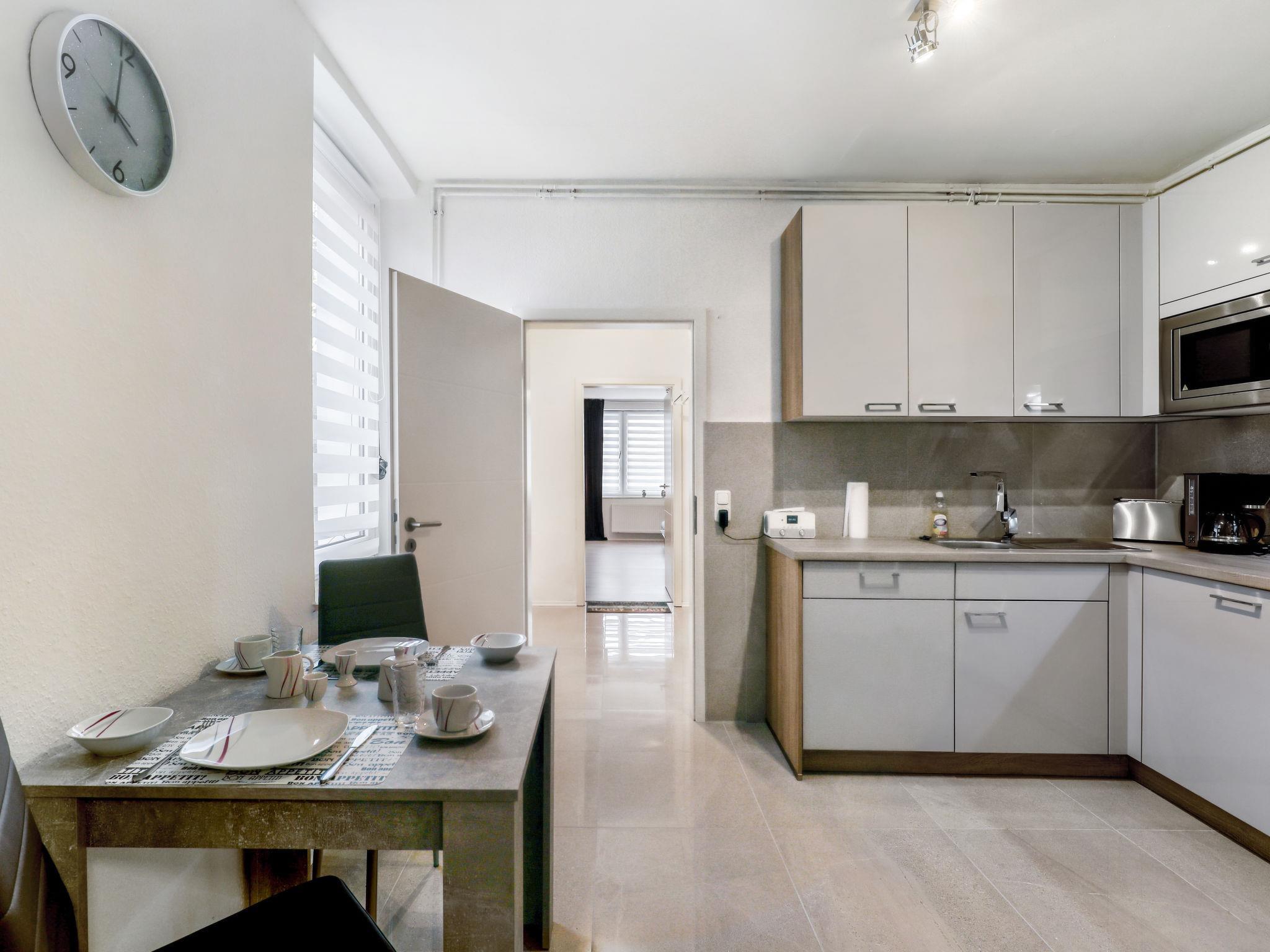 2-room apartment 65 m2, on the ground floor. Fully renovated in 2022, modern and stylish furnishings: large living/sleeping room with 1 double sofabed, cable TV and flat screen with 1 double bed (180 cm, length 200 cm), cable TV and flat screen. Kitchen (oven, dishwasher, 4 ceramic glass hob hotplates, toaster, kettle, microwave, electric coffee machine) with dining table. Shower/WC. Heating. Facilities: Internet (WiFi, free). Please note: non-smokers only. Smoke alarm. The apartment entrance is at the back of the house.