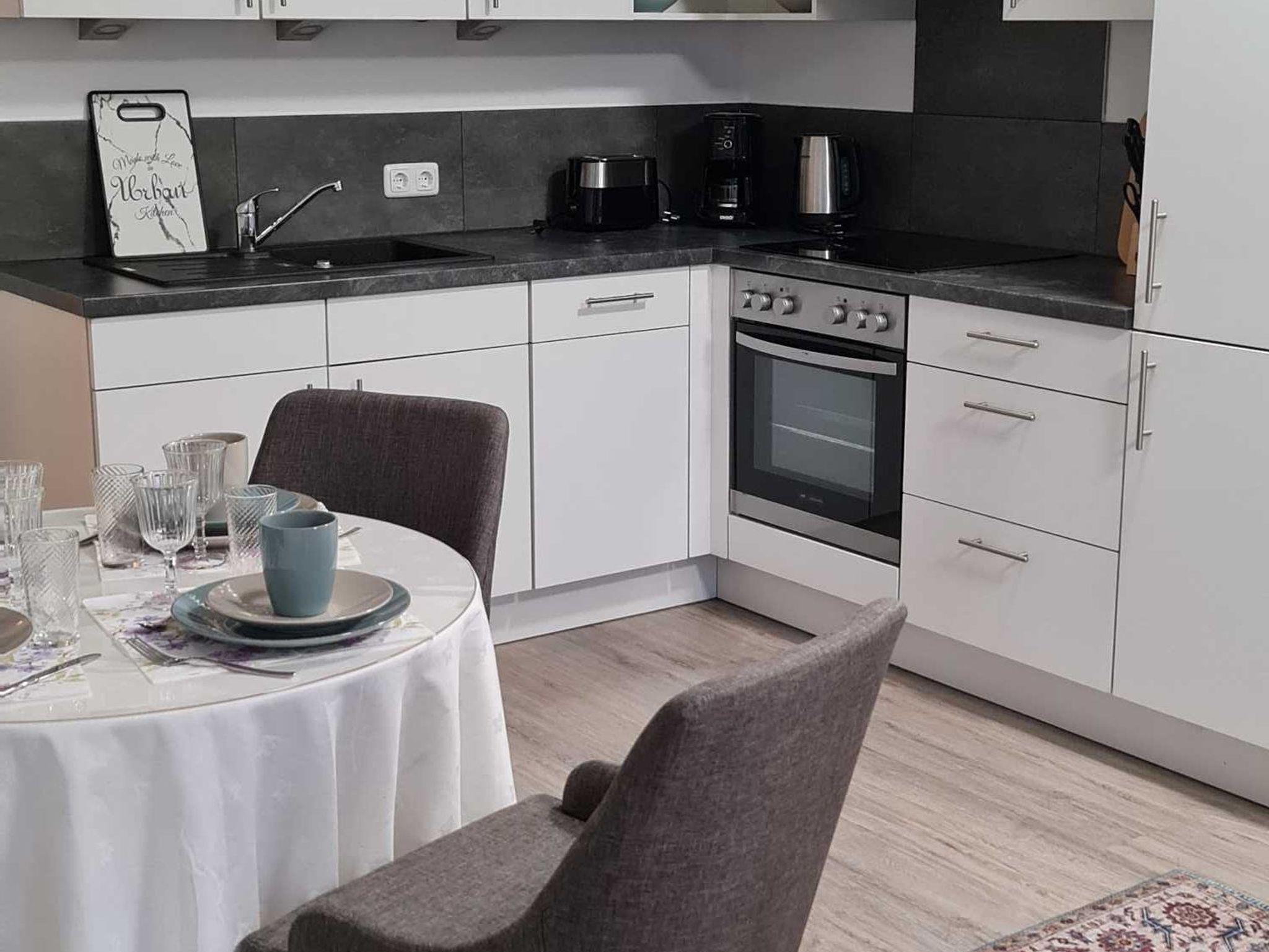 Die Küchenzeile ist mit einem Kühlschrank mit Gefrierfach, einer Spülmaschine, einem Backofen, einem Wasserkocher, einer Kaffeemaschine und einem Toaster ausgestattet.