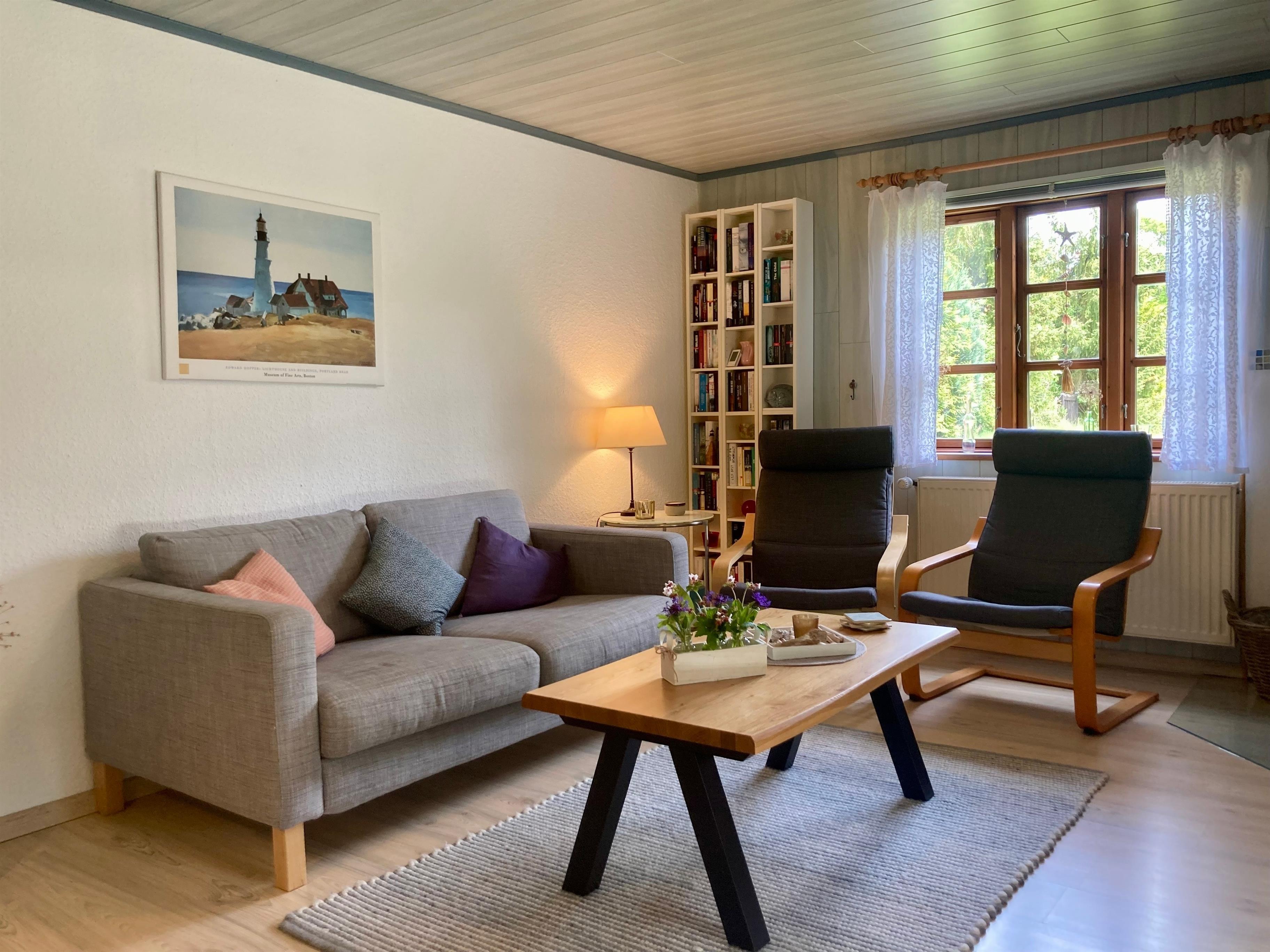 Das KLEINE MEISENHAUS (WING100) mit einer Wohnfläche von ca. 55m² für 4 Personen steht ruhig, am Ende einer Stichstraße und ist umgeben von einem gepflegten, ca. 1.000 m² großen Gartengrundstück. Teilüberdachte Terrasse mit Mobiliar, Grill und 2 Sonnenliegen. Ebenerdiger, überdachter Zugang ins Erdgeschoß: kleiner Flur. Wohnaum mit gemütlicher Sitzgruppe (Sofa, 2 Relax-Sessel), Kaminofen (1x Korb Holz inklusive), SAT-TV, Digital-Radio, Internetzugang (W-LAN, gratis), Terrassenausgang. Zum Flur offene Küche mit Einbauherd (4 Ceranfelder, Backofen), kleinem Geschirrspüler, Kühlschrank, Kaffeemaschine, Wasserkocher, Toaster, abgeteilter Essplatz für 4 Personen. 2 Zweibettzimmer. Dusche/WC (Waschmaschine, Bügelbrett-/eisen). Freundlich-helle, gemütliche Einrichtung mit liebevollen Details in Raumgestaltung und Design. Gas-Zentralheizung.