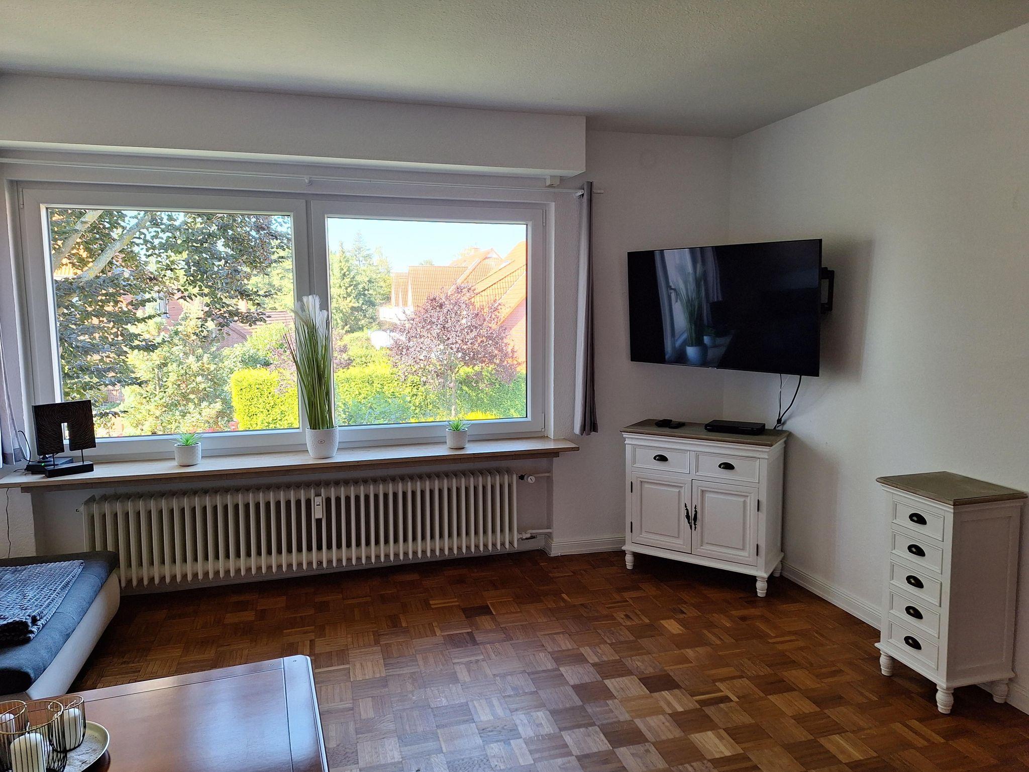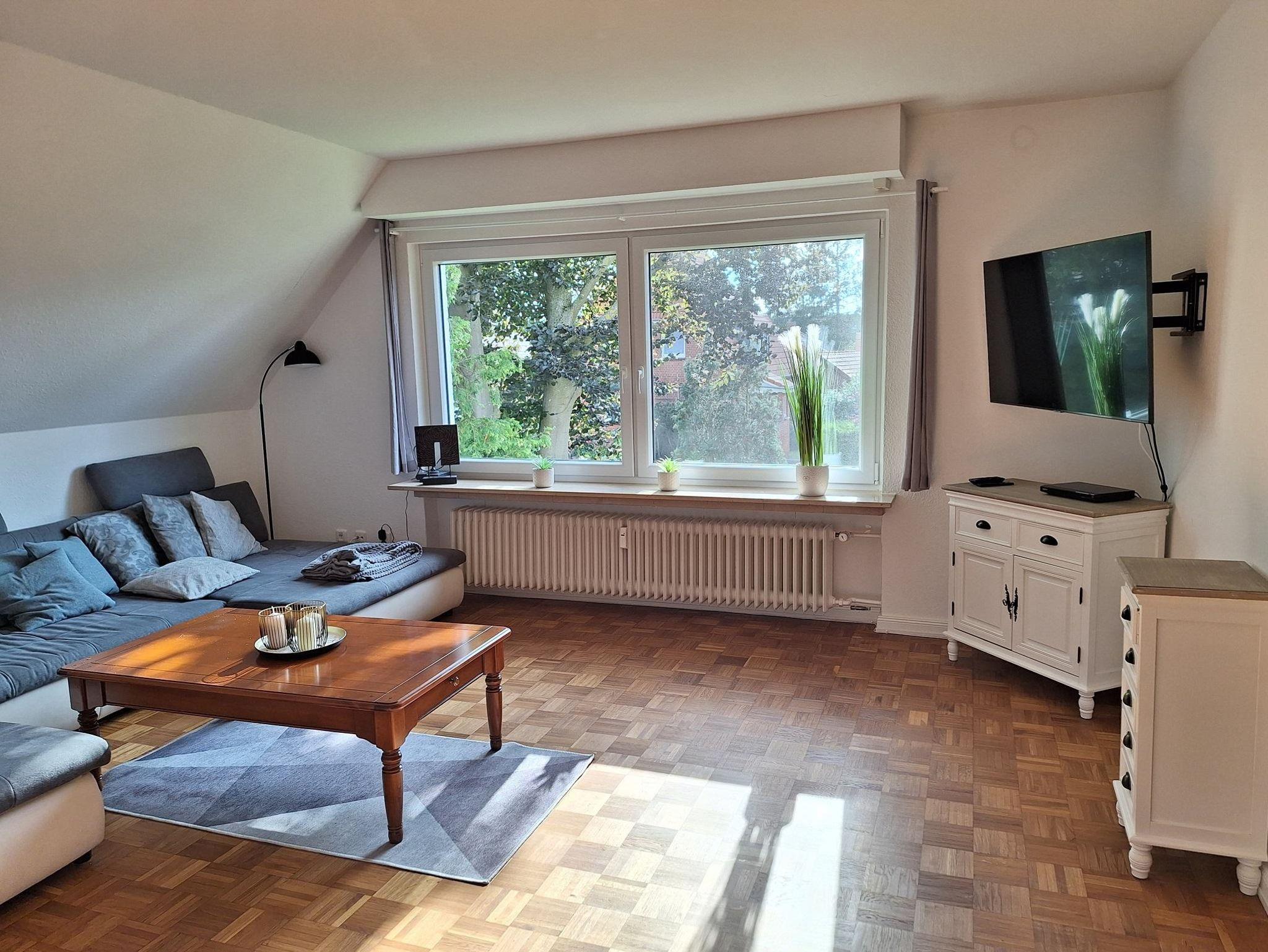 Im Wohnzimmer finden sie ein großes und bequemes Sofa auf dem problemlos 4 Personen Platz finden. Außerdem haben sie hier einen Fernseher mit Satellitenanschluss. Der Fußboden ist Echtholzparkett.