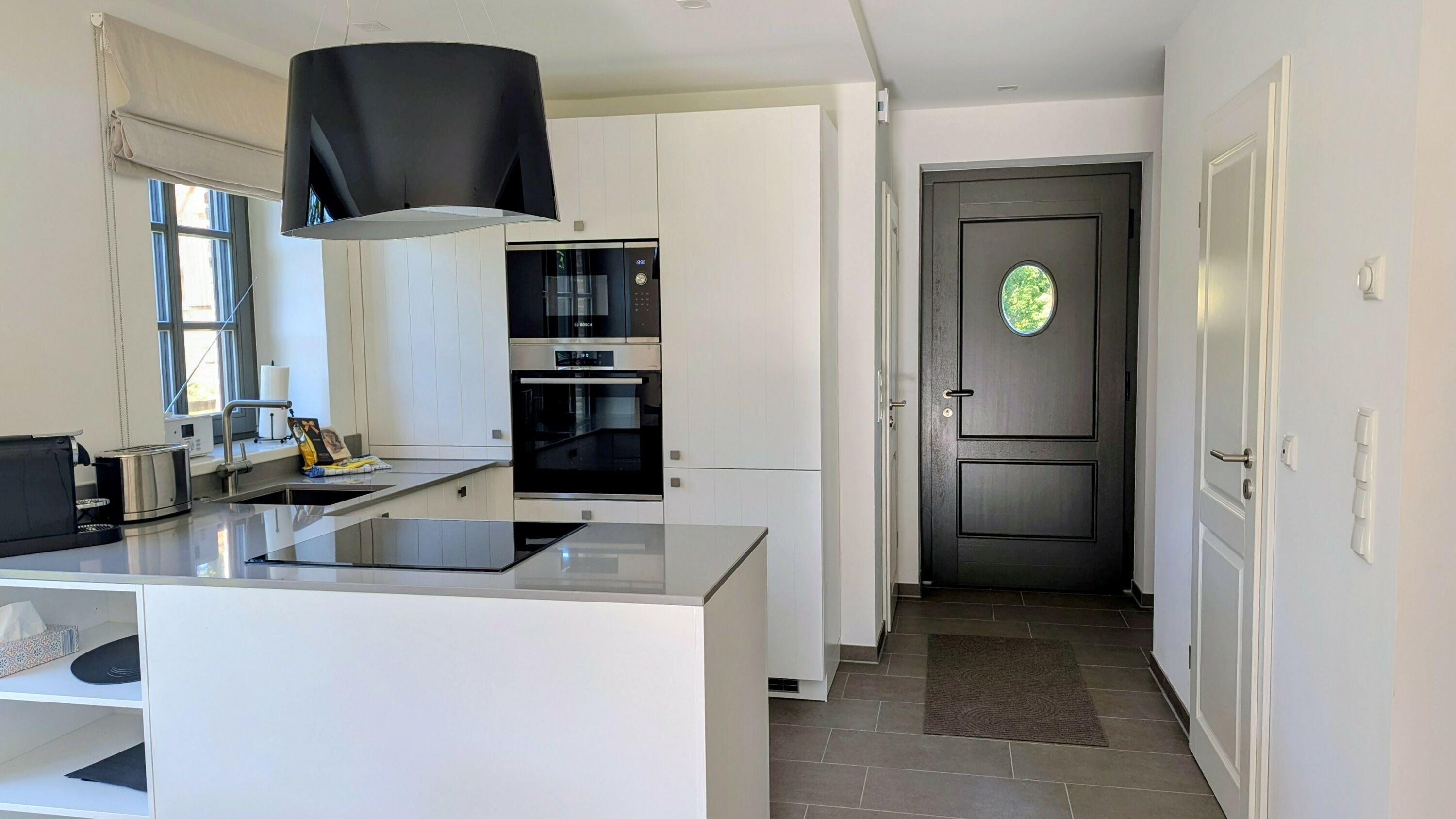 Betreten Sie das lichtdurchflutete Haus und lassen Sie sich von der offenen Wohnküche begeistern, die mit hochwertigen Markengeräten ausgestattet ist. Die bodentiefen Fenster sorgen für eine helle und einladende Atmosphäre, in der Sie gemütliche Abende verbringen können.
