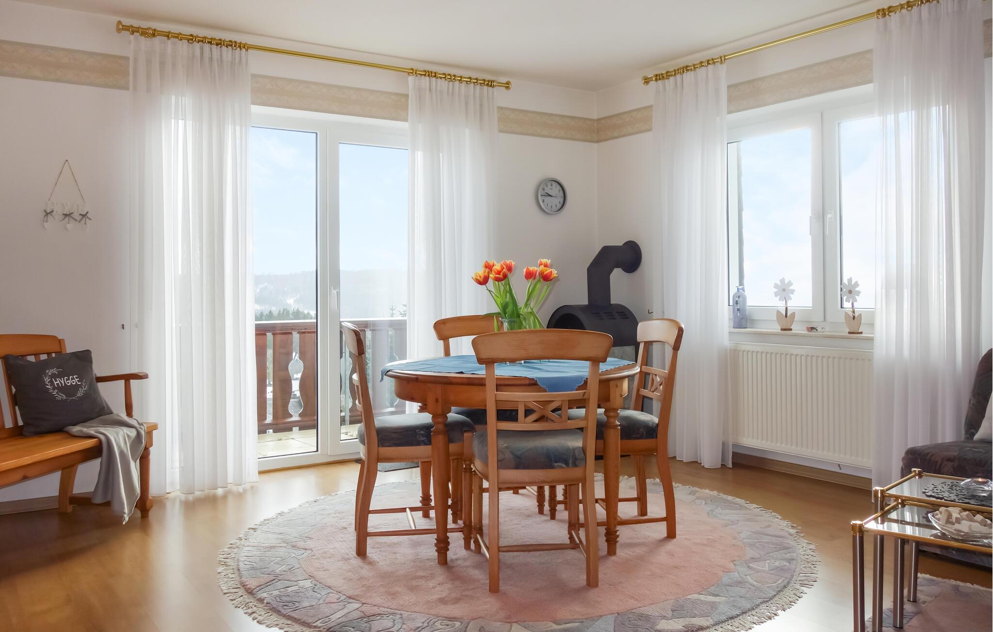 Denne skønne lejlighed ligger i et større kompleks i en idyllisk beliggenhed med udsigt til bakker, enge og skove. Her venter jer en behagelig base, hvor I kan fyre op i brændeovnen og hvile stængerne med brætspil og kortspil ved spisebordet. Boligen er udstyret med alt, I behøver til en afslappende ferie uden de store bekymringer. I sommermånederne kan I trække ud på altanen og nyde en lækker morgenmad med en skøn udsigt til de smukke omgivelser.