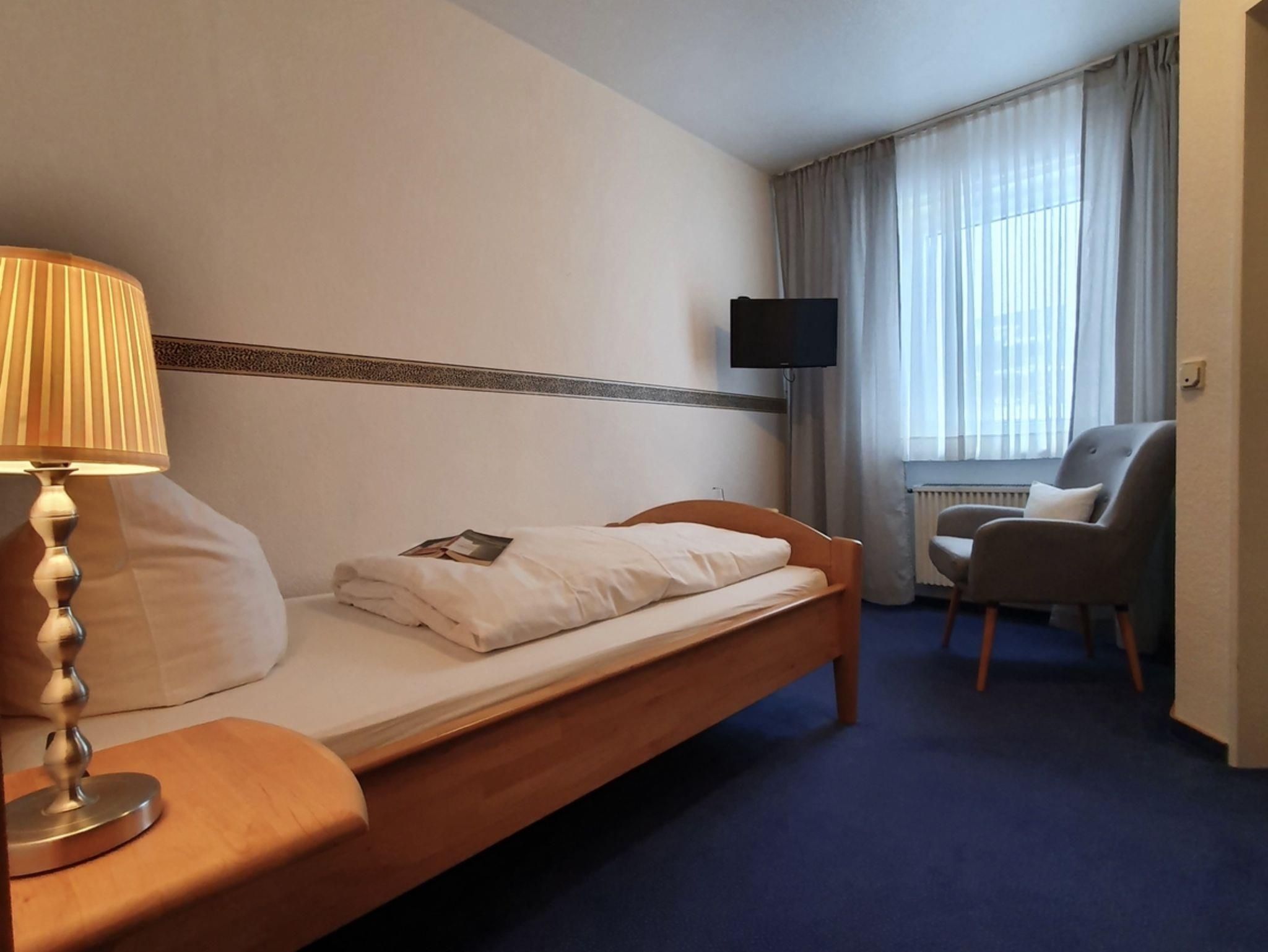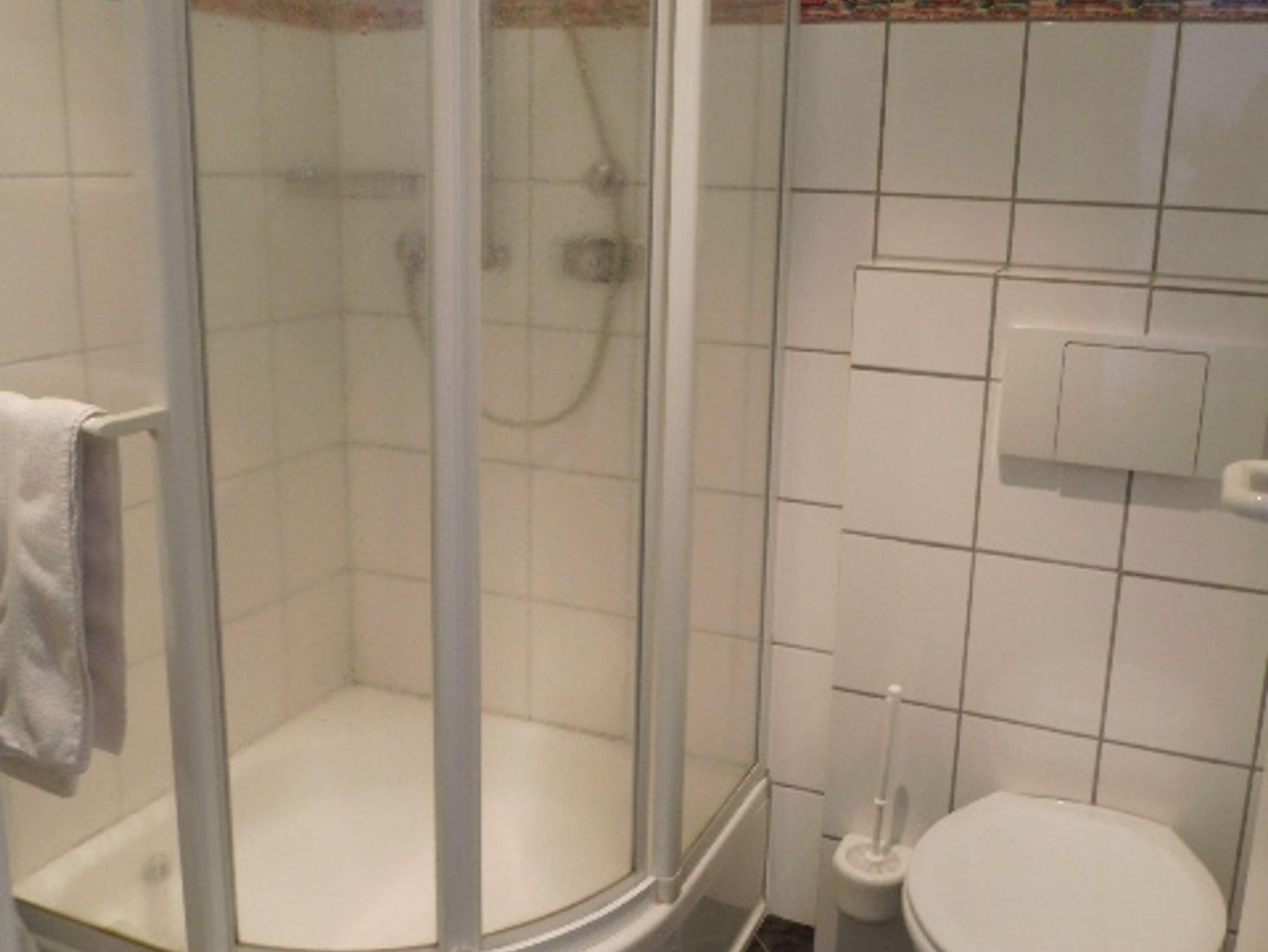 freundlich eingerichtetes Zimmer mit Flat-TV und kleinem Bad mit Dusche/WC