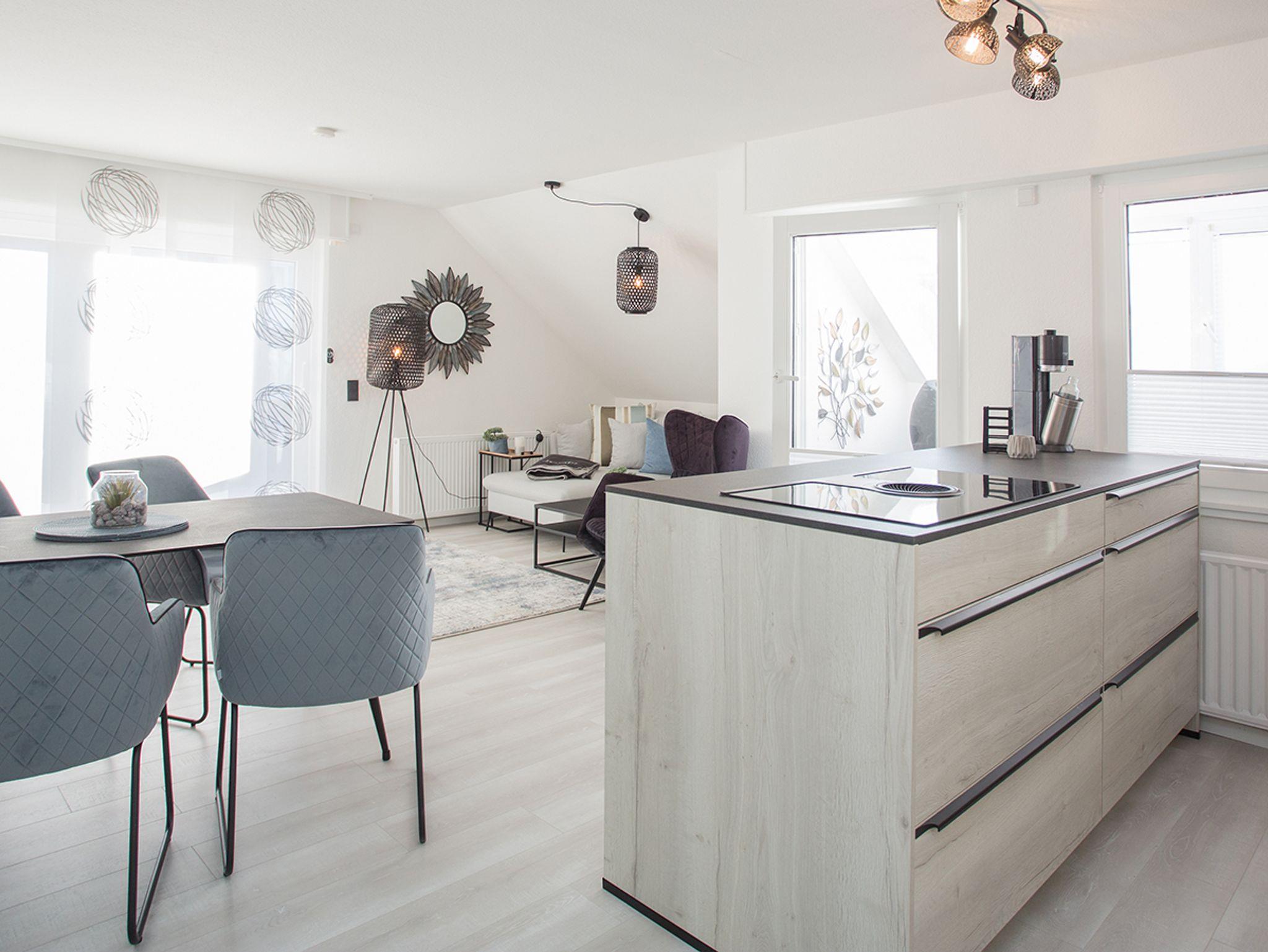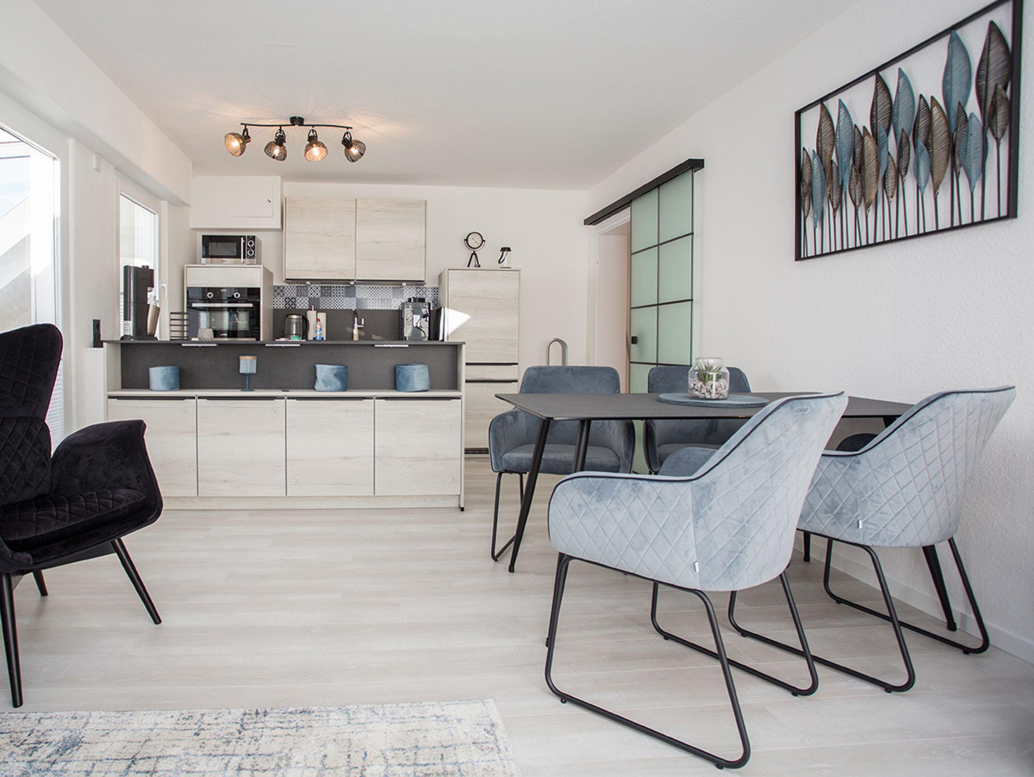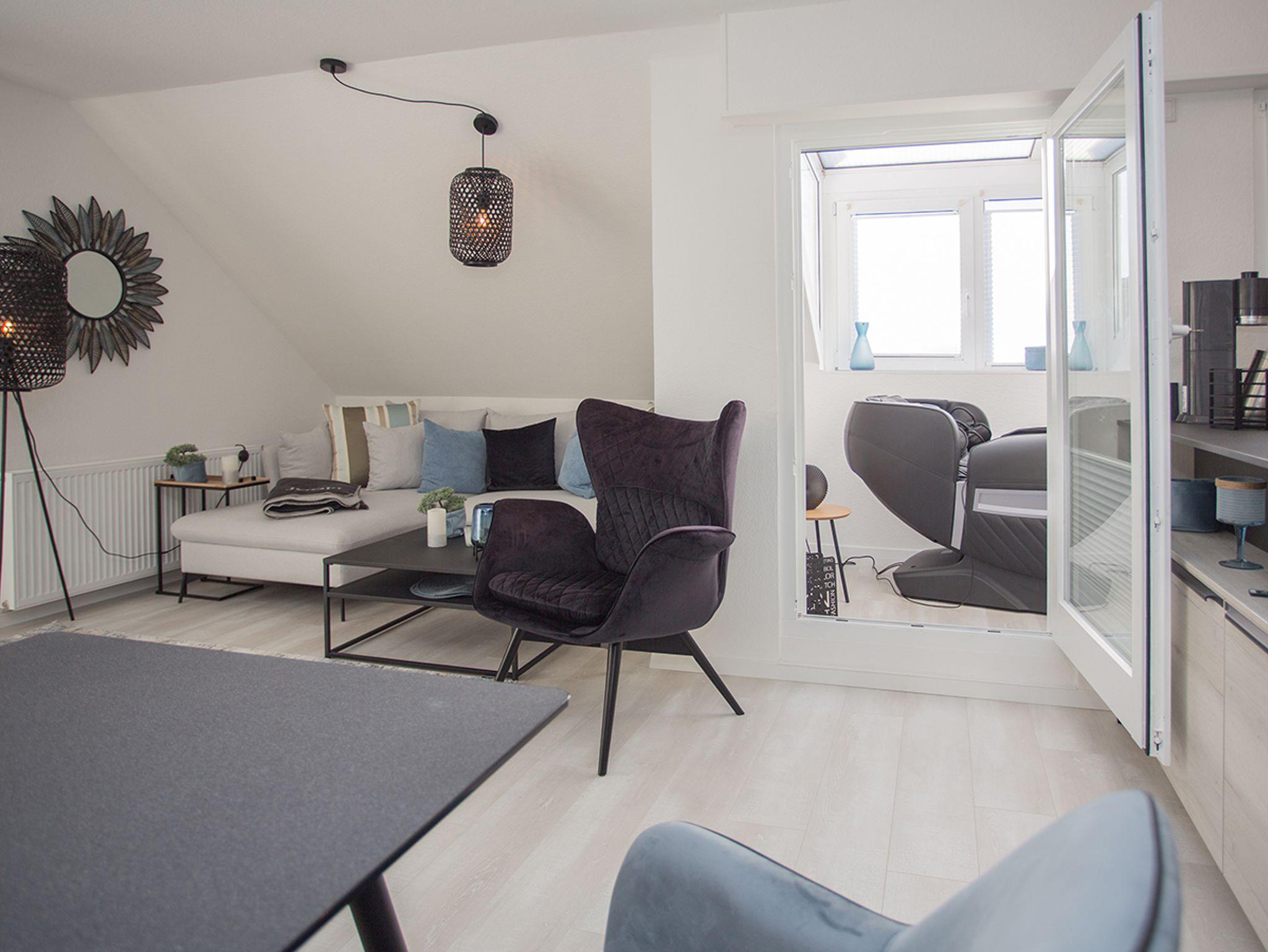 Die moderne Ferienwohnung verfügt u. a. über ein Schlafzimmer mit Boxspringbett, Infrarotsauna, Massagesessel,Elektrokamin, Wohnzimmer mit Loungeecke (Schlafsofa), einen sonnigen Balkon, eine gemütlichen Loogia mit Schreibtisch, eine vollausgestattete Wohn-Küche mit Kochinsel, ein Bad mit Dusche u.v.m.