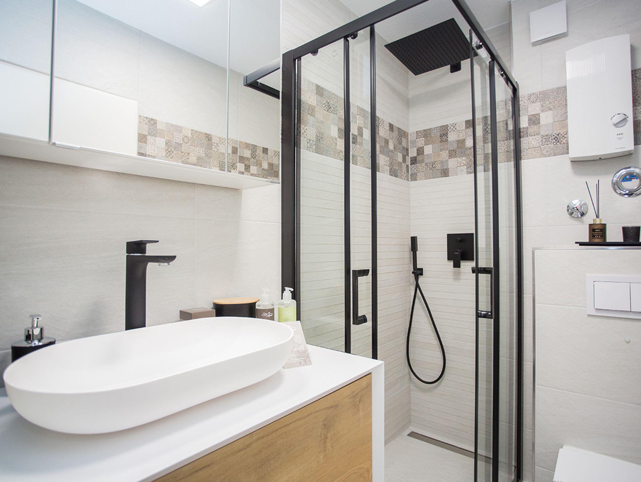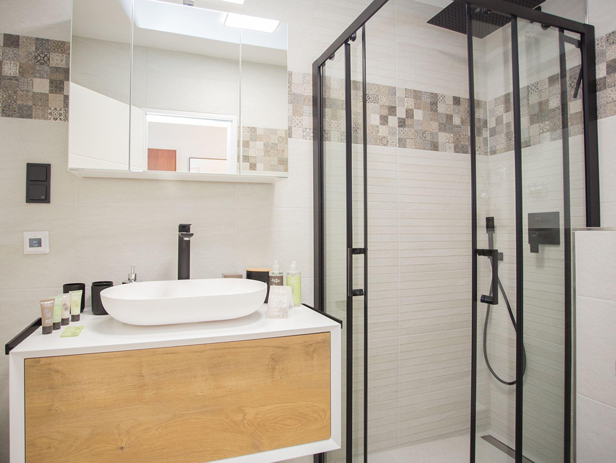 Das Bad verfügt über eine Dusche, Waschbecken und WC.