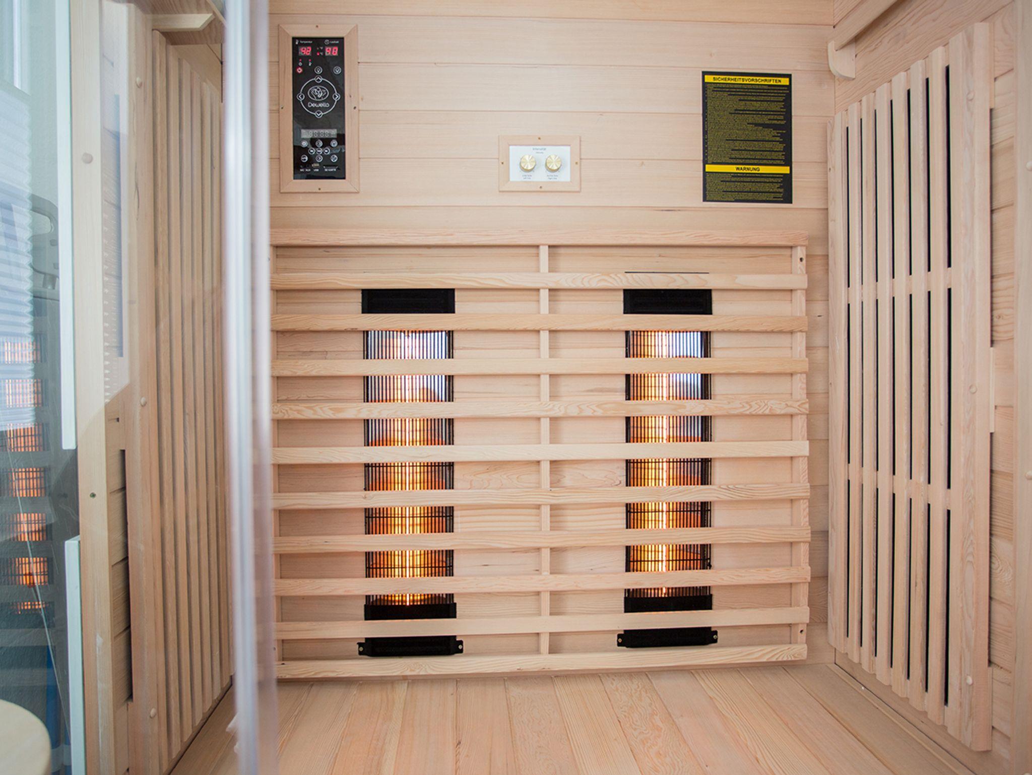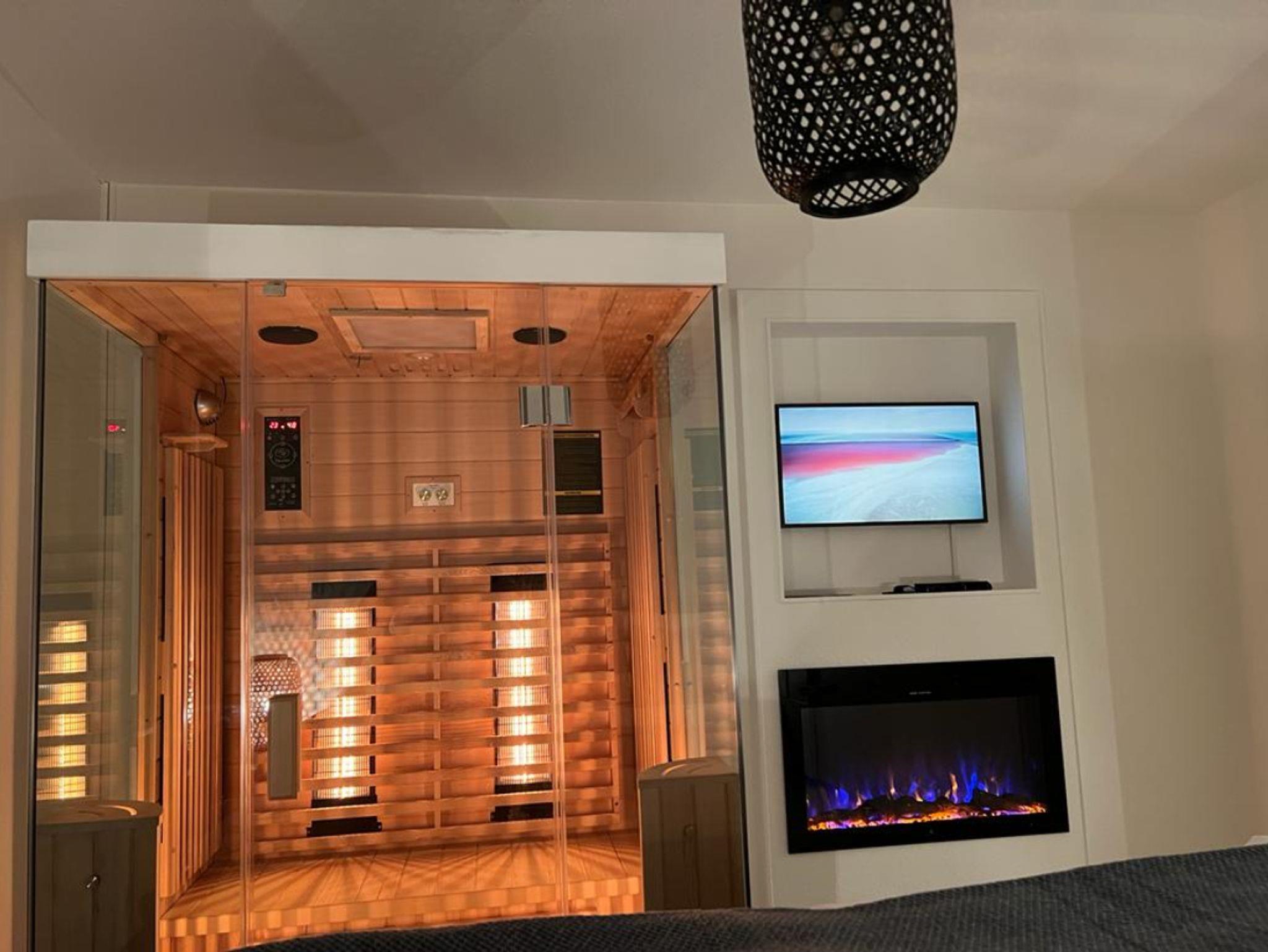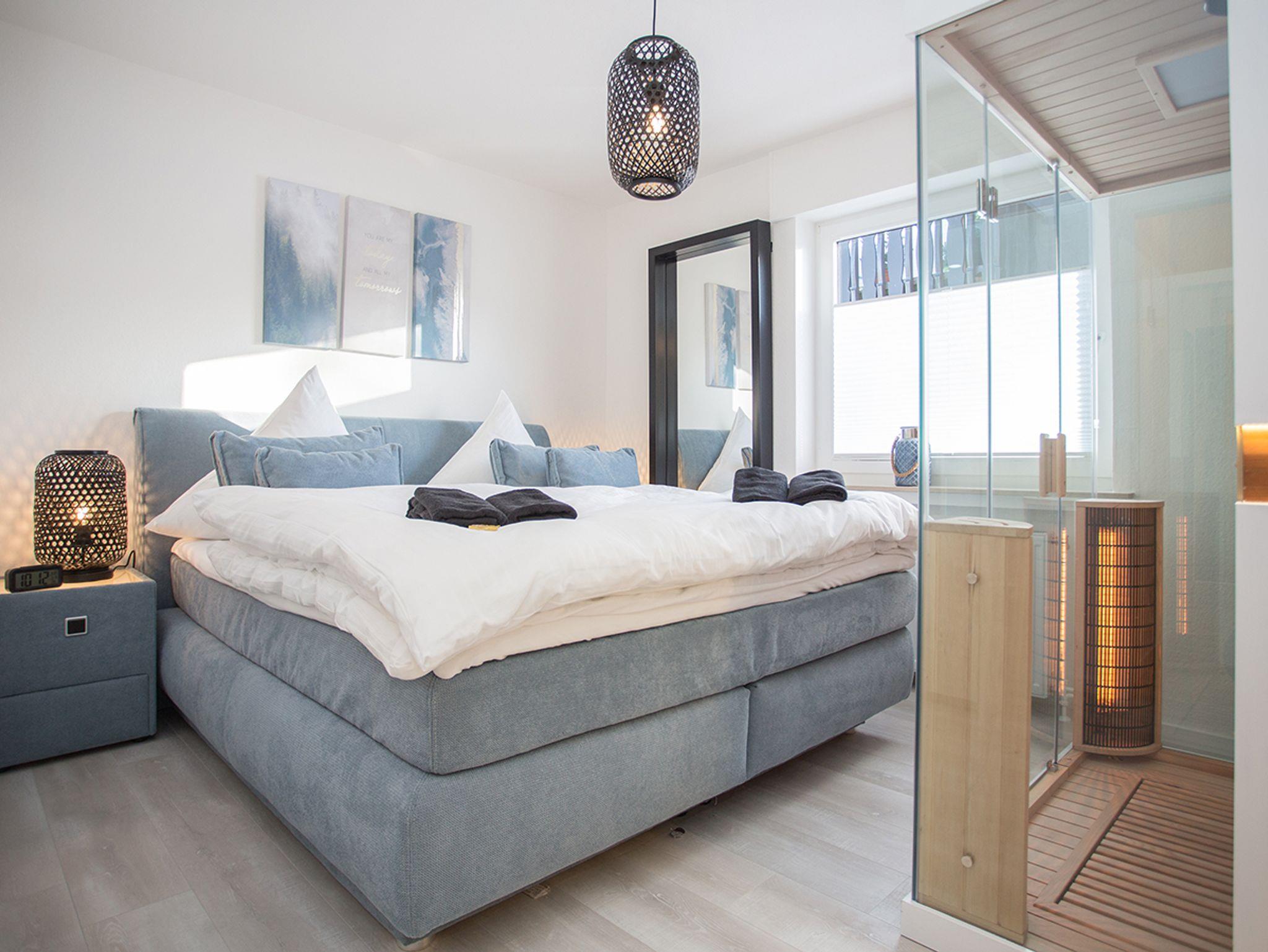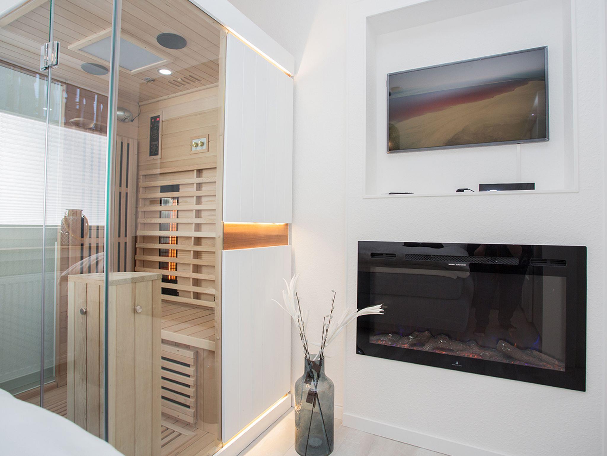 Das Schlafzimmer ist mit einem Boxspringbett (180 x 200 cm), einem Kleiderschrank, einem Flachbild-TV und einem Elektrokamin ausgestattet. Im Schlafzimmer ist als besonderes Highlight eine Infrarotsauna und ein Elektrokamin integriert.