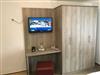 Geschmackvoll und helles eingerichtetes Zimmer mit Boxspringbett und Flachbild TV.