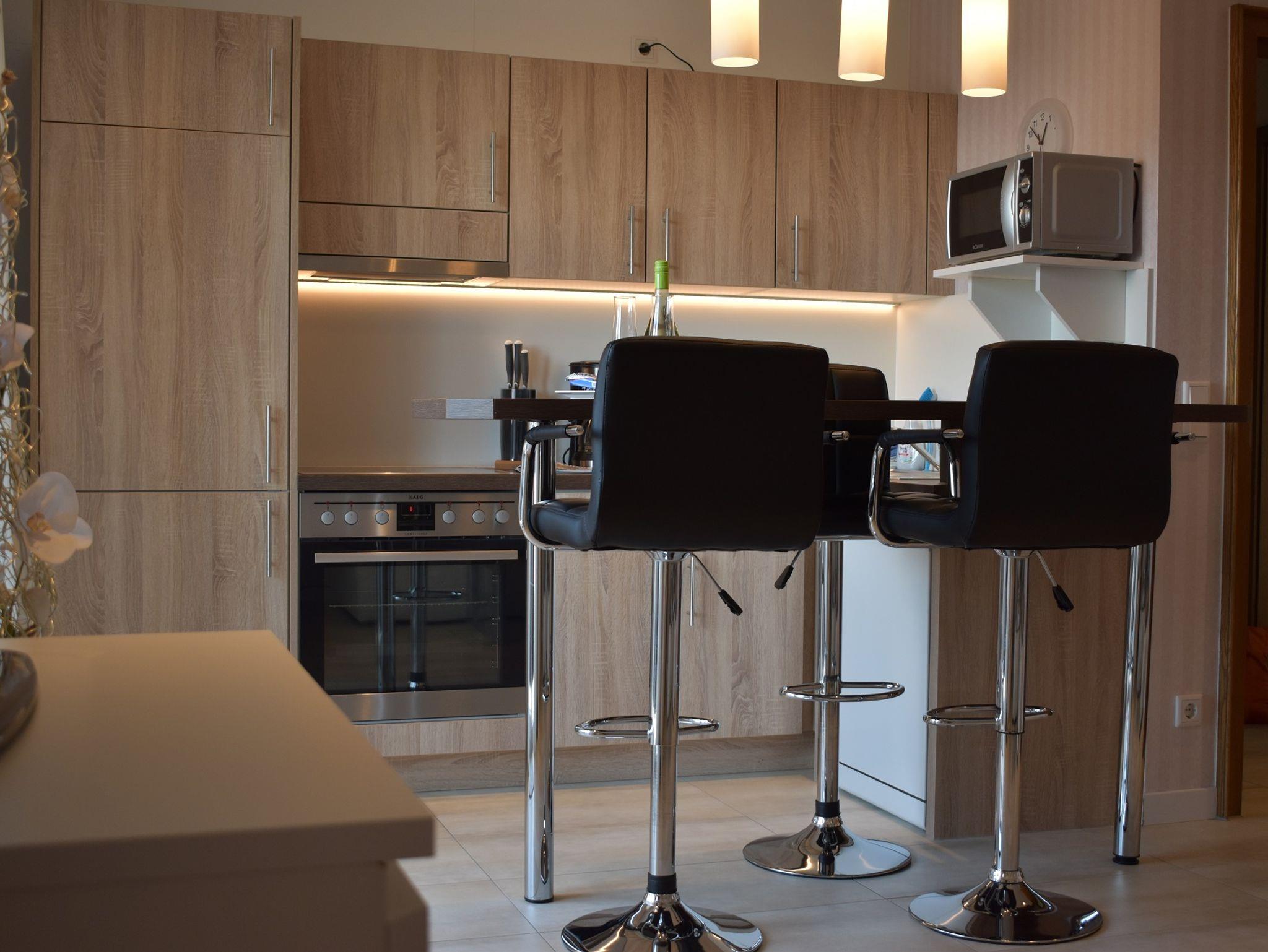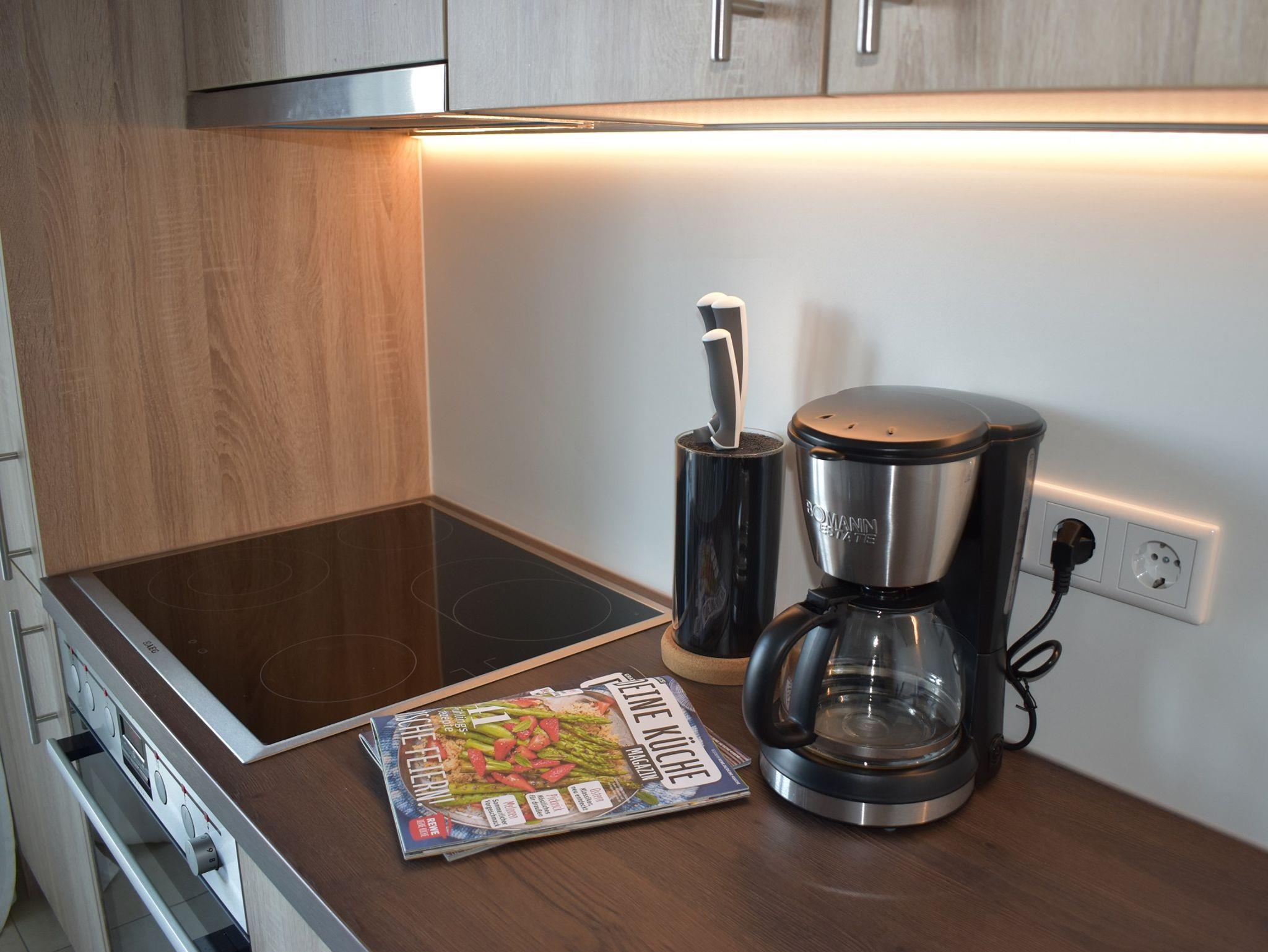 Zur Ausstattung der Ferienwohnung gehören u.a. Flachbild TV, kostenloses WLAN, Herd mit Backofen, Kaffeemaschine, Toaster, Wasserkocher, Mikrowelle und Spülmaschine. Bettwäsche, Hand- und Trockentücher sind inklusive.