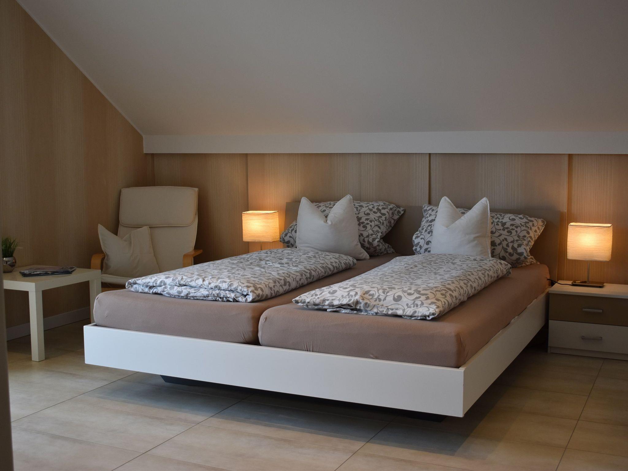 Sie liegt im Obergeschoss und bietet für 2 Personen Platz. Auf Anfrage besteht auch die Möglichkeit je nach Verfügbarkeit ein weiteres Schlafzimmer mit Bad zu buchen.