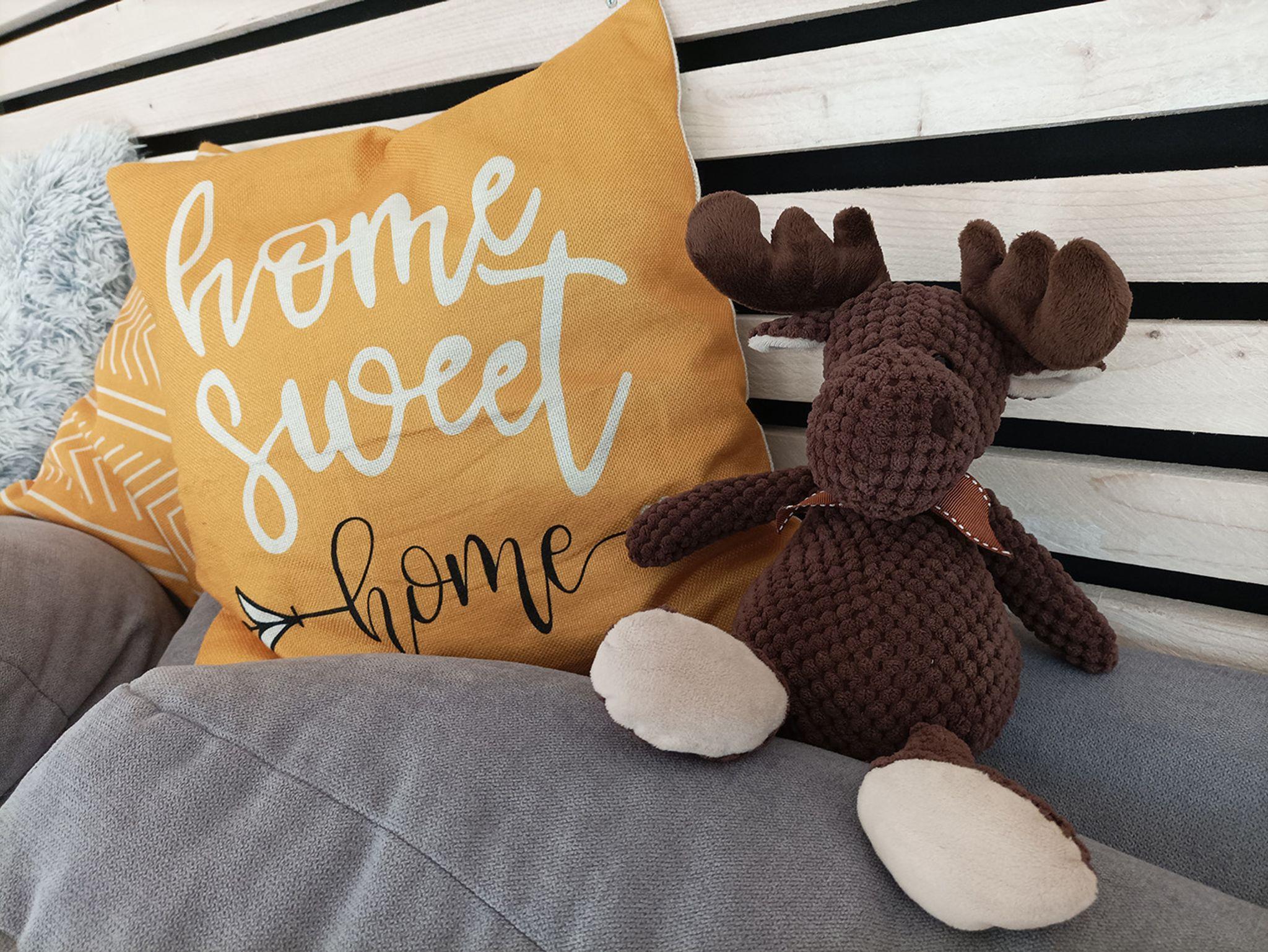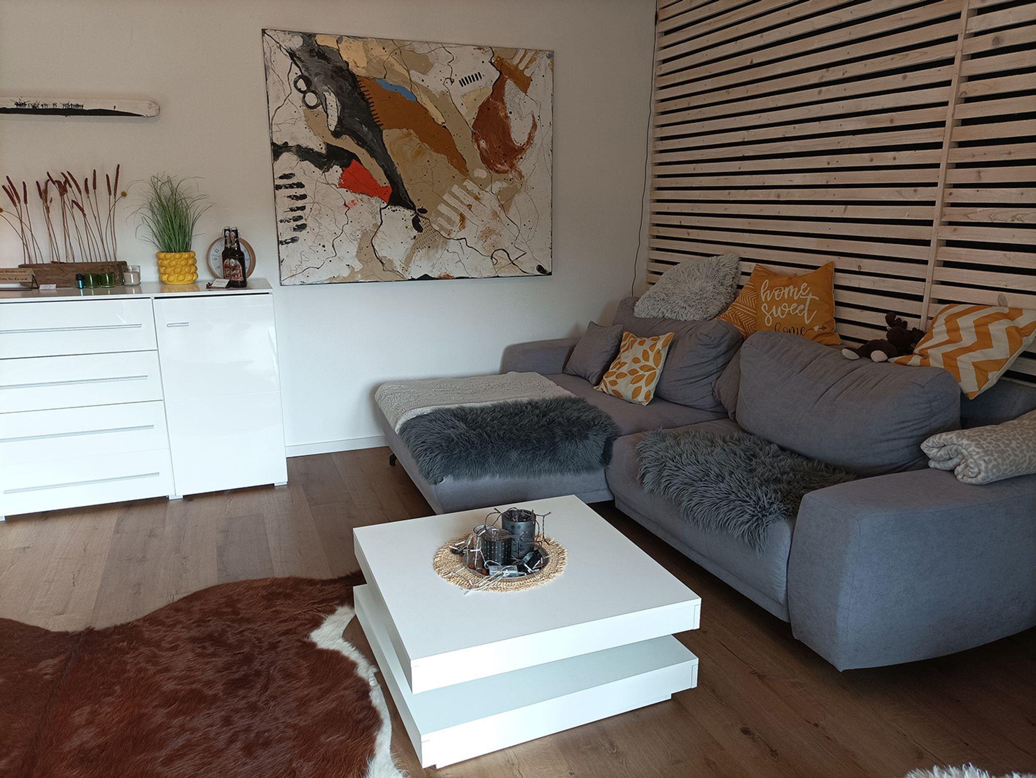 - ein gemütliches Wohnzimmer mit Sofa und Sitzgelegenheit,