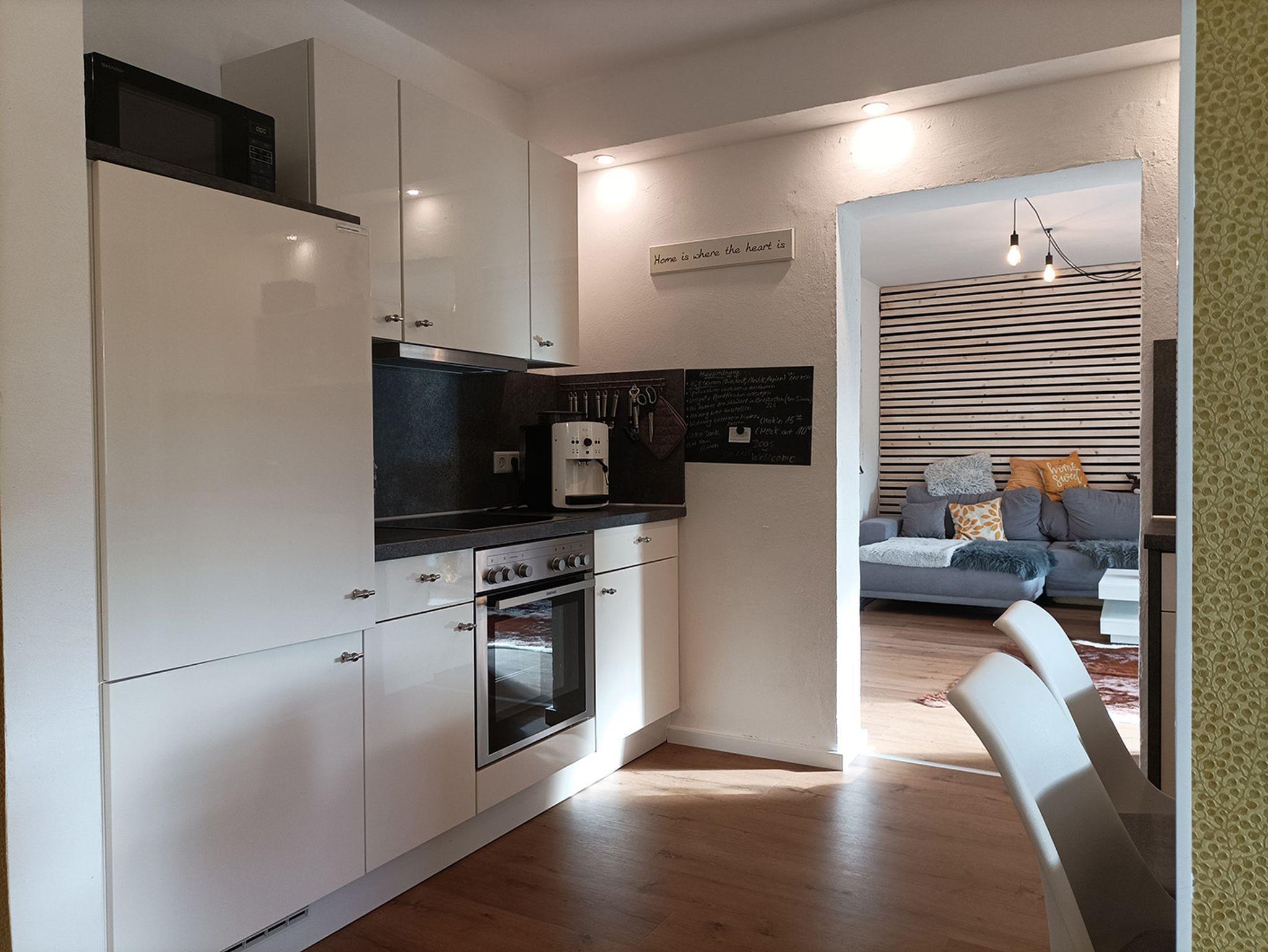 - eine voll ausgestattete Küchenzeile mit allem, was Sie brauchen: Kühlschrank, Mikrowelle, Spülmaschine, Backofen, Mixer, Toaster, Kaffeevollautomat und Cerankochfeld.