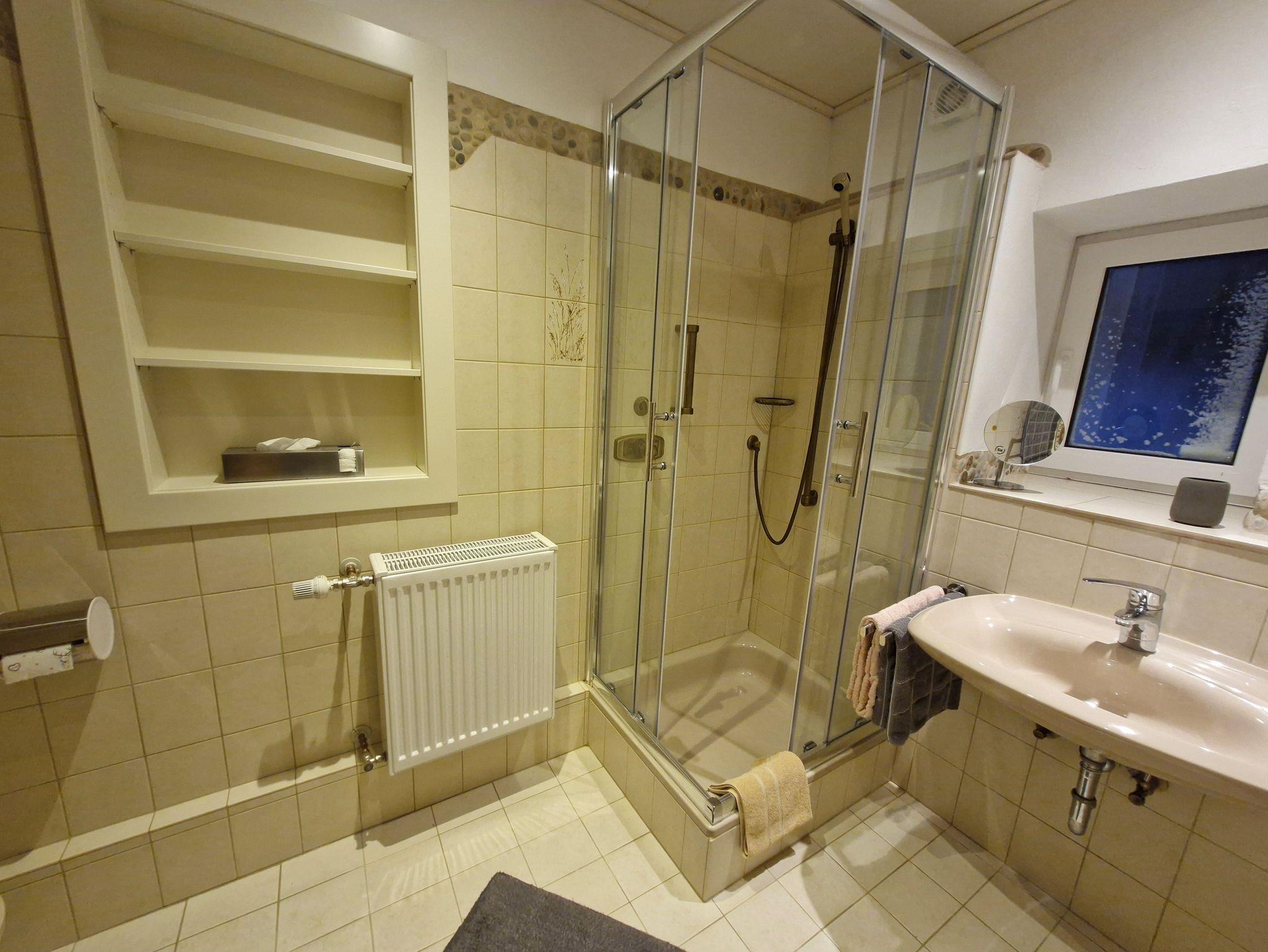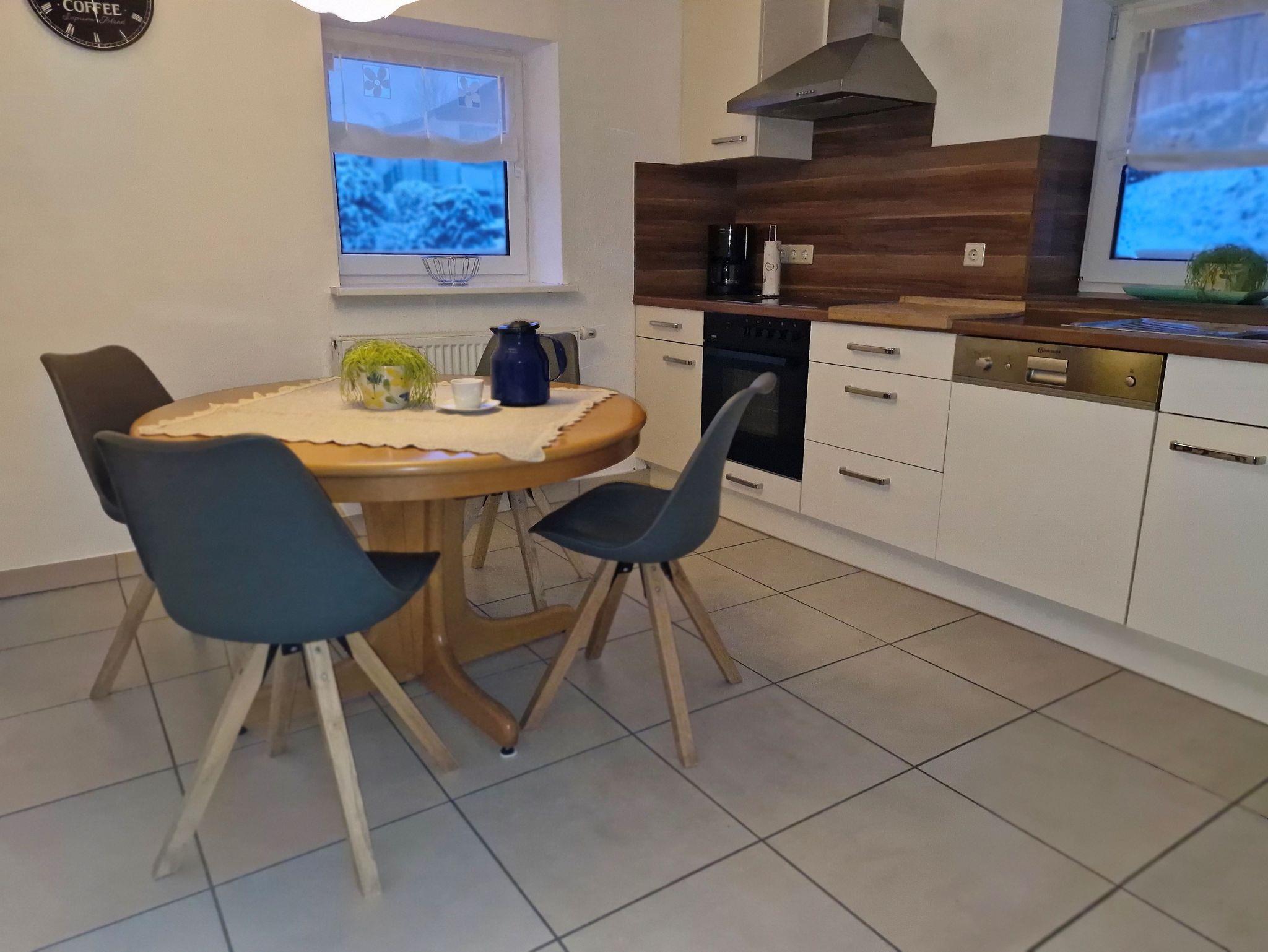 Die helle und freundlich eingerichtete Nichtraucherferienwohnung von 70 qm befindet sich in Parterre mit separatem Eingang und eignet sich für 2 Erwachsene und zwei Kinder/Jugendliche. Das gemütliche Wohnzimmer mit gemütlicher Sitzecke, SAT-TV, Radio und elektrischem Kamin lädt zum Verweilen ein. Die komplett ausgestattete Küche mit Geschirrspüler, Kühlschrank, Gefrierschrank, Herd, Backofen, Toaster, Kaffeemaschine und Mikrowelle lässt keine Wünsche offen. Die Ferienwohnung verfügt über 2 Schlafzimmer mit einem Doppelbett und einem Etagenbett. Das Badezimmer mit Dusche, großem Spiegel und WC rundet das Gesamtbild ab. Vor allem im Sommer können Sie entspannte Grillabende auf der Terrasse mit Blick in unseren gemütlichen Garten verbringen. Außerdem gibt es einen Spielbereich für die kleinen Gäste.