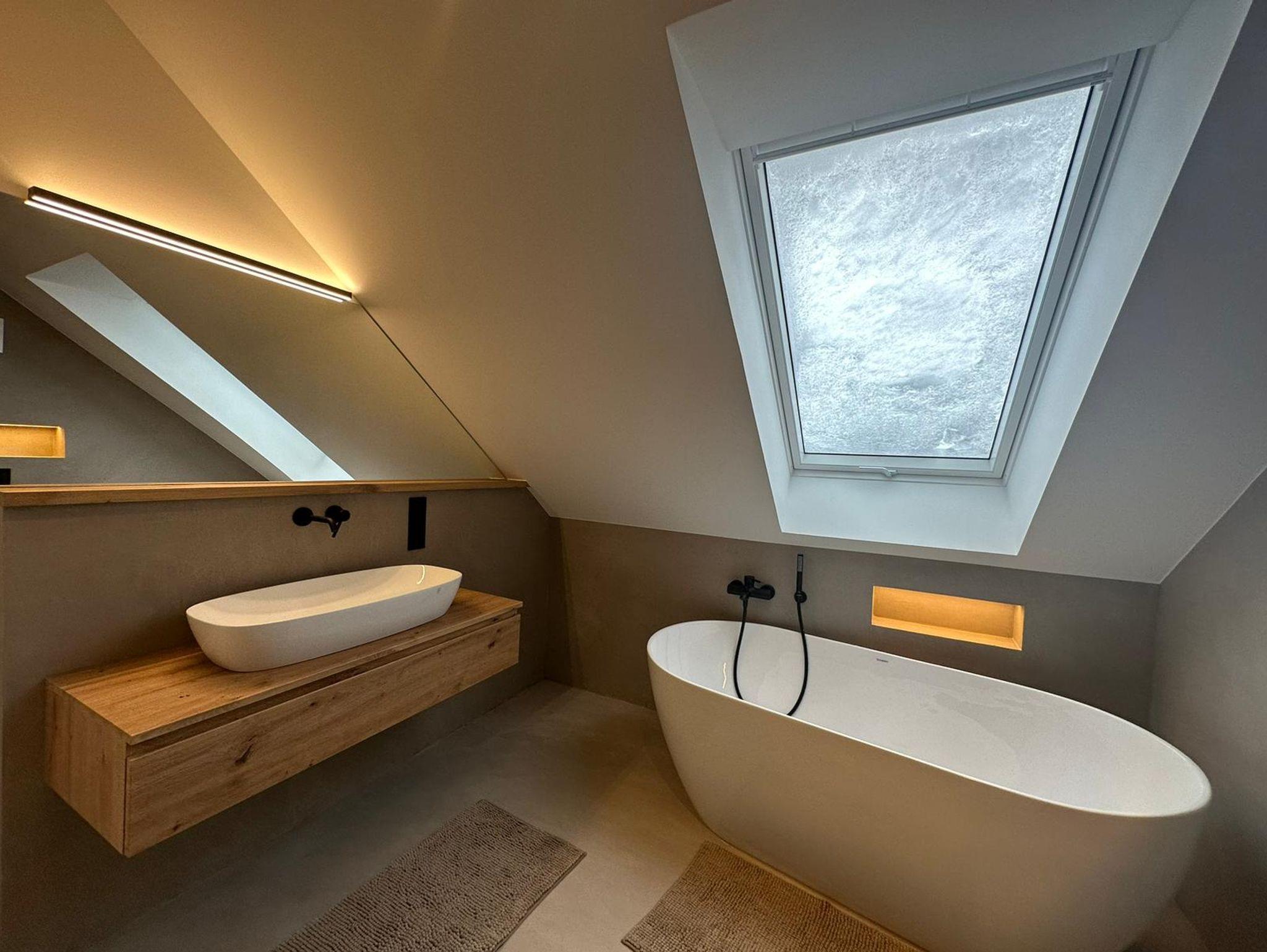 Das Bad verfügt über eine freistehende Badewanne und eine ebenerdige Dusche.