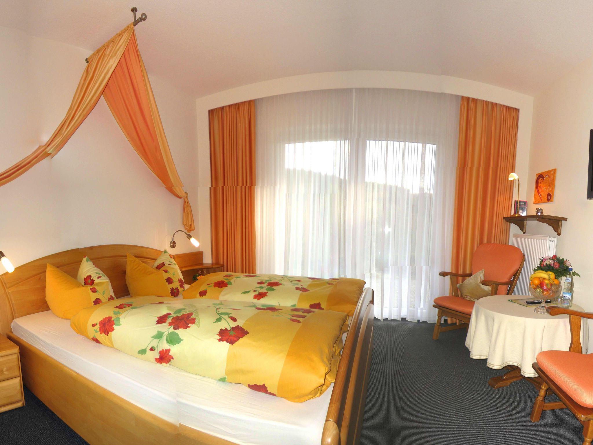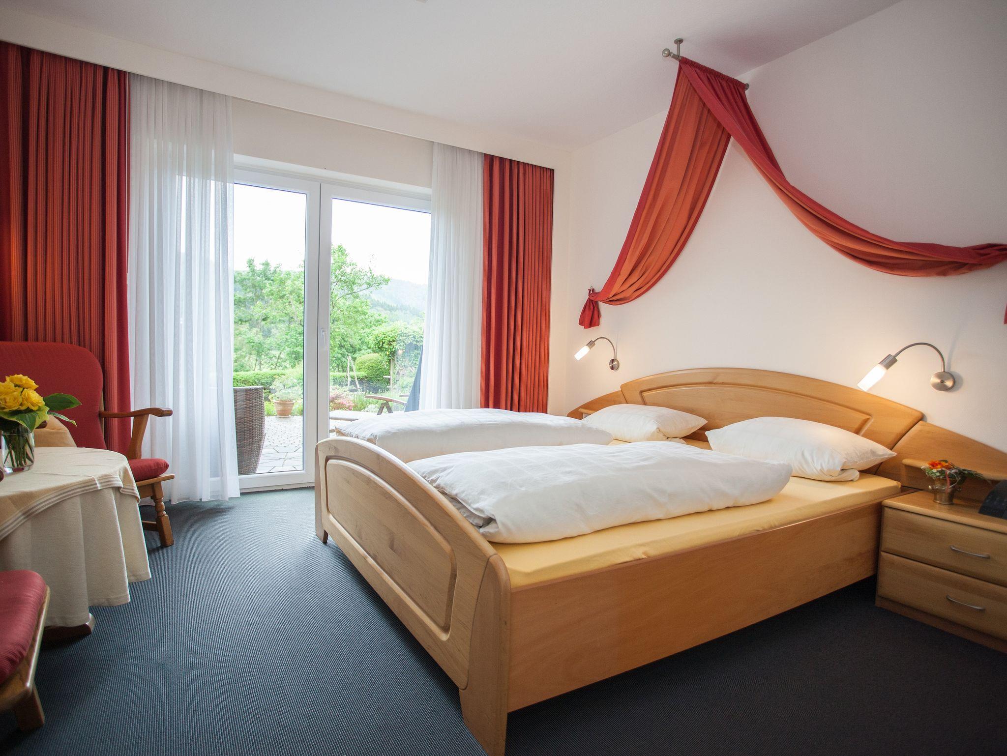 Wohnliches, ruhiges Doppelzimmer (22 m2) zur Südseite gelegen bietet einen freien Ausblick auf die Umgebung über die sonnige Terrasse zum Garten oder über den Balkon. Das Zimmer verfügt über einen Kabel-TV, einen Radio und kostenfreiem WLAN. Das Badezimmer verfügt über Dusche und WC. Bei Belegung mit 3 Personen wird ein Zustellbett zur Verfügung gestellt.