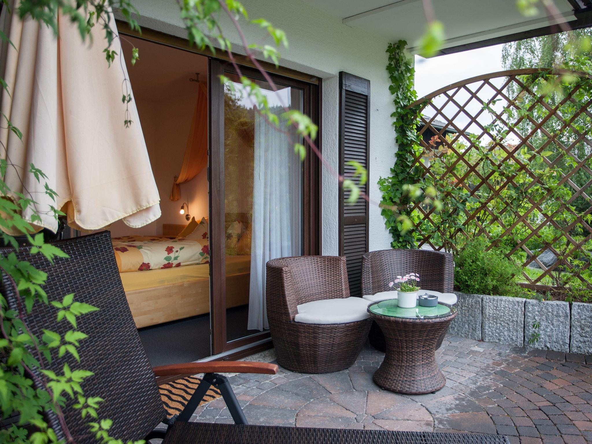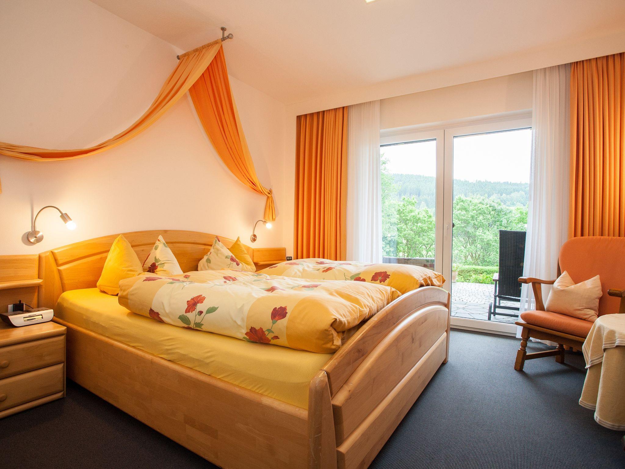 Das wohnliches, ruhige Zimmer mit Doppelbett zur Südseite bietet einen freien Ausblick vom der möblierten Terrasse auf die Sauerländer Bergwelt und verfügt über einen Flachbild-TV und ein Sofa. Das zugehörige Bad verfügt über ebenerdige Dusche und WC.