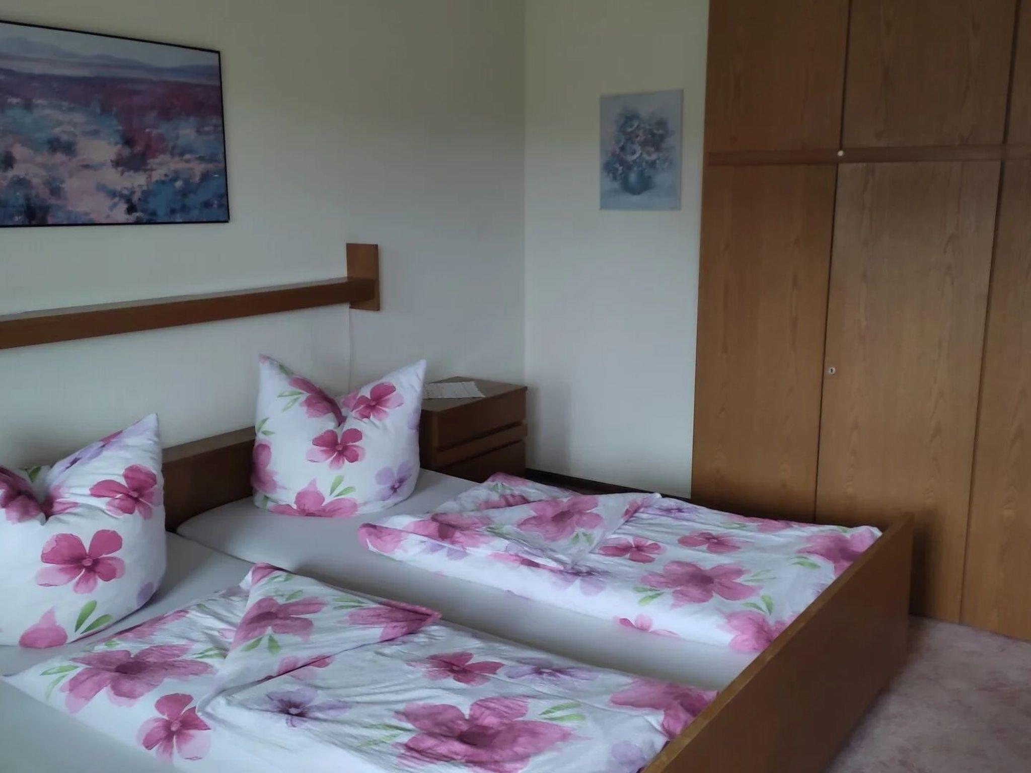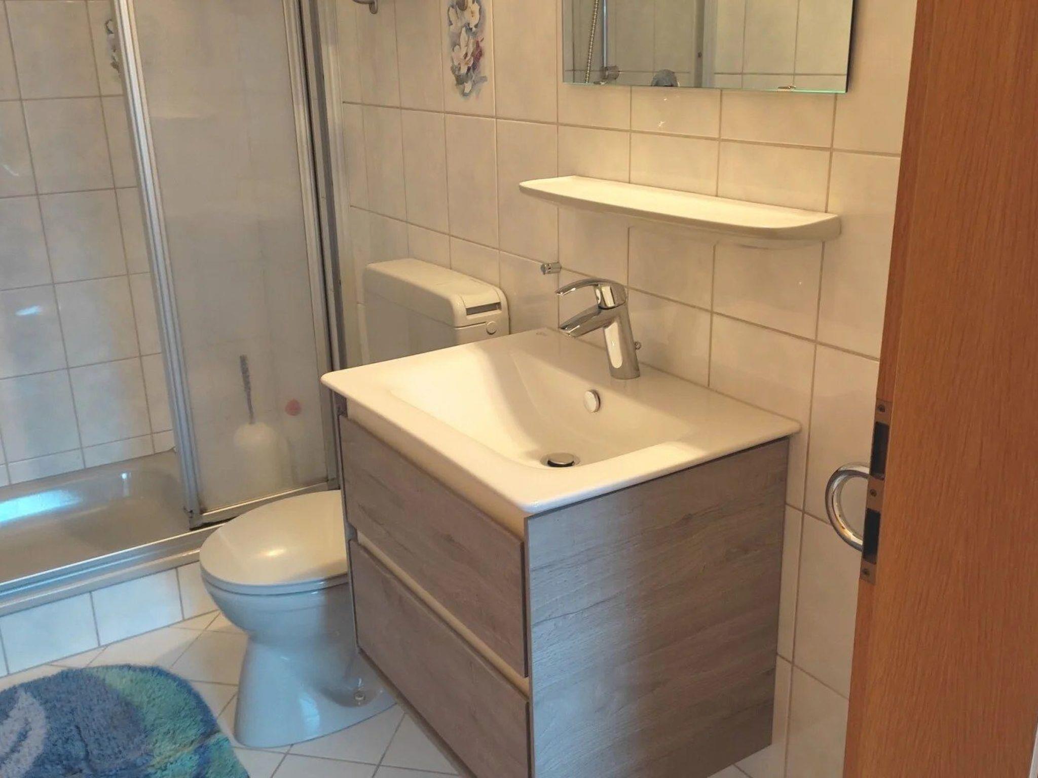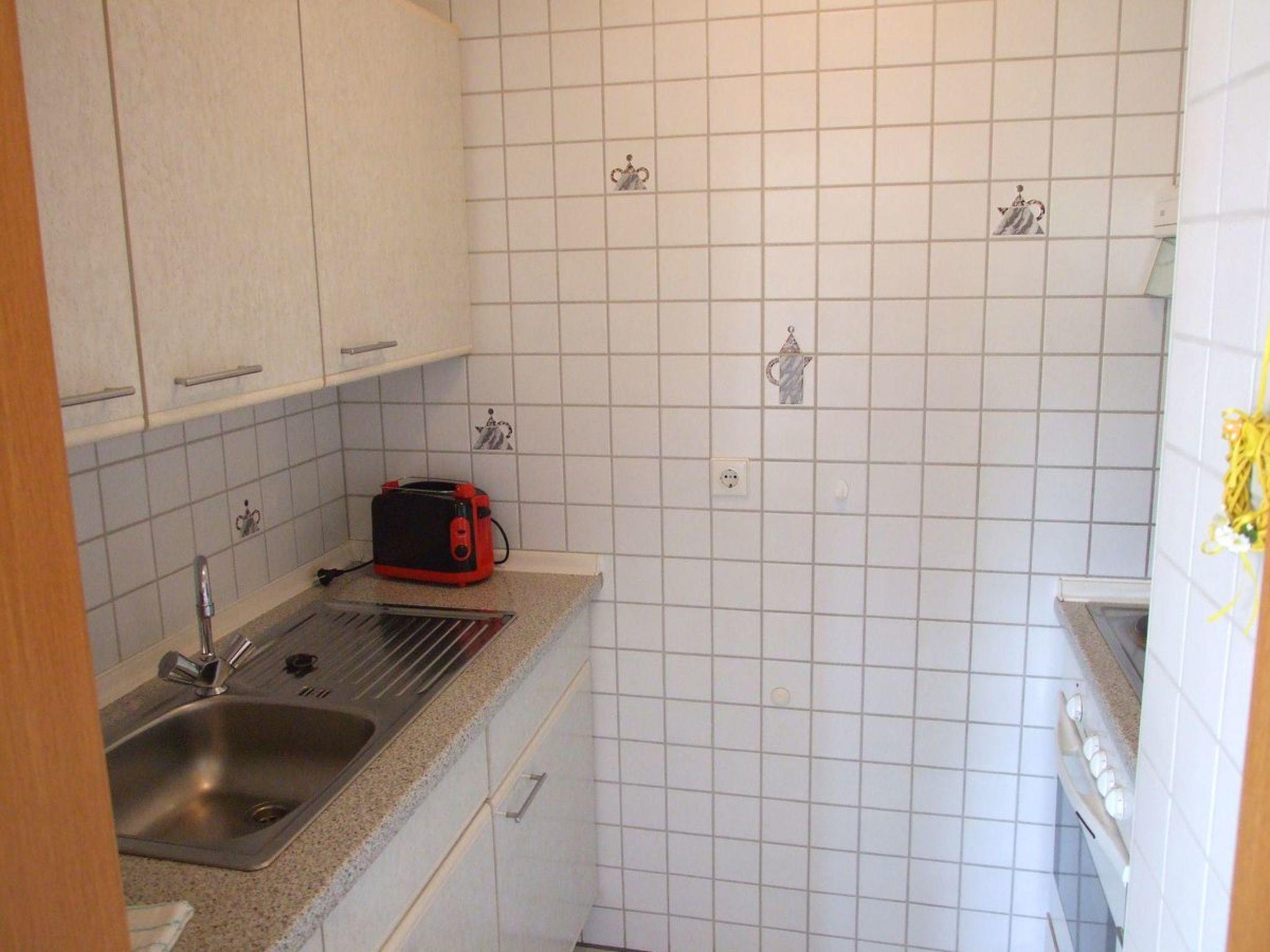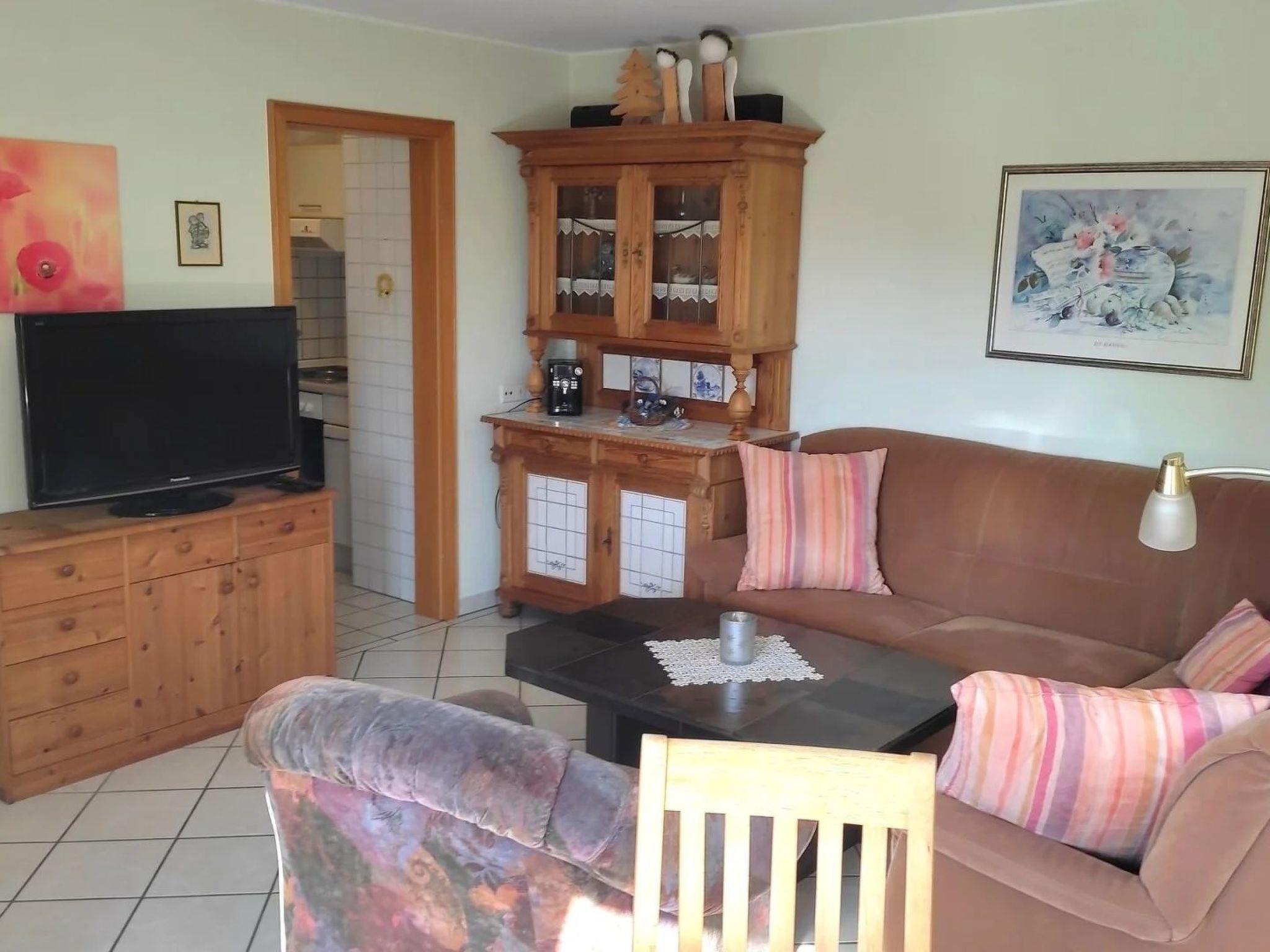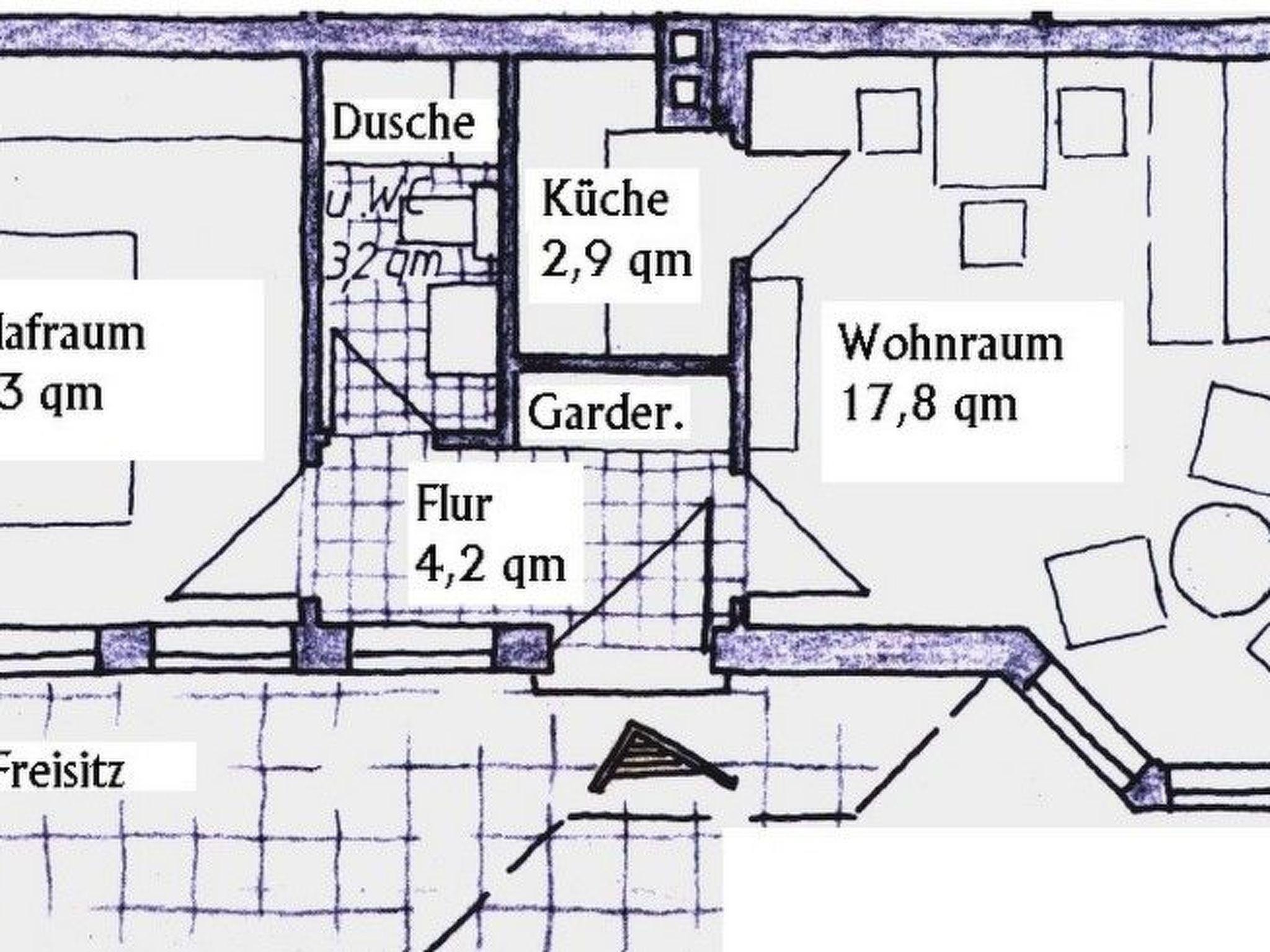 Holiday flat for up to 4 people The flat is fully equipped and furnished. It has a living-dining room with sofa bed (for the 3rd and 4th person), a small but fine kitchen, a shower room and a bedroom with double bed (2 x 2 m). The flat also has a separate entrance with a covered terrace with wooden garden furniture and cushions. The flat is non-smoking. Dogs are allowed for an additional fee. There is also a garden and a sunbathing lawn.
