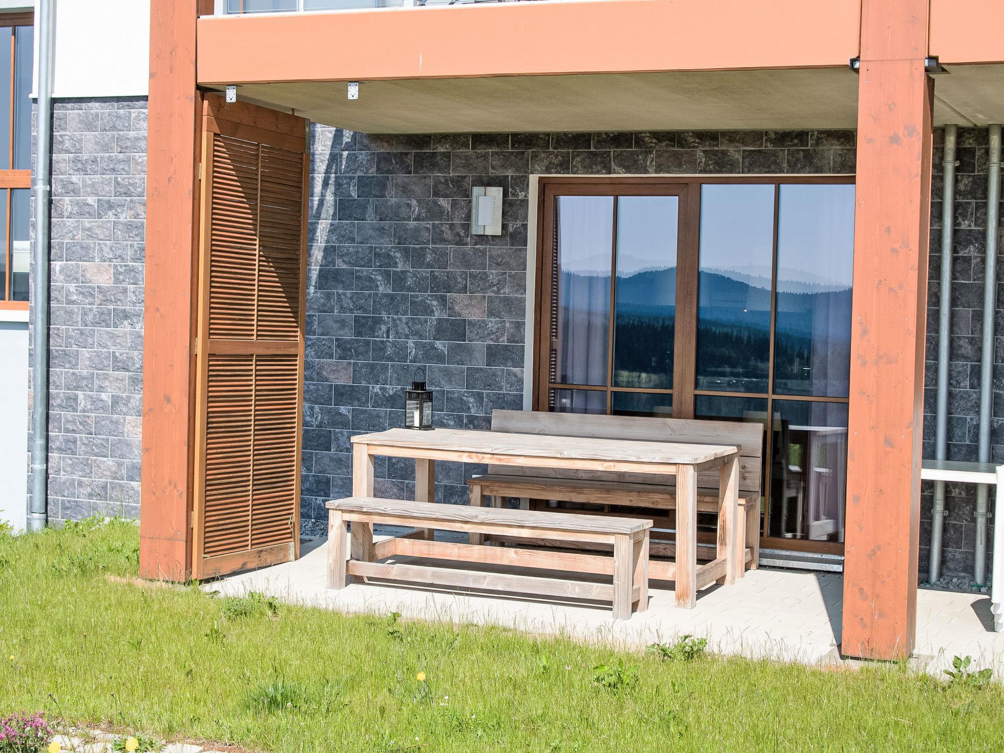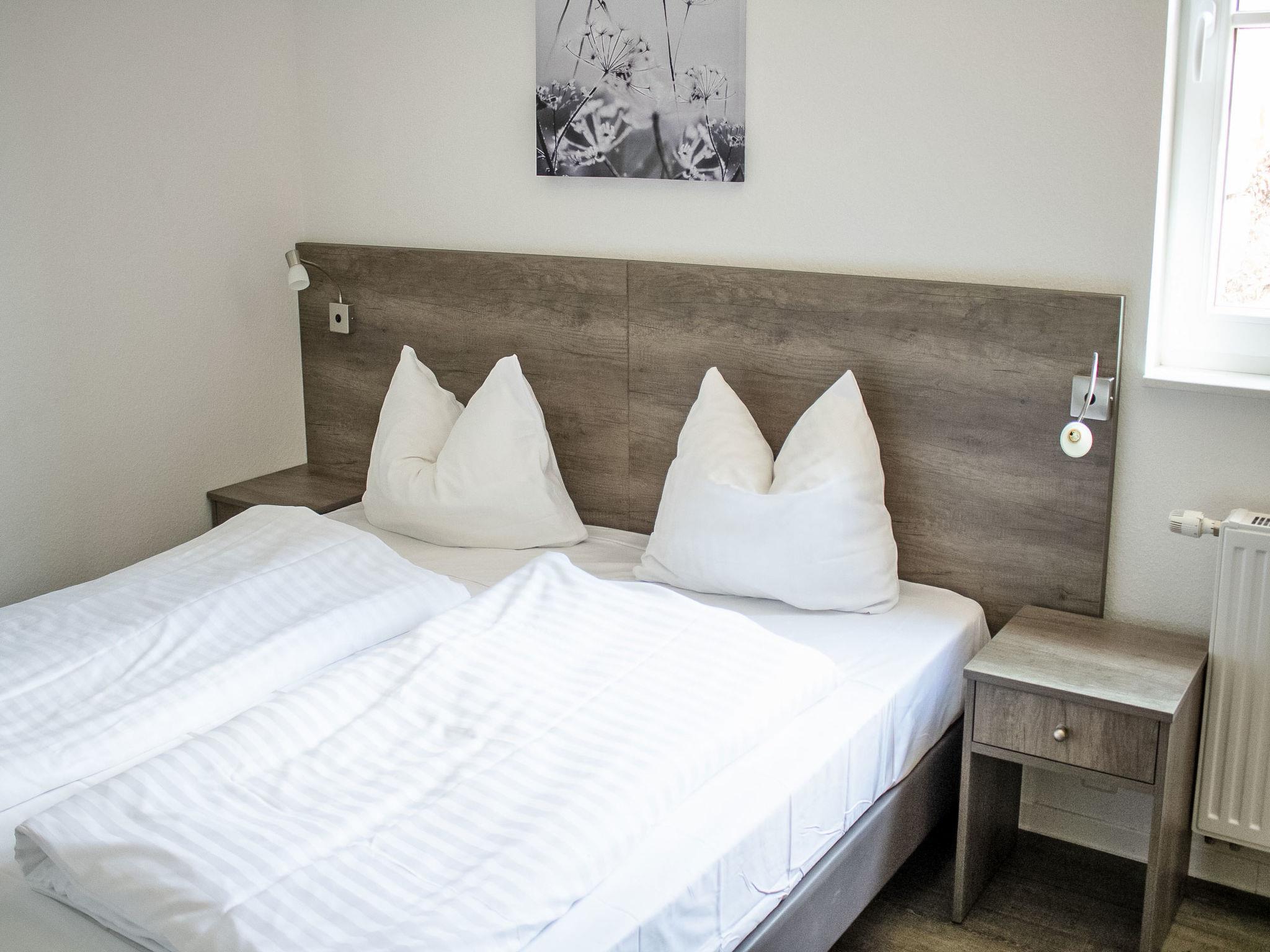 "Blick ins Grüne", 4-room apartment 105 m2, on the ground floor. Modern and cosy furnishings: living/sleeping room with 1 double sofabed and satellite TV (flat screen). Exit to the terrace. 1 room with 1 double bed. 1 room with 1 double bed. 1 room with 1 x 2 bunk beds. Open kitchen (oven, dishwasher, 4 ceramic glass hob hotplates, microwave, electric coffee machine) with dining table. 2 showers/WC, sep. WC, Sauna. Terrace. Terrace furniture. Beautiful distant view. Facilities: washing machine, children's high chair, baby cot. Internet (WiFi, free). Parking. Please note: non-smokers only. Smoke alarm, fire extinguisher.