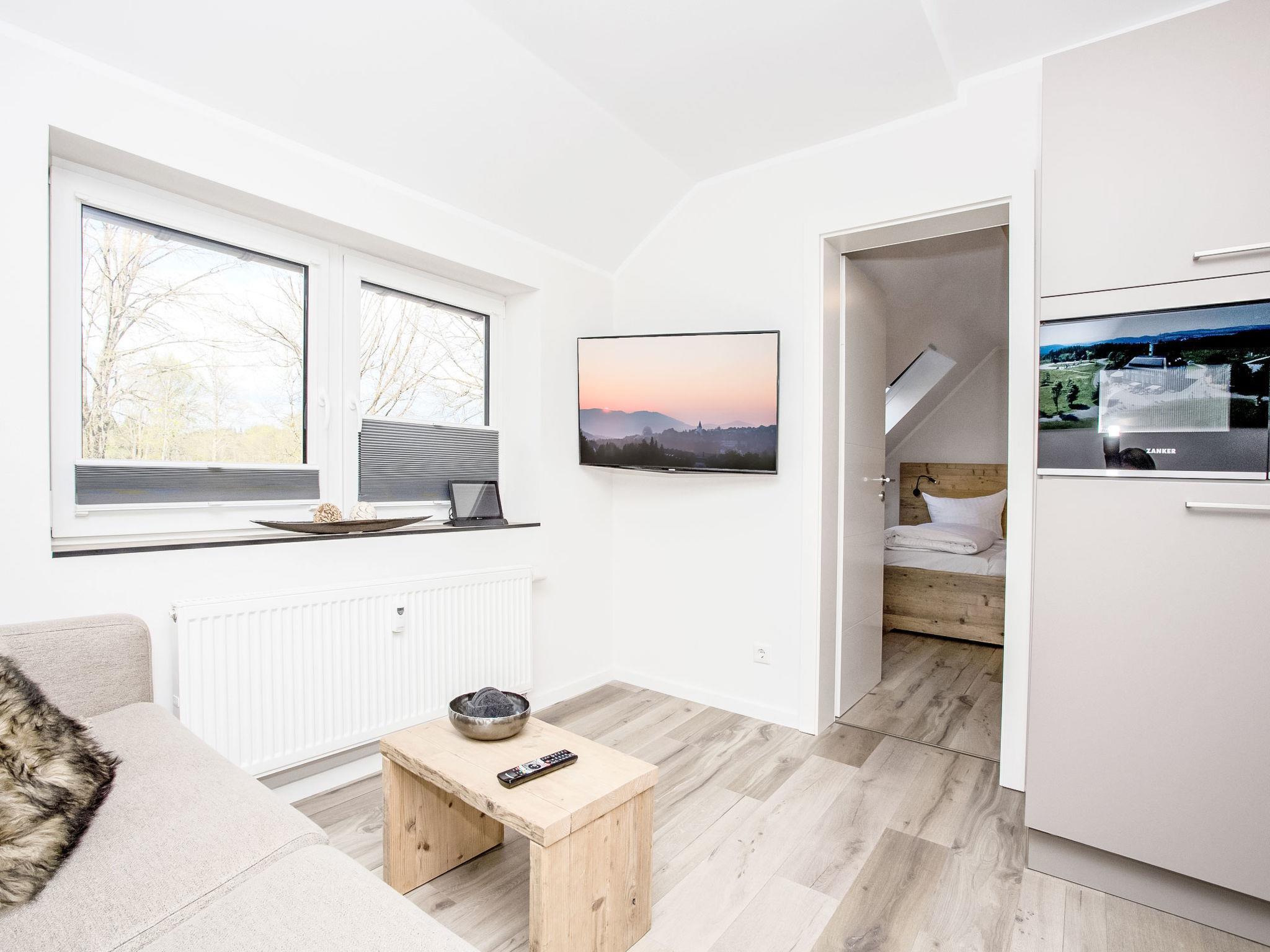 "Winterfreude", 2-room apartment 33 m2 on 2nd floor. Object suitable for 2 adults + 2 children. Cosy and wooden furniture furnishings: living/sleeping room with sloping ceilings with 1 double sofabed and satellite TV (flat screen). With sloping ceilings, 1 room with 1 double bed and satellite TV (flat screen). Kitchenette (dishwasher, 2 induction hot plates, toaster, kettle, microwave, freezer) with dining table. Shower/WC. Electric heating. Wooden floors. Facilities: Internet (WiFi, free). Please note: non-smokers only. Maximum 1 pet/ dog allowed.