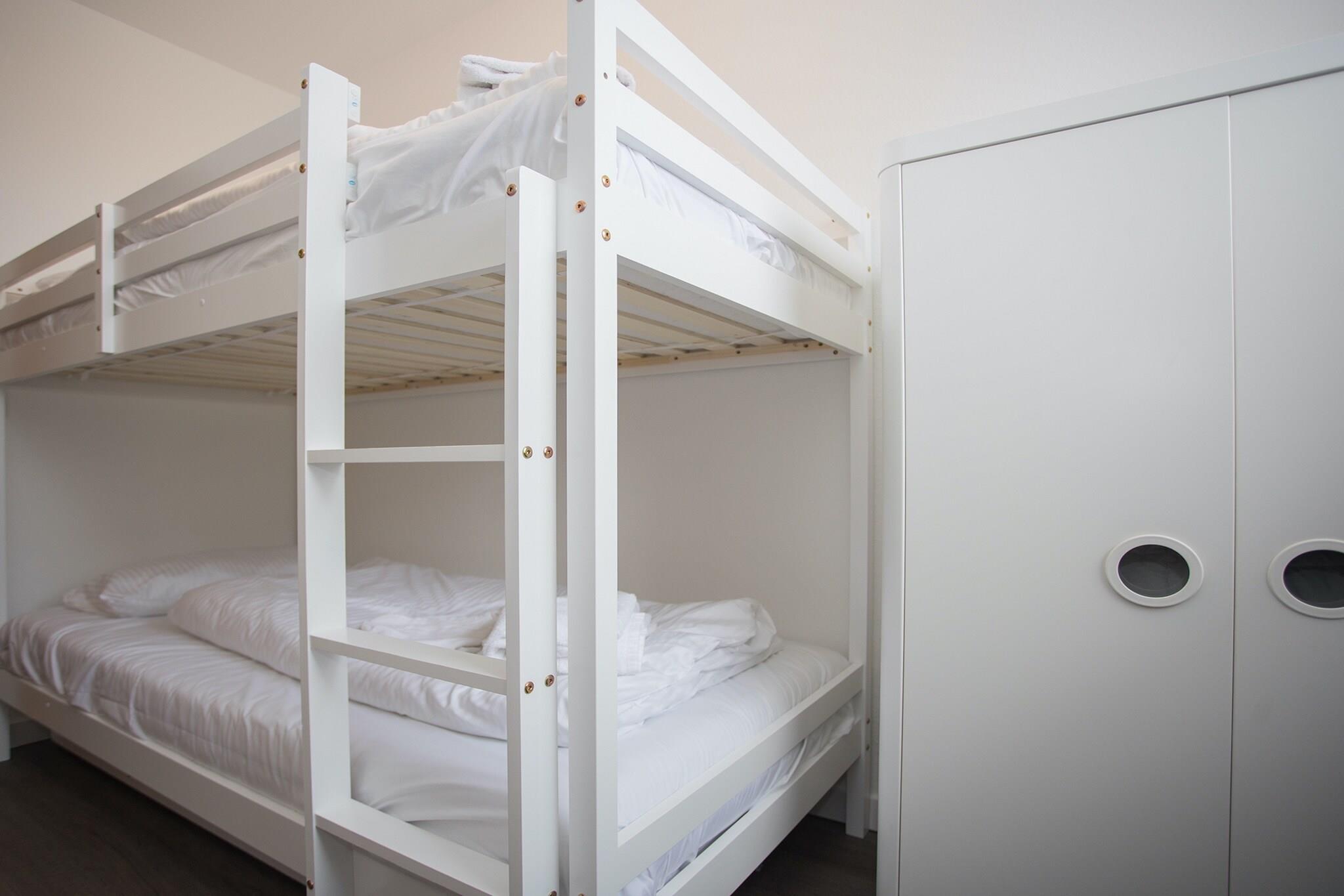 Ground floor: (open kitchen(toaster, cooker(ceramic), coffee machine(filter, pads), combination microwave, dishwasher), Living/diningroom(single sofa bed, TV(flatscreen), dining table, seating area), bedroom(double bed), bedroom(bunk bed), bathroom(shower, washbasin, toilet), Landing) cot, terrace, parking, high chair
