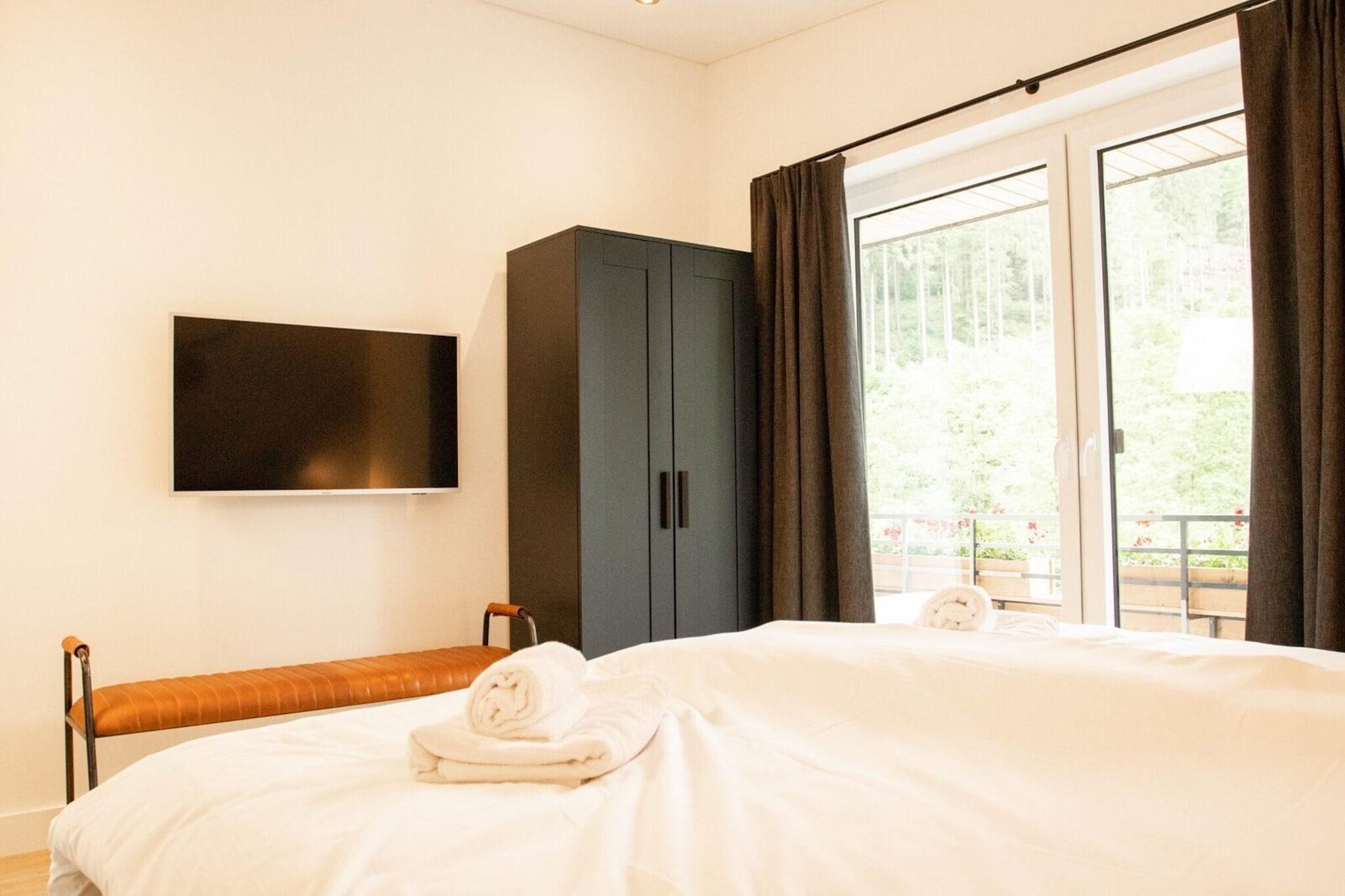 You can watch the skiers from your balcony. The cozy center of Winterberg is 10 minutes by car from this apartment. Here you are in the middle of nature! The total area of ??the apartment is 60 m2, with a living room with dining area, sofa, two armchairs, storage furniture and television. The open kitchen is fully equipped with a microwave, oven, fridge and freezer, coffee machine and kettle. The bathroom has a shower, a sink and a toilet. The bedroom is equipped with a double box spring bed and a television. The 2nd bedroom has 1 single box spring bed and a bunk bed. The residential complex is built on a mountainside, with height differences from the public road. You can reach the apartment from the outside via stairs. You then enter the central hall of the complex. The complex has a washing machine and a tumble dryer. Wi-Fi is available. There is also a large storage room where you can store your bikes. There is a charging station for electric cars 160KW. The village of Niedersfeld is a 10-minute drive from the charming winter sports resort of Winterberg. In Niedersfeld you will find several restaurants. There is a bakery, a supermarket, a butcher and a bank. There is also a go-kart track, mini golf and tennis courts in Niedersfeld. The small ski area has 3 drag lifts, ski school, ski rental and apres-ski. This apartment complex is located directly at the Am Eschenberg ski lift. The Hilliebachsee can be reached in 5 minutes by car. In summer you can swim, water ski, hike and sit in the High Five lounge cafe. There are also wonderful tours through the beautiful landscape for cross-country skiers at the Hochheide Hütte in Niedersfeld. There is a cross-country skiing area around the Kahler Asten with 120 km of connected trails. And don't forget, you can take beautiful walks right from your apartment all year round!