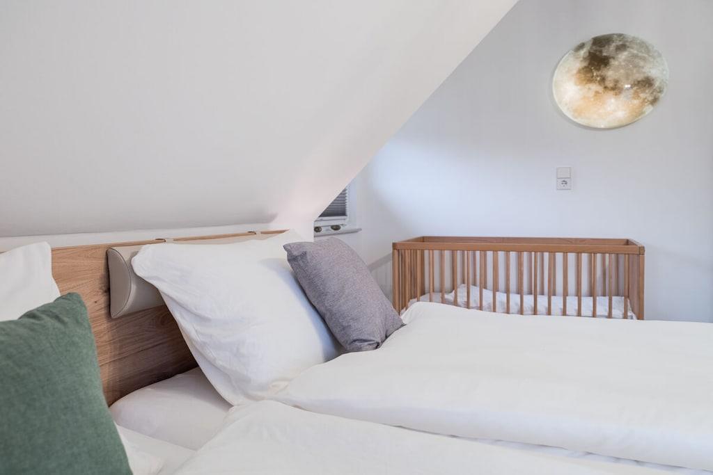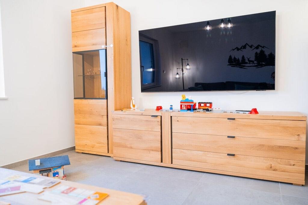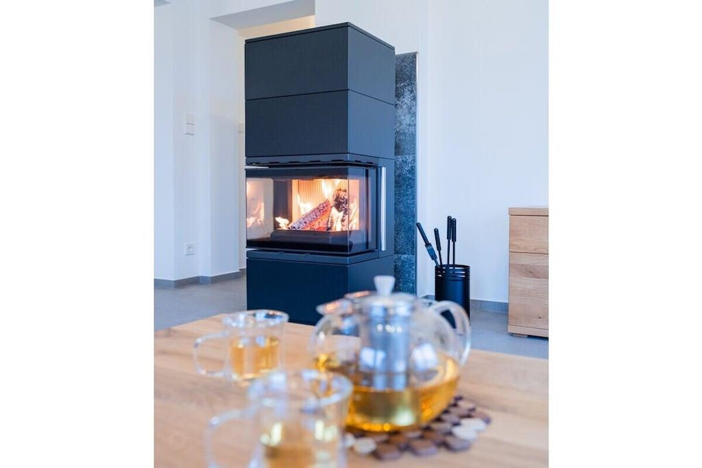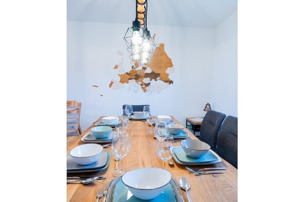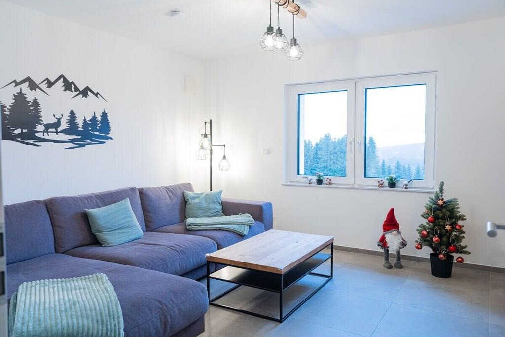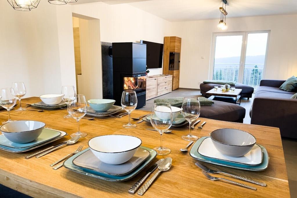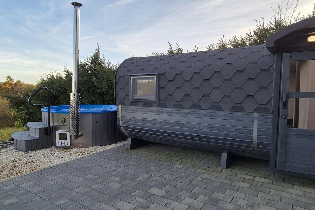 Feriehuset har plads til op til 8 personer med fire soveværelser og tre badeværelser. Stuen indbyder til afslapning, mens et andet værelse er specielt udstyret til børn med legetøj af høj kvalitet. Huset er børnesikret. To wellnessrum giver yderligere afslapning. Sengelinned, håndklæder, kaffebønner og tre kælke er inkluderet. Vi leverer en begrænset mængde brænde; ekstra brænde kan købes på stedet eller medbringes. Hele huset, inklusive wellnessrummene og haven, er til jeres eksklusive brug.