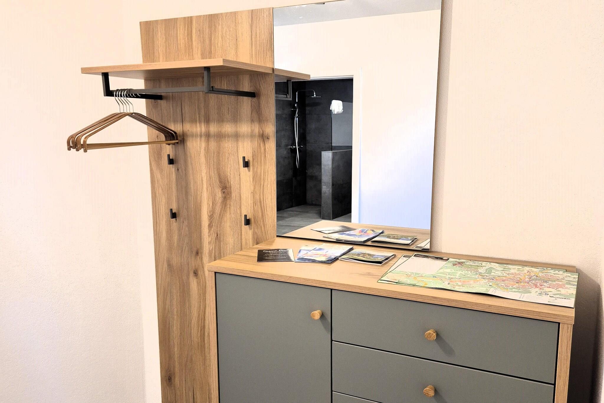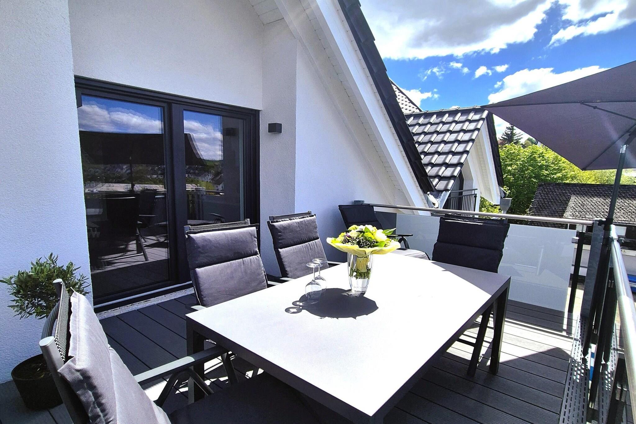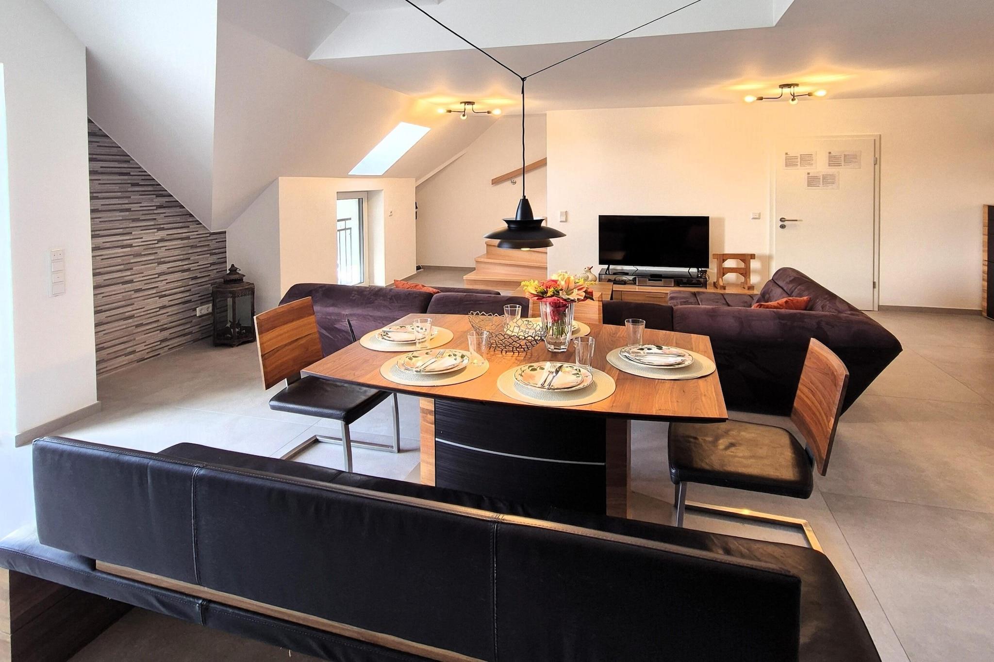 Denne lyse og stilfulde duplexlejlighed ligger roligt, men centralt i Winterberg, kun 500 meter fra skiliftens karrusel og 200 meter fra det charmerende markedsplads, og tilbyder en betagende udsigt over de nærliggende pister samt alle de bekvemmeligheder, der er nødvendige for en afslappende bjergferie. Med 90 m² plads fordelt på to etager byder lejligheden velkommen til op til fem gæster. Stueetagen har en rummelig stue-spisestue med tv, et moderne åbent køkken, der fører ud til en privat balkon, og et stort badeværelse udstyret med et handicapvenligt brusebad, toilet, håndvask og en forfriskende infrarød saunakabine. Ovenpå er der et åbent galleri, der huser et hyggeligt dobbeltværelse med et andet tv (bemærk: dette er et åbent rum), der fører til et andet dobbeltværelse og et tredje værelse med en enkeltseng - perfekt til familier eller små grupper. Gæsterne kan drage fordel af hurtig Wi-Fi og en privat parkeringsplads i den underjordiske garage, som inkluderer et sikkert opbevaringsrum til cykler, kælke, ski og støvler. Uanset om du er på pisterne, vandrer på naturskønne stier eller udforsker de lokale caféer og butikker, er alt, hvad Winterberg har at byde på, lige uden for døren.