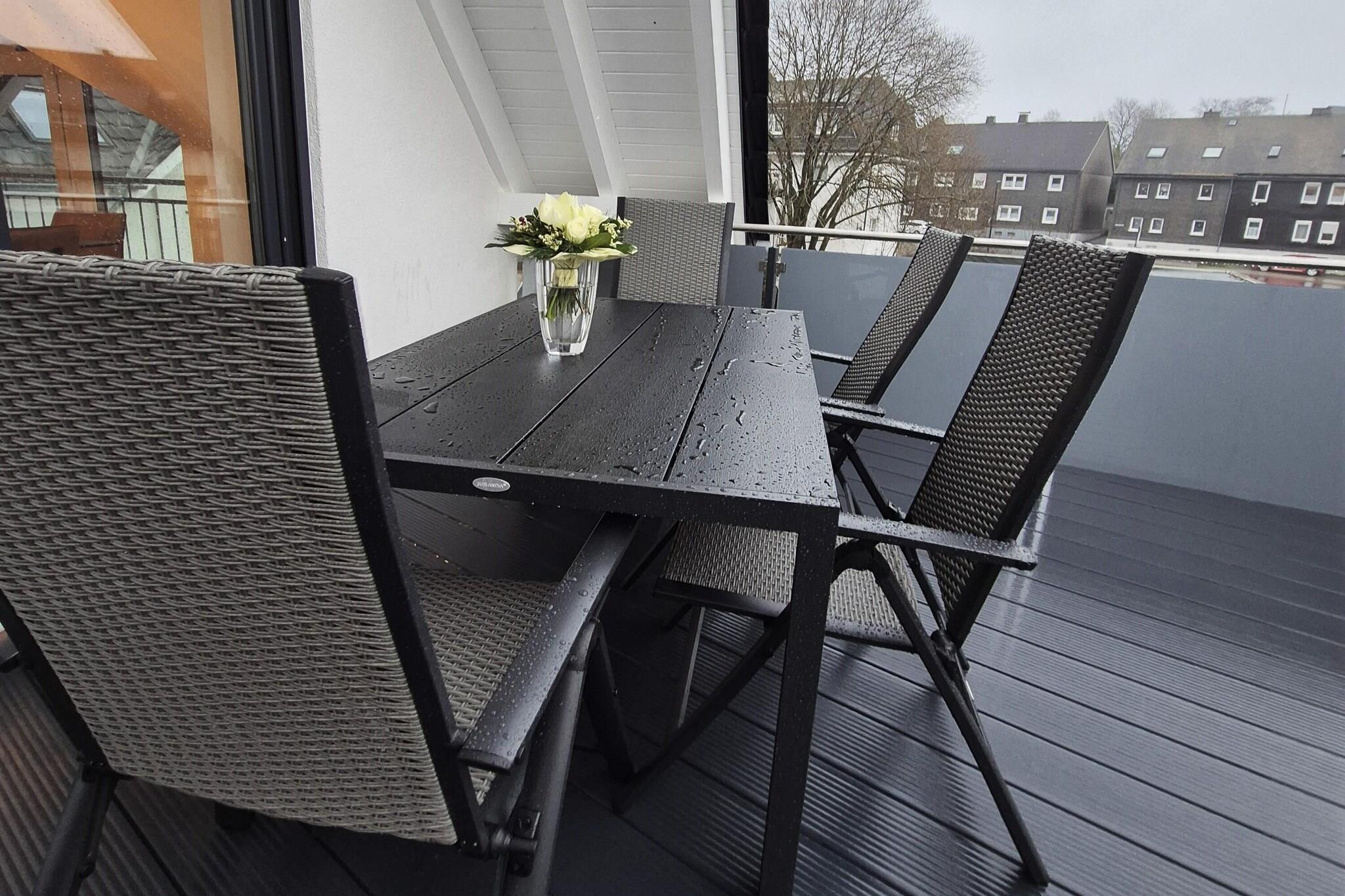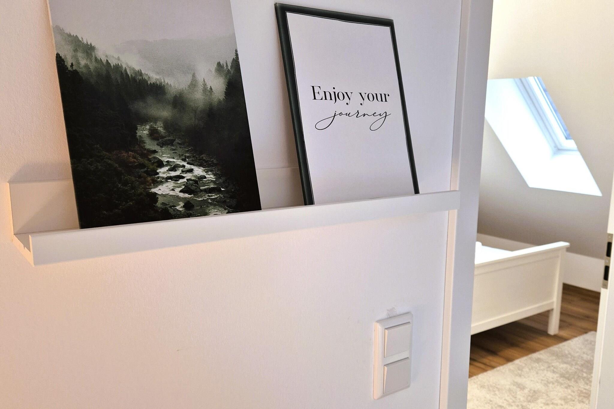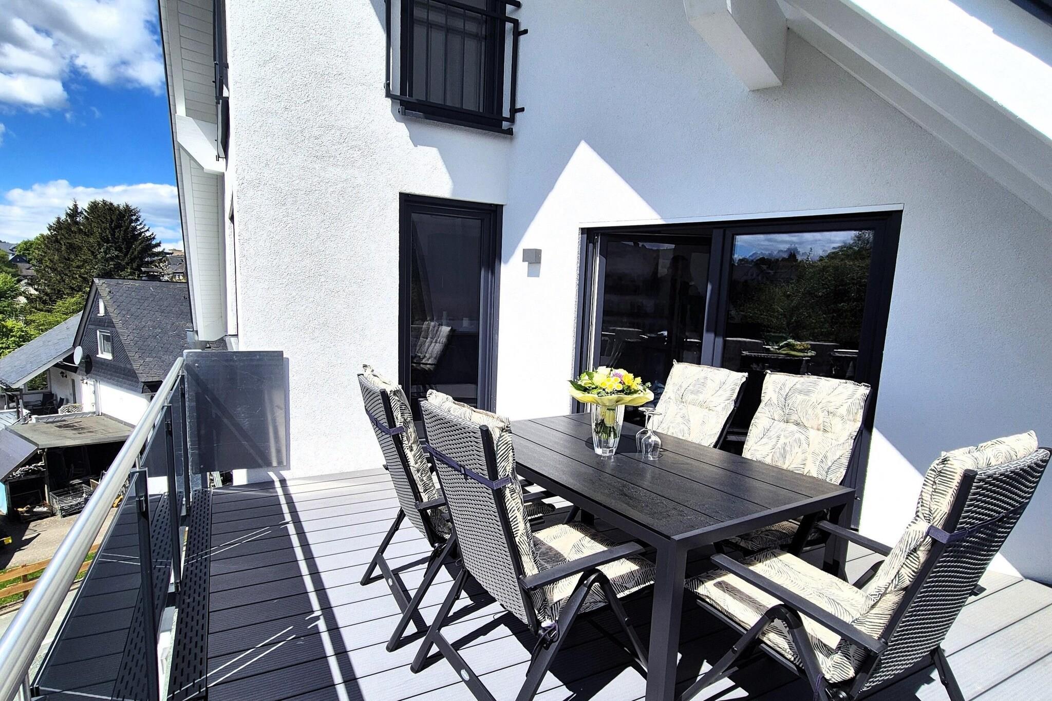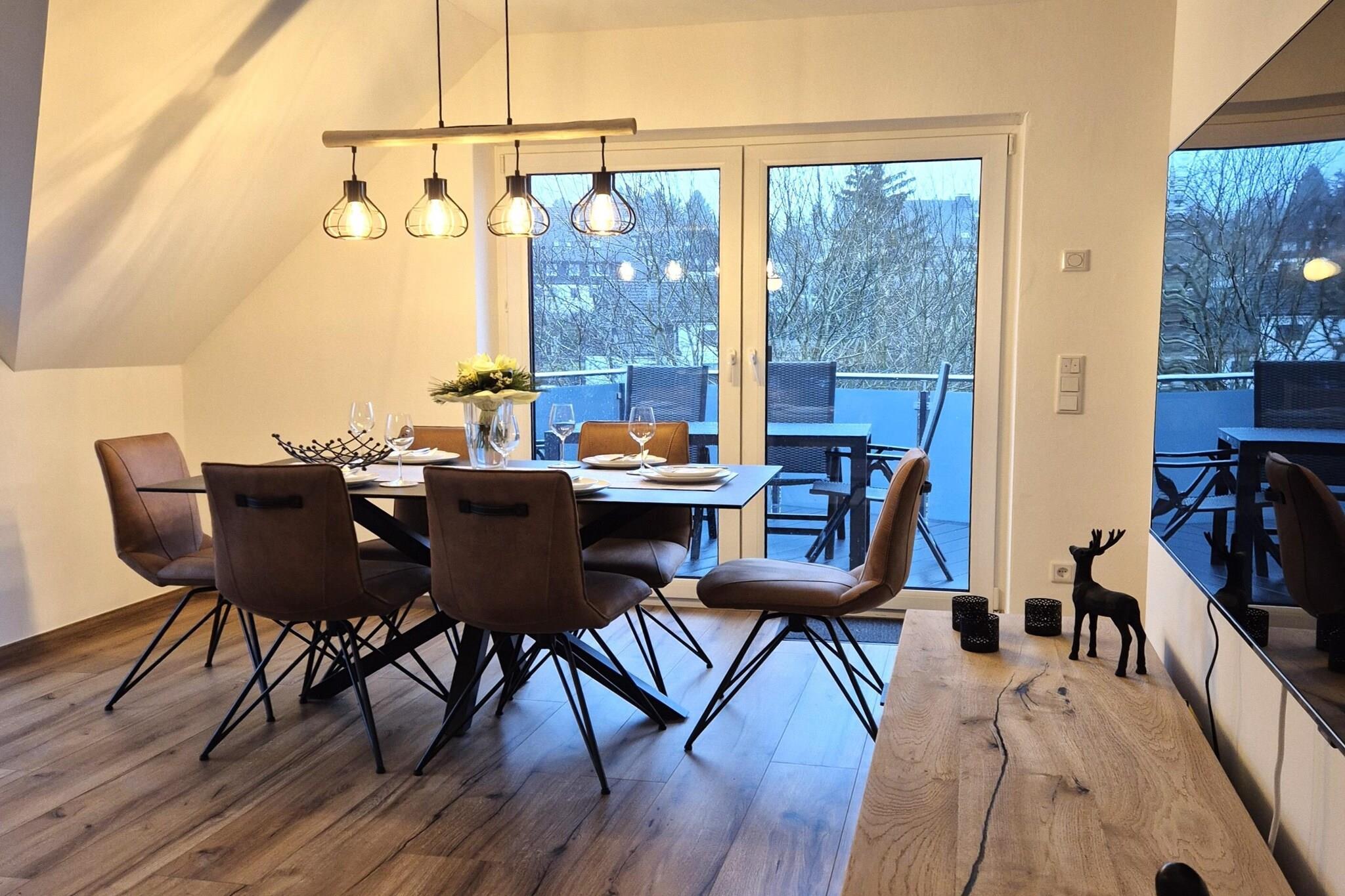 Oplev en lys og højkvalitetslejlighed i Winterberg, perfekt beliggende kun 500 meter fra skiliftkarrusellen og 200 meter fra det charmerende markedsplads. Dette rummelige feriehus på 96 m² strækker sig over to etager og tilbyder et fredeligt tilflugtssted for par, familier eller små grupper. Den nederste etage har en lys entré, en rummelig stue-spisestue med tv og et åbent køkken, der fører ud til en solrig altan – perfekt til morgenkaffe eller aften drinks. Et hyggeligt soveværelse med dobbeltseng med boxmadras, gæstetoilet og et stort badeværelse med dobbelt håndvask, badekar og handicapvenlig bruser fuldender denne etage. Ovenpå fungerer en åben galleri som et andet soveværelse med dobbeltseng med boxmadras, der er forbundet med et tredje soveværelse med enkeltseng – ideelt til et barn eller en ekstra gæst. Nyd Wi-Fi overalt, en privat parkeringsplads i kælderen og en aflåselig kælder til ski, cykler eller kælker. Udforsk Winterbergs største attraktioner, fra Erlebnisberg Kappes spændende aktiviteter til naturskønne vandre- og cykelstier, der starter lige uden for døren. Efter en dag fuld af eventyr kan du slappe af på de nærliggende restauranter eller caféer.