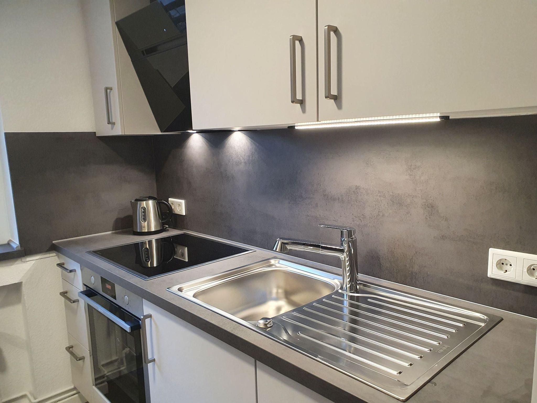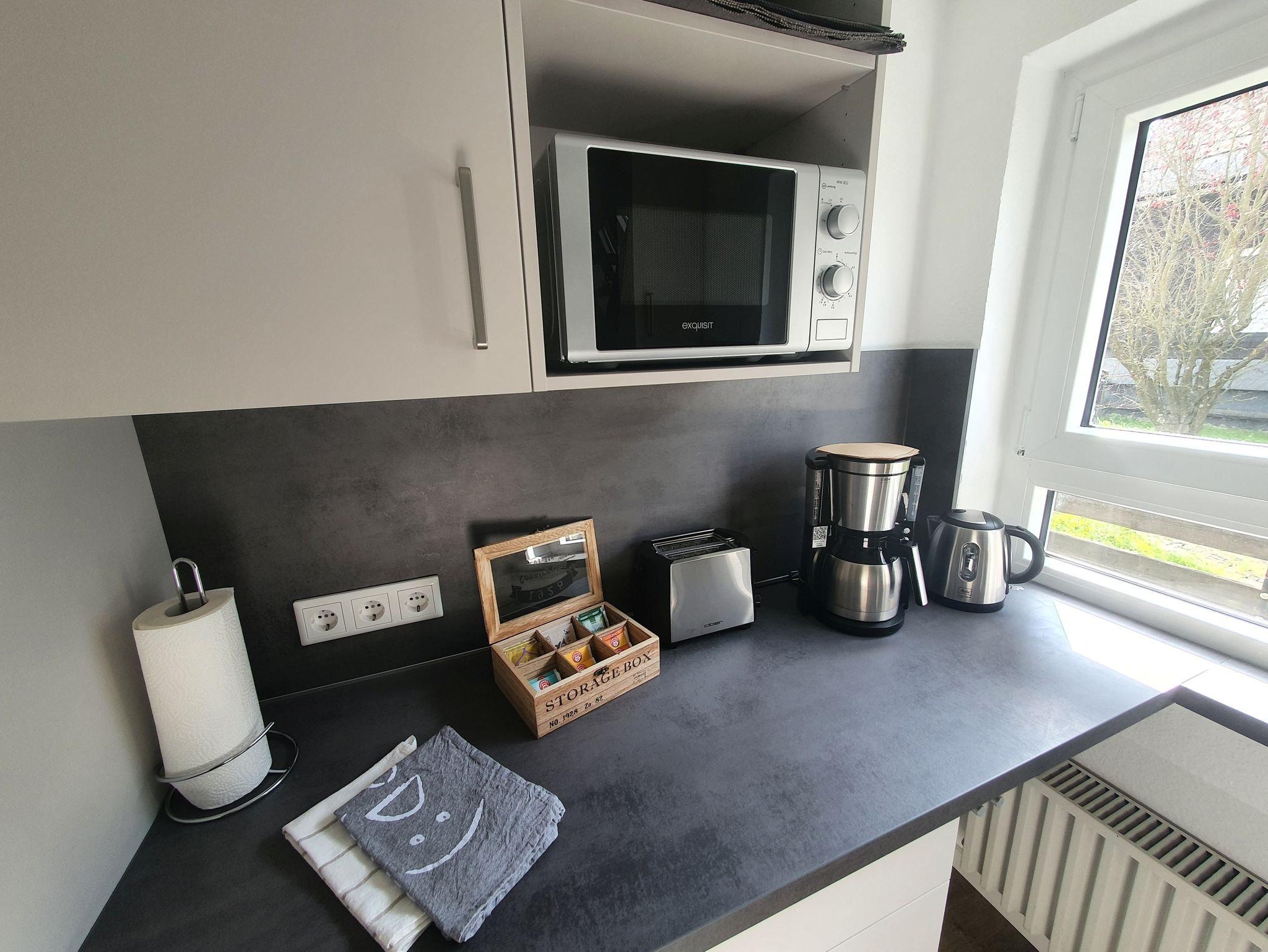 Die Küche ist voll ausgestattet mit Kühlschrank, Gefrierschrank, Induktionsherd mit Backofen, Mikrowelle, Spülmaschine, Kaffeemaschine für Filterkaffee, Wasserkocher, Toaster, Mixer mit Pürierausatz, Geschirr, Gläsern, Besteck und allen Küchenutensilien, die zum Kochen benötigt werden.
