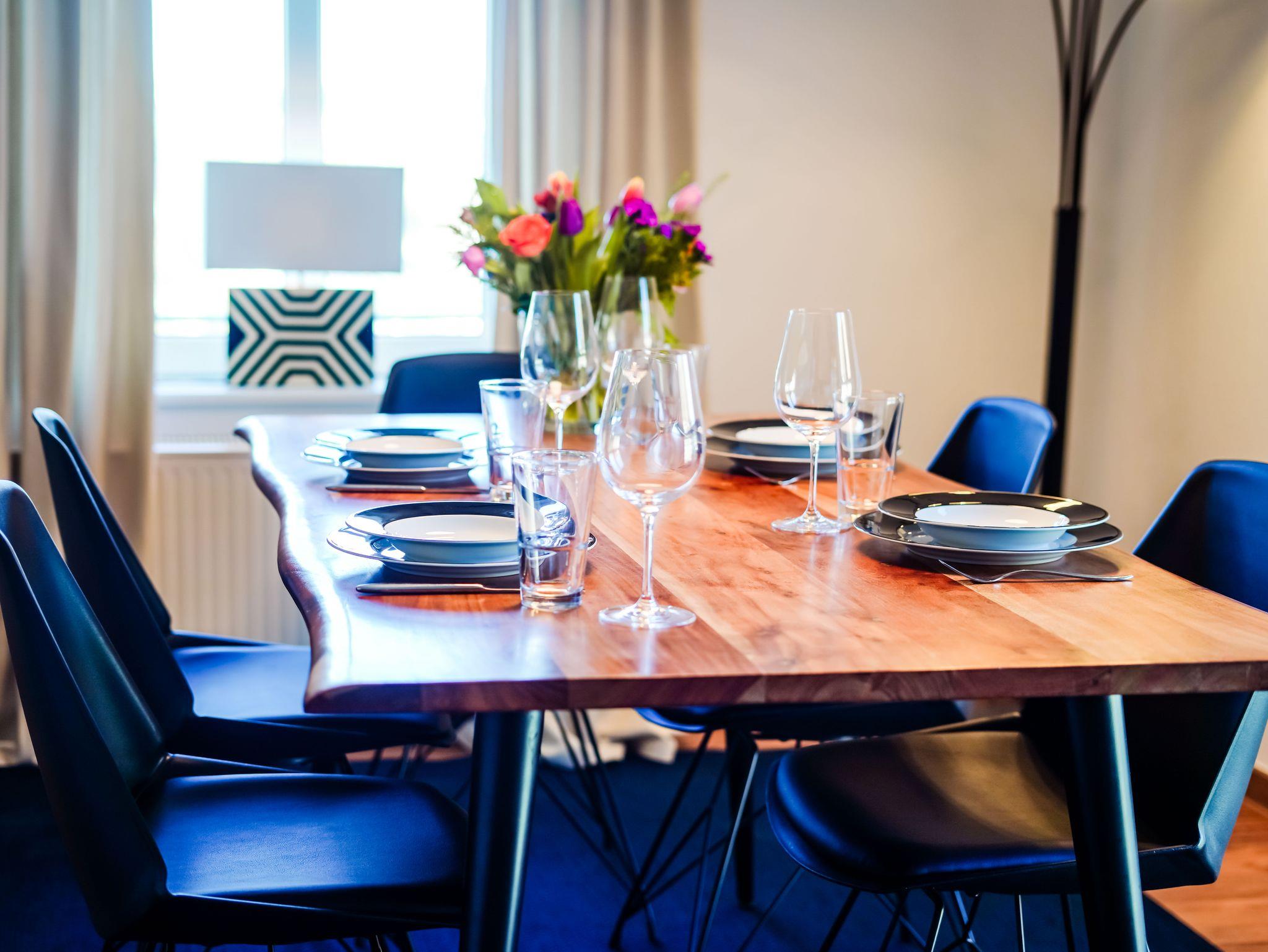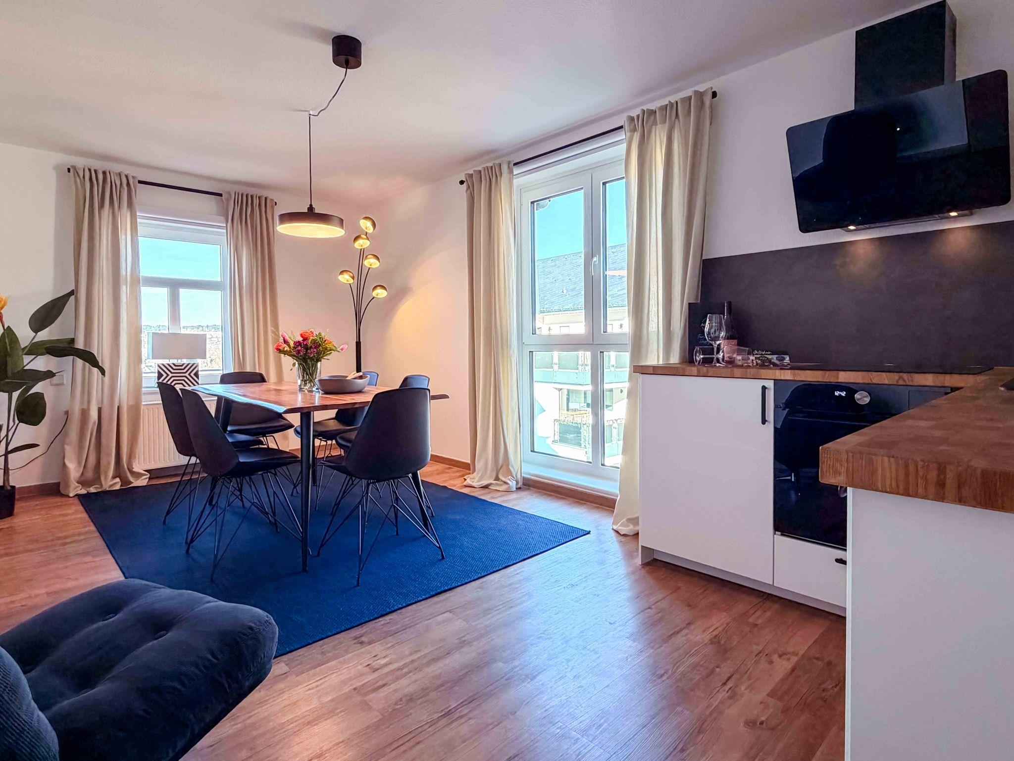 Der Wohn- und Essbereich ist offen gestaltet, modern möbliert und lädt gleichermaßen zum Entspannen wie zum Zusammensitzen ein – ob nach einem Skitag, einer Wanderung oder einem Abend in der Stadt.