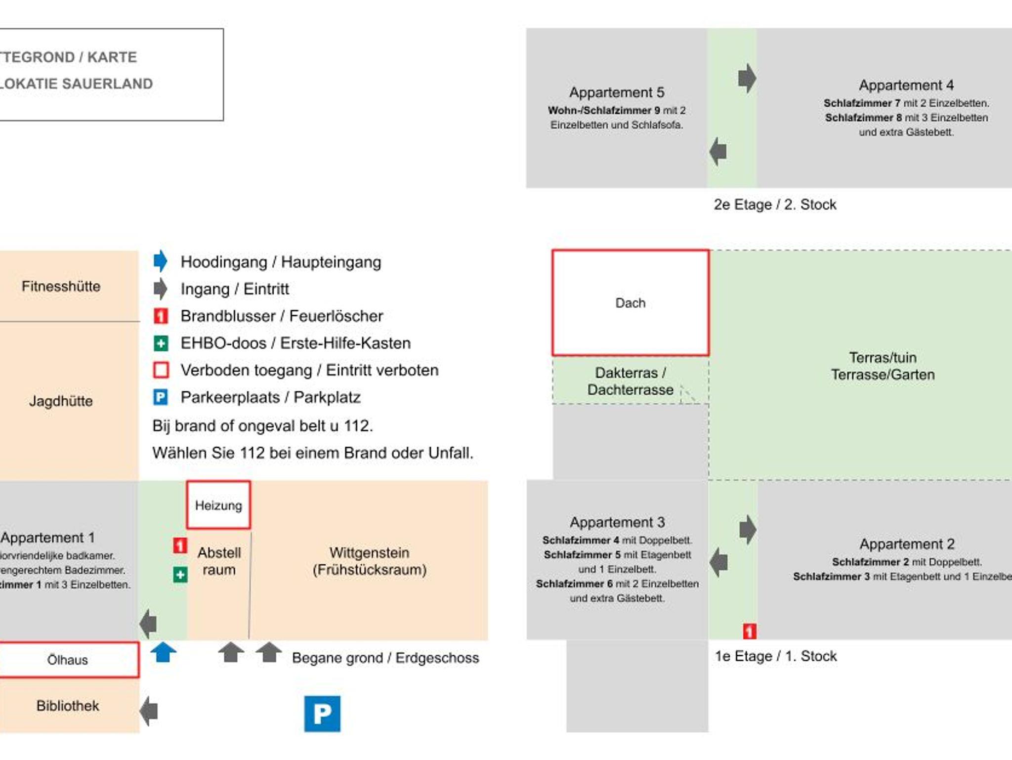 Deze accommodatie is zowel met de auto (vanaf Utrecht circa 320 km) als ook met het openbaar vervoer goed te bereiken. Deze accommodatie biedt alle faciliteiten die een vakantie- of groepsverblijf tot een succes kunnen maken. Er zijn vijf ruime, comfortabel ingerichte appartementen die liggen aan een trappenhuis. Buitenom bereikbaar beschik je nog over drie vergaderzalen en een fitnessruimte. In de buurt van deze accommodatie liggen mooie skipistes. Winterberg heeft een wereldberoemde bobsleebaan en er is een springschans maar in de andere seizoenen is er ook voldoende vertier. De wandelaar heeft in deze omgeving een enorme keuze uit talloze wandelroutes. Een bekende wandelroute is 'der Rothaarsteig', die gedurende ieder seizoen druk bewandeld wordt. Een wandeling op de hoogste berg van Noord-West Duitsland, de 842 meter hoge 'Kahler Asten' met zijn adembenemend mooi uitzicht is zeker de moeite waard. Voor mountainbike fans is Hoog-Sauerland het mountainbike-walhalla.
