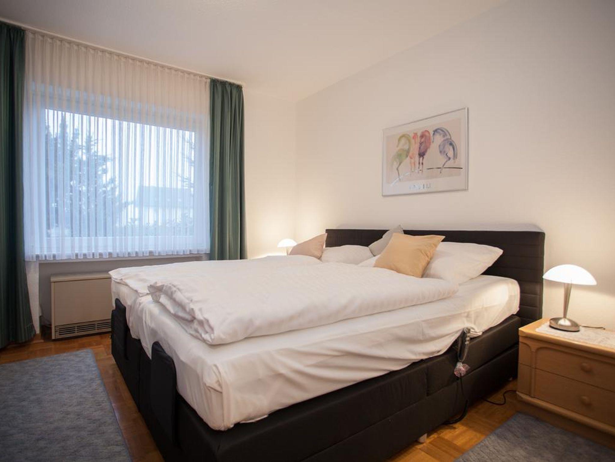 Im Schlafzimmer befindet sich ein Boxspringbett.