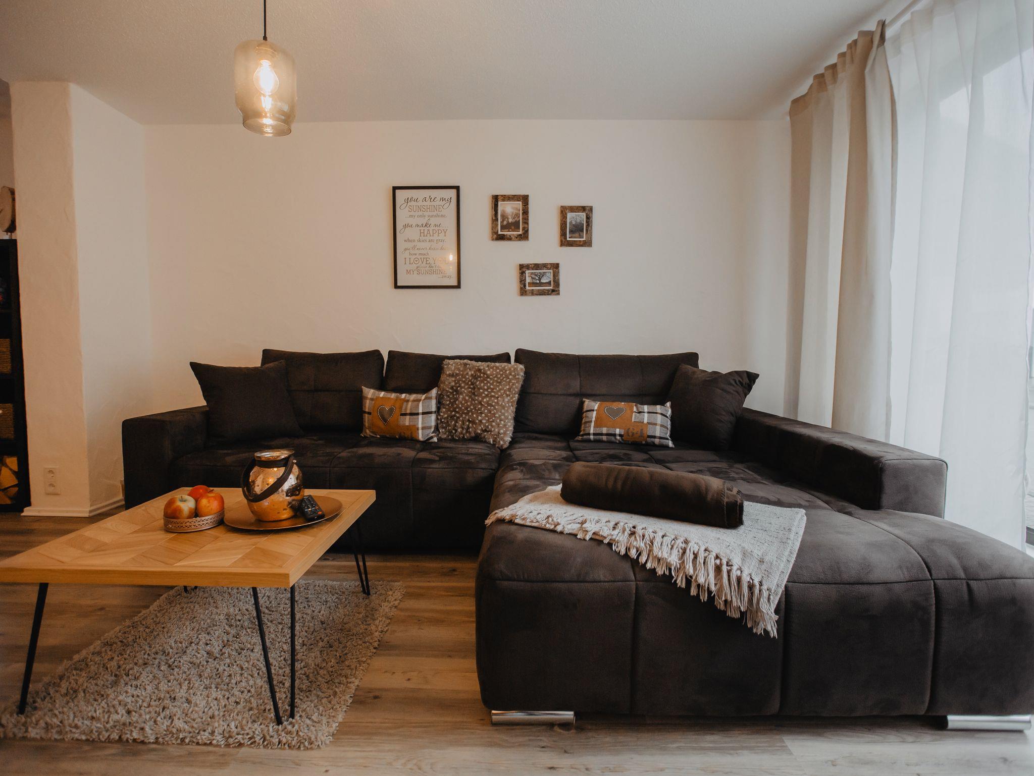 -1 gemütlichen Wohnraum mit großem Sofa und Flach TV