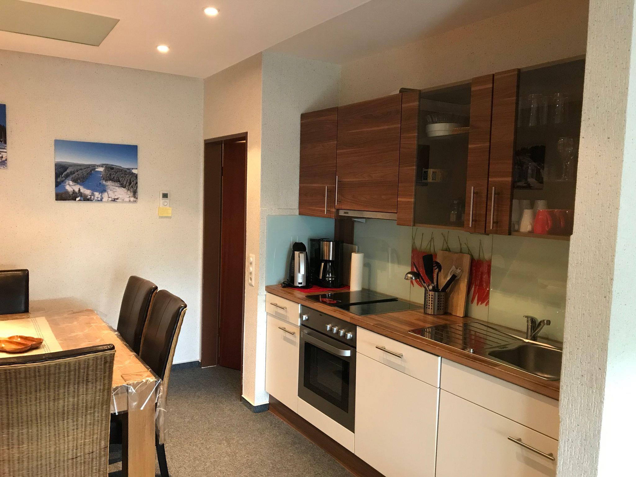 Unsere gemütliche Ferienwohnung in einem Mehrfamilienhaus in idyllischer Lage bietet alles, was Sie für einen unvergesslichen Urlaub in Winterberg brauchen. Die 60qm große Ferienwohnung bietet Platz für bis zu 4 Personen. Es erwartet Sie eine Wohnküche mit Küchenzeile und Essecke, ein kombinierter Wohn- und Schlafbereich, ein separates Schlafzimmer sowie ein Badezimmer. Die Küchenzeile ist mit Geschirrspüler, Kaffeemaschine, Kühlschrank, Mikrowelle und Toaster ausgestattet. Im kombinierten Wohn- und Schlafbereich finden Sie ein Sofa, TV, DVD-Player, und zwei Einzelbetten (Schrankbett) vor. Das separate Schlafzimmer ist mit einem Doppelbett ausgestattet. Das Badezimmer verfügt über WC, Dusche und Fön. Skier können auf dem Balkon oder in dem am Balkon befindlichen kleinen Abstellraum untergebracht werden. Kostenfreie WLAN-Nutzung und Parkplatz sind im Preis enthalten. Babybett und Hochstuhl stehen Ihnen kostenfrei zur Verfügung.