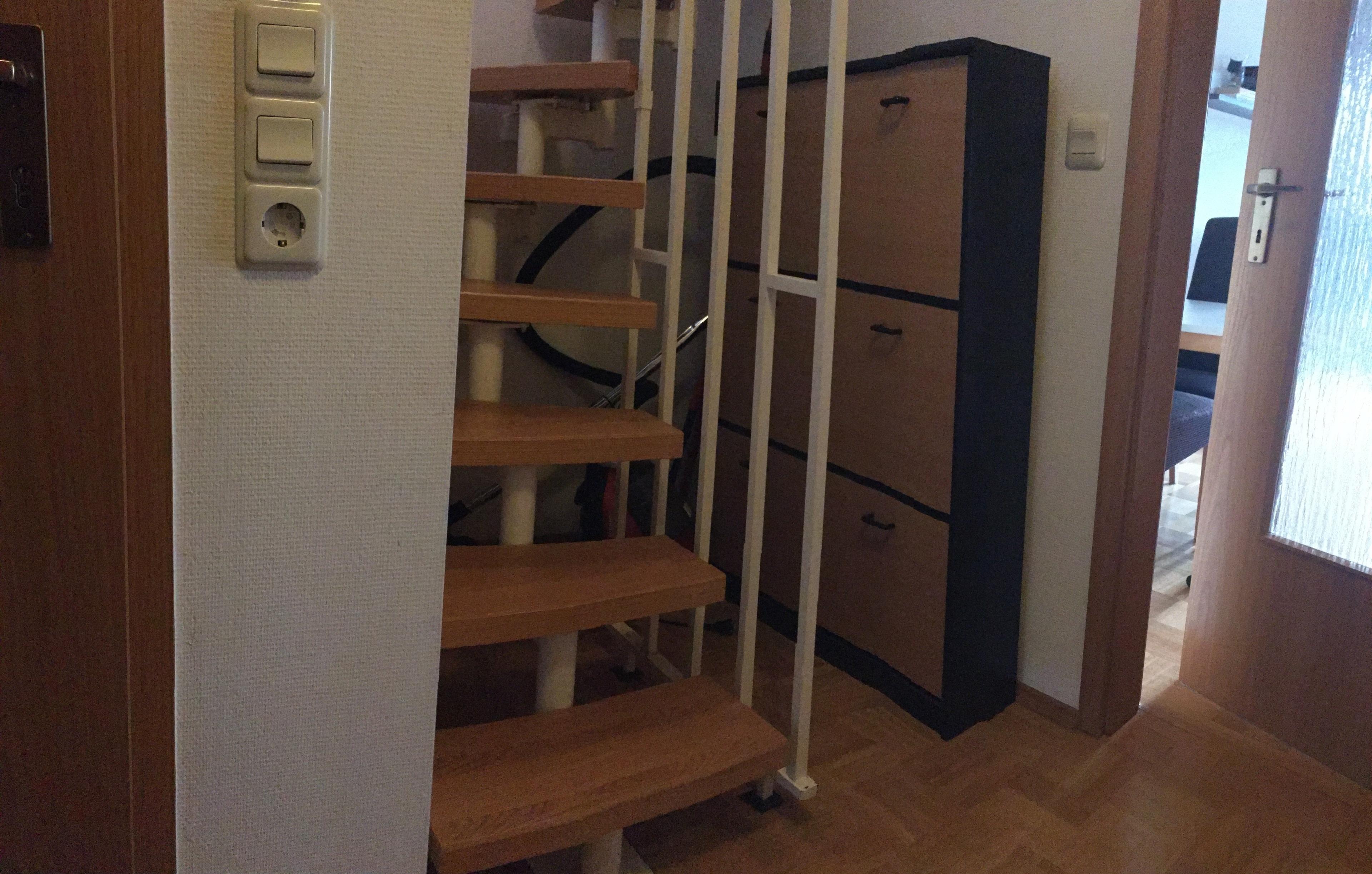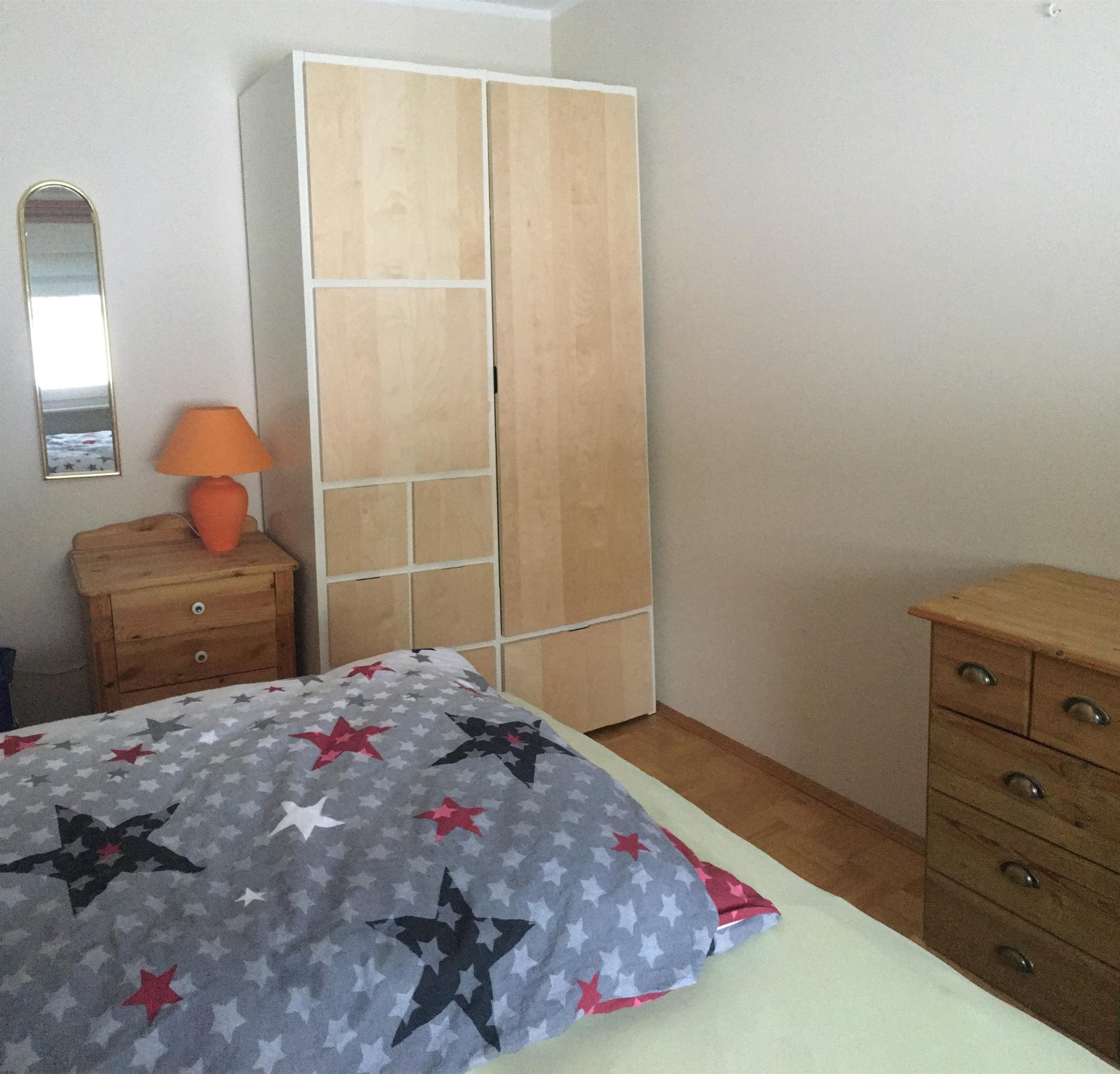 Im Schlafzimmer lädt ein Doppelbett 180x200 mit 30 cm hoher Matratze zu Boxspringbett-Feeling und erholsamem Schlaf ein. Einen geräumigen Schrank und zwei Kommoden mit vielen Schubladen gibt es auch. Eine Wendeltreppe führt nach oben in den Spitzboden.