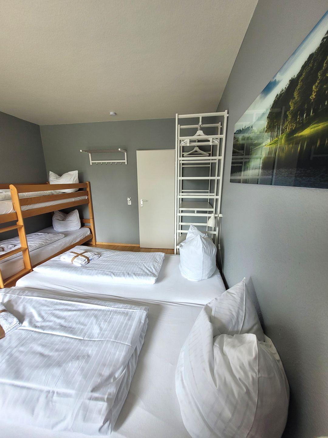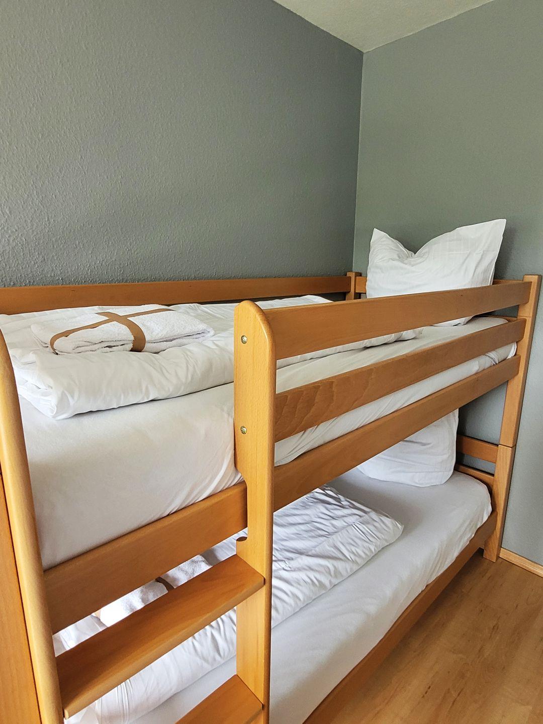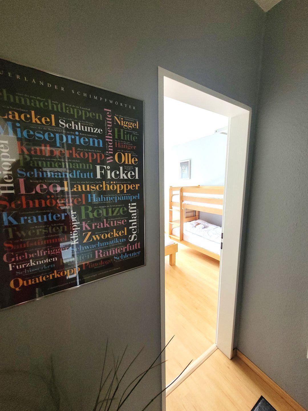 Insgesamt ca. 76 m² Wohnfläche verteilen sich auf eine großzügige Diele, ein Bad mit Dusche/WC/Waschtisch, einen Wohn-Essraum mit integrierter Küche und direktem Zugang auf den ersten Balkon sowie ein Schlafzimmer mit Doppelbett und Etagenbett mit direktem Zugang auf den zweiten Balkon. Für die 5. und 6. Person gibt es im Wohn-Essraum zwei bequeme Schlafmöglichkeiten.