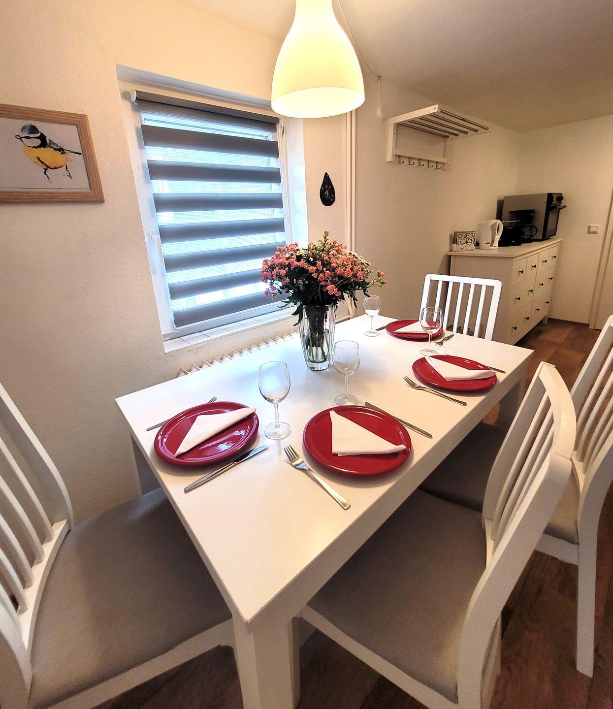 Zu dieser komfortablen Ferienwohnung gehört ein PKW-Stellplatz rechts neben dem Haus.