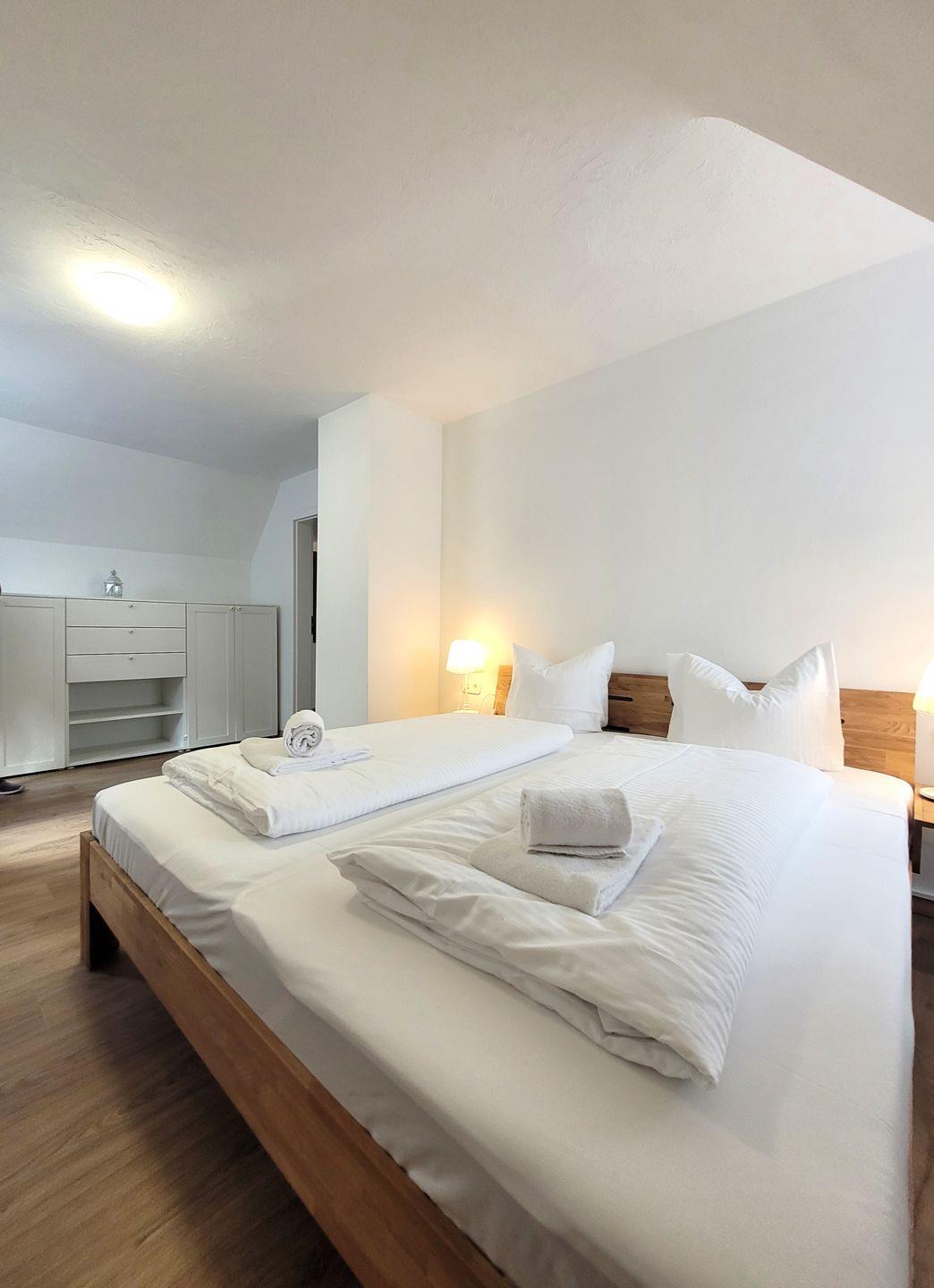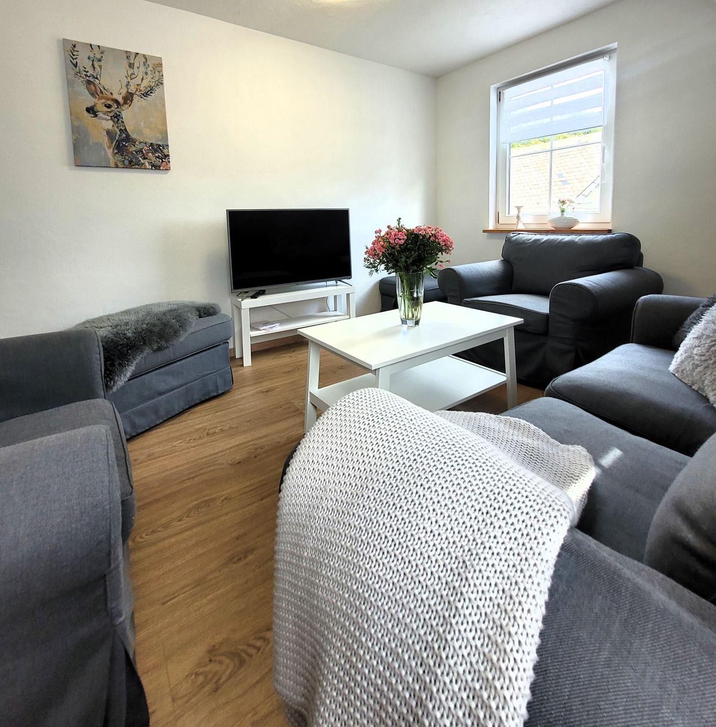 Insgesamt ca. 85 m² Wohnfläche verteilen sich auf eine Küche, ein Tageslichtbad mit Dusche/WC/Waschtisch, ein Gäste-WC, ein Wohnzimmer, ein Lesezimmer (Durchgangszimmer) und zwei Schlafzimmer, jeweils mit 1 Doppelbett und zusätzlichen Fernsehern.