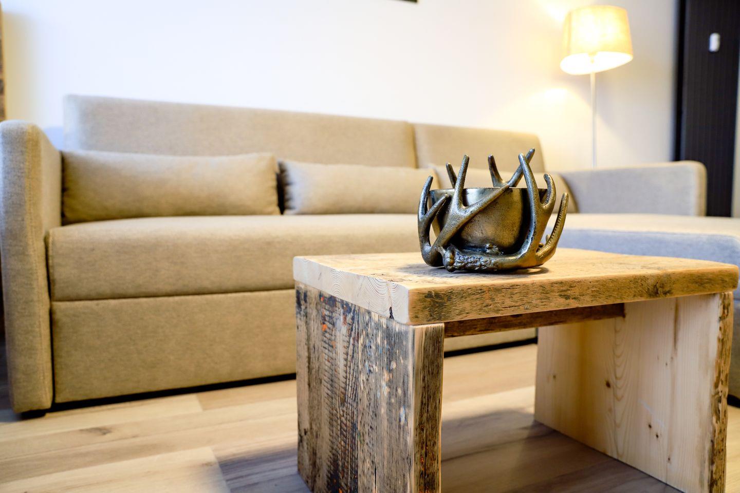 Die gepflegte Unterkunft verfügt über ein geschmackvoll eingerichtetes Wohnzimmer, das mit einem bequemen Sofa und einem Essbereich ausgestattet ist. Hier finden Sie alles, was Sie für einen angenehmen Aufenthalt benötigen: eine moderne Kochnische mit einem Herd, Kühlschrank, Geschirrspüler und Mikrofon, perfekt für die Zubereitung Ihrer Lieblingsgerichte. Ein zusätzliches Highlight ist die Espressomaschine, die Ihnen erlaubt, auch im Urlaub eine köstliche Tasse Espresso zu genießen.