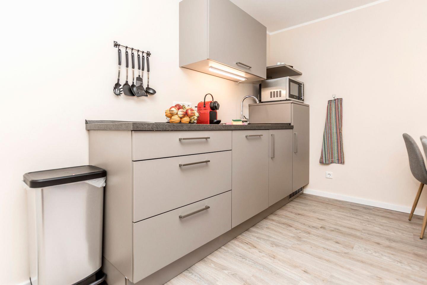- Eine voll ausgestattete Küchenzeile mit Kühlschrank, einem 2-flammiges Ceranfeld, einem Backofen, einer Spülmaschine, sowie eine Filterkaffeemaschine, einem Wasserkocher mit einer Auswahl an Teesorten und einem Toaster.