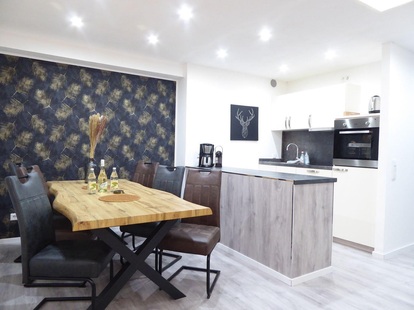 Die Küche ist vollausgestattet. Ihr verfügt über eine normale Kaffeemaschine, eine Nespressomaschine, Toaster, Wasserkocher, Backofen, Herd. Wir haben ein kleine Willkommenspaket für euch bereit gestellt darin befinden sich Kaffee Tee, Milch, Zucker und Nespressokapseln.