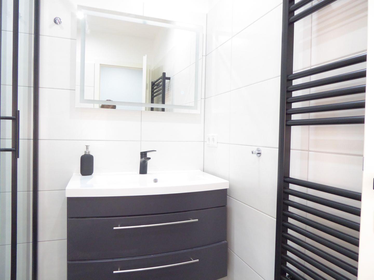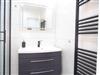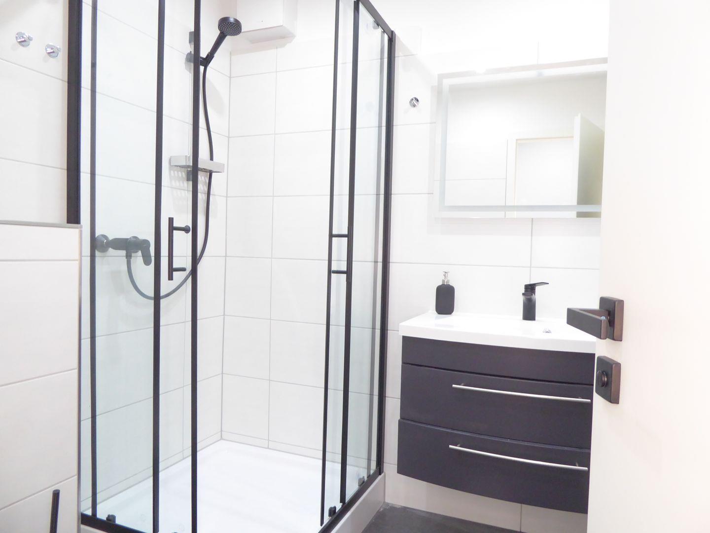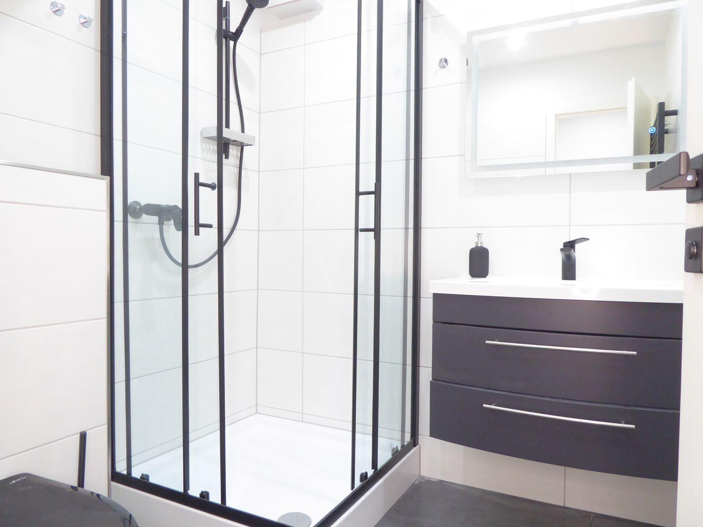 Das Badezimmer ist komplett neu gefliest und verfügt über eine Dusche ein WC und ein Waschbecken.