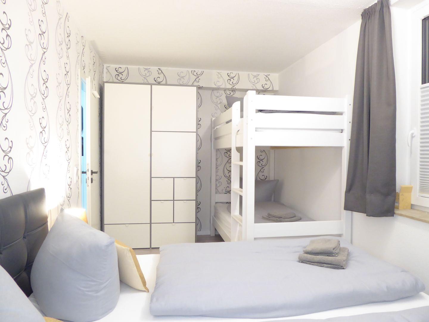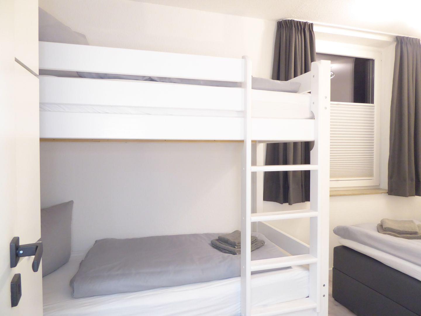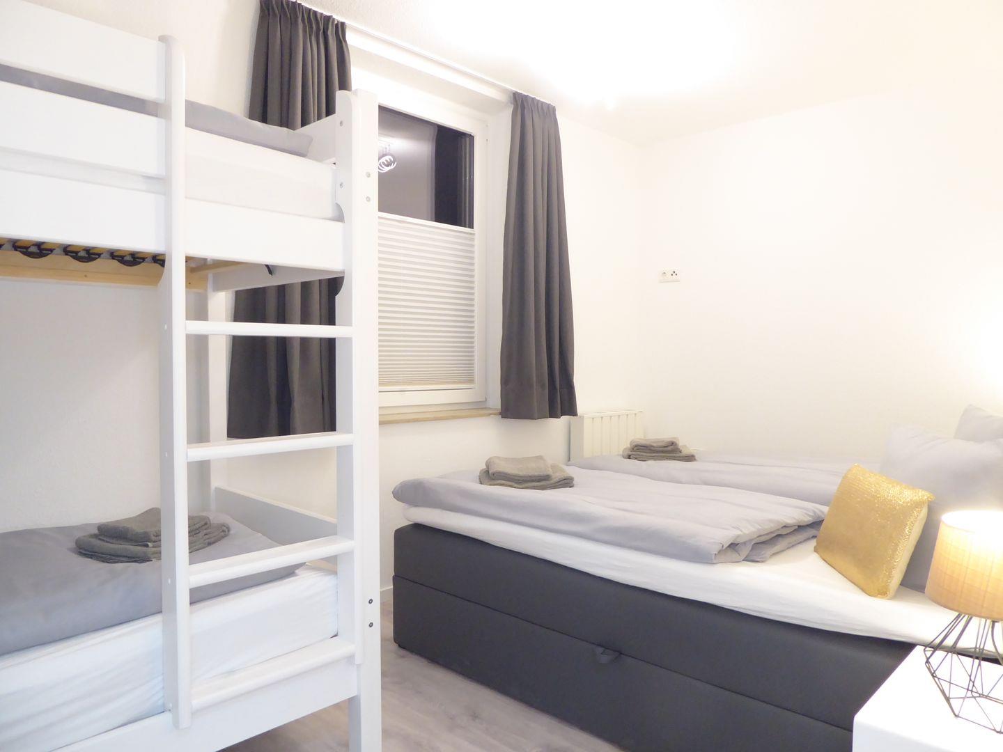Ein Schlafzimmer ist ausgestattet mit einem Boxspringbett (180x200cm). Das zweite Schlafzimmer verfügt über ein weiteres Boxspringbett (180x200) und ein stabiles Etagenbett (2x je 90x200cm) Hier können ohne Probleme 6 Erwachsene Personen schlafen.