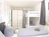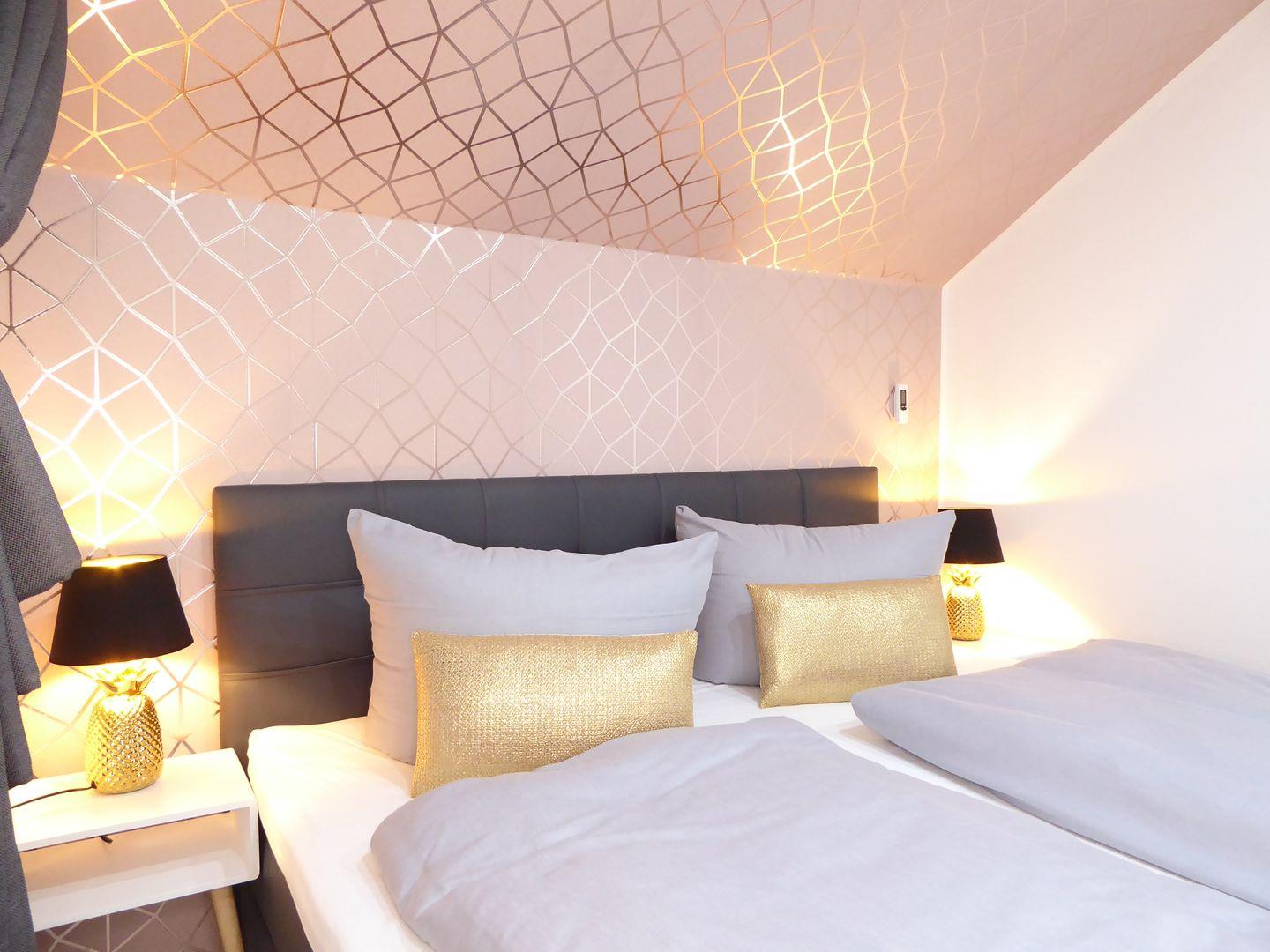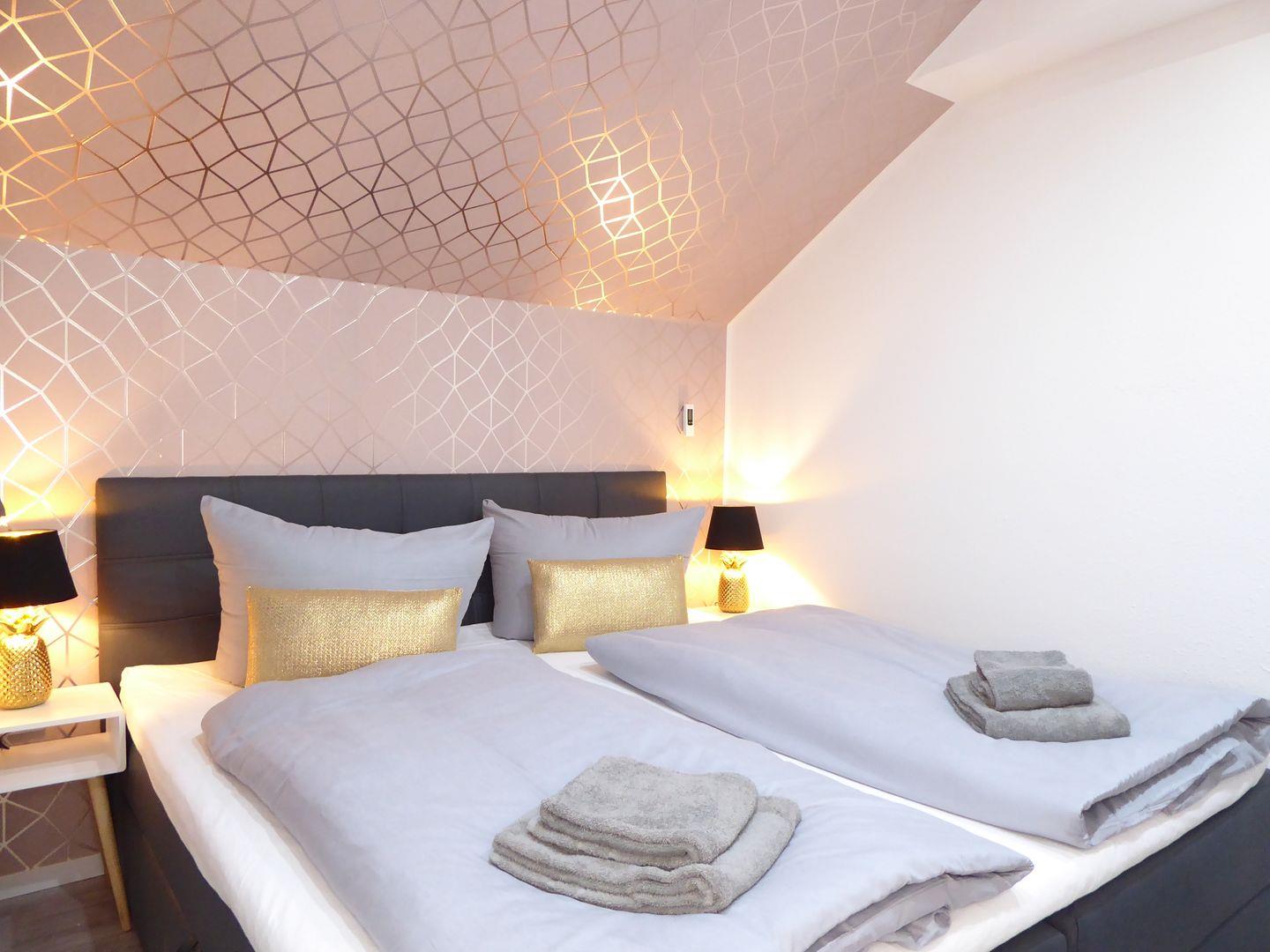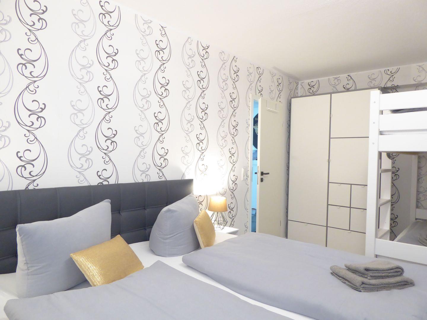 Ein Schlafzimmer ist ausgestattet mit einem Boxspringbett (180x200cm). Das zweite Schlafzimmer verfügt über ein weiteres Boxspringbett (180x200) und ein stabiles Etagenbett (2x je 90x200cm) Hier können ohne Probleme 6 Erwachsene Personen schlafen.
