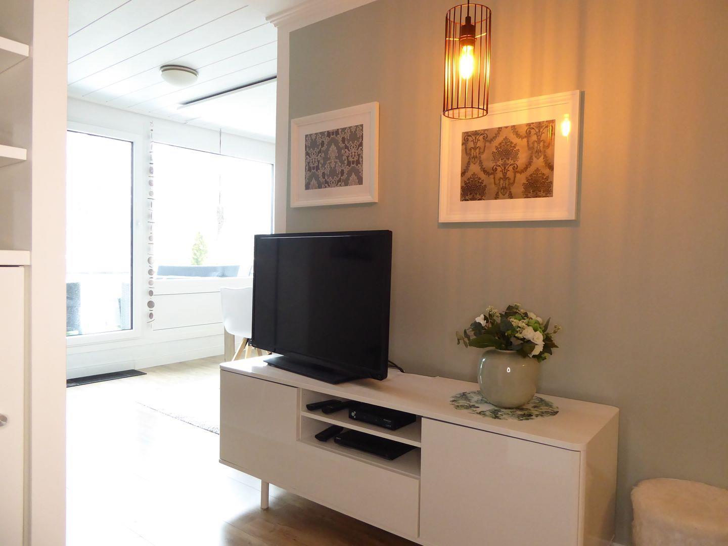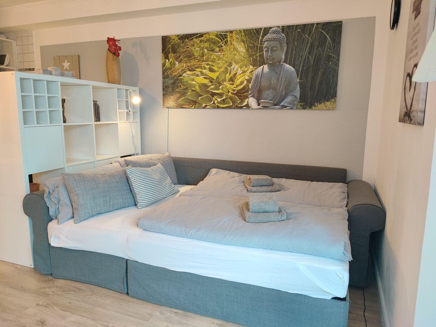 Im Wohnzimmer befindet sich ein bequemes Schlafsofa für weitere 2 Personen.