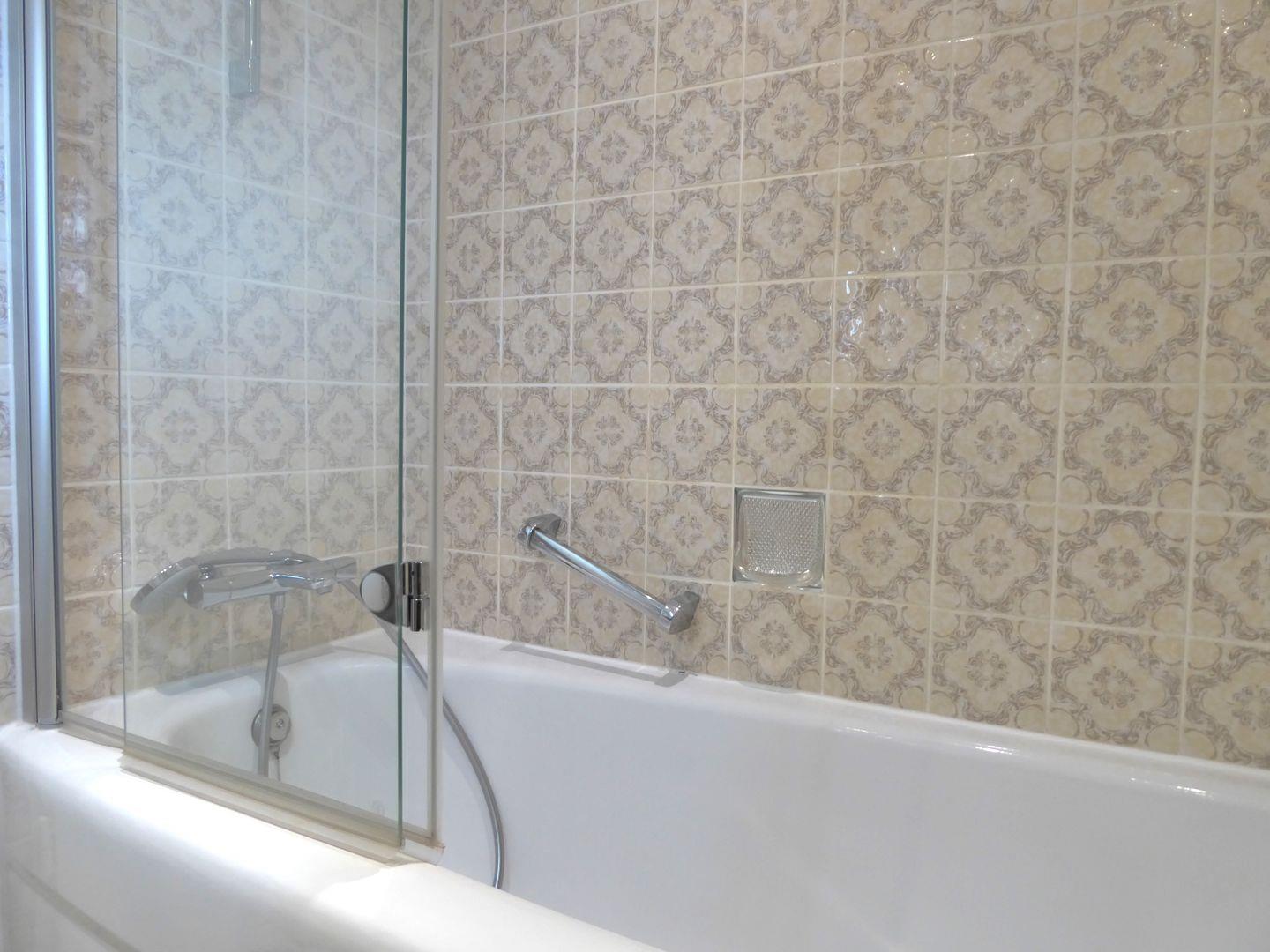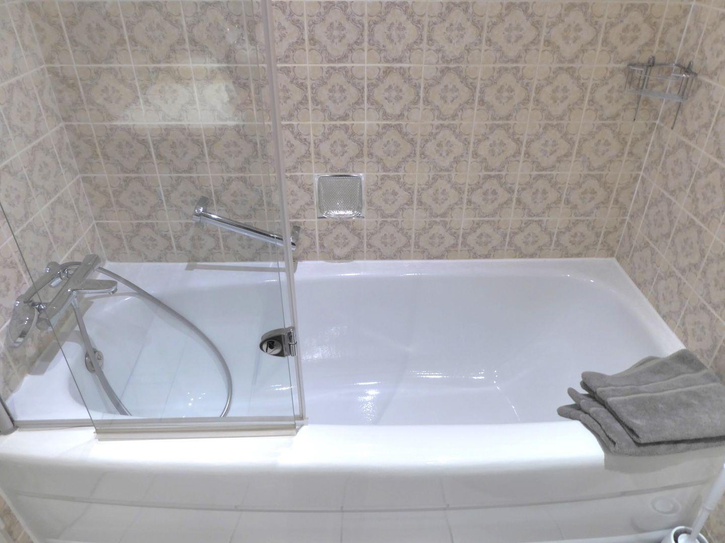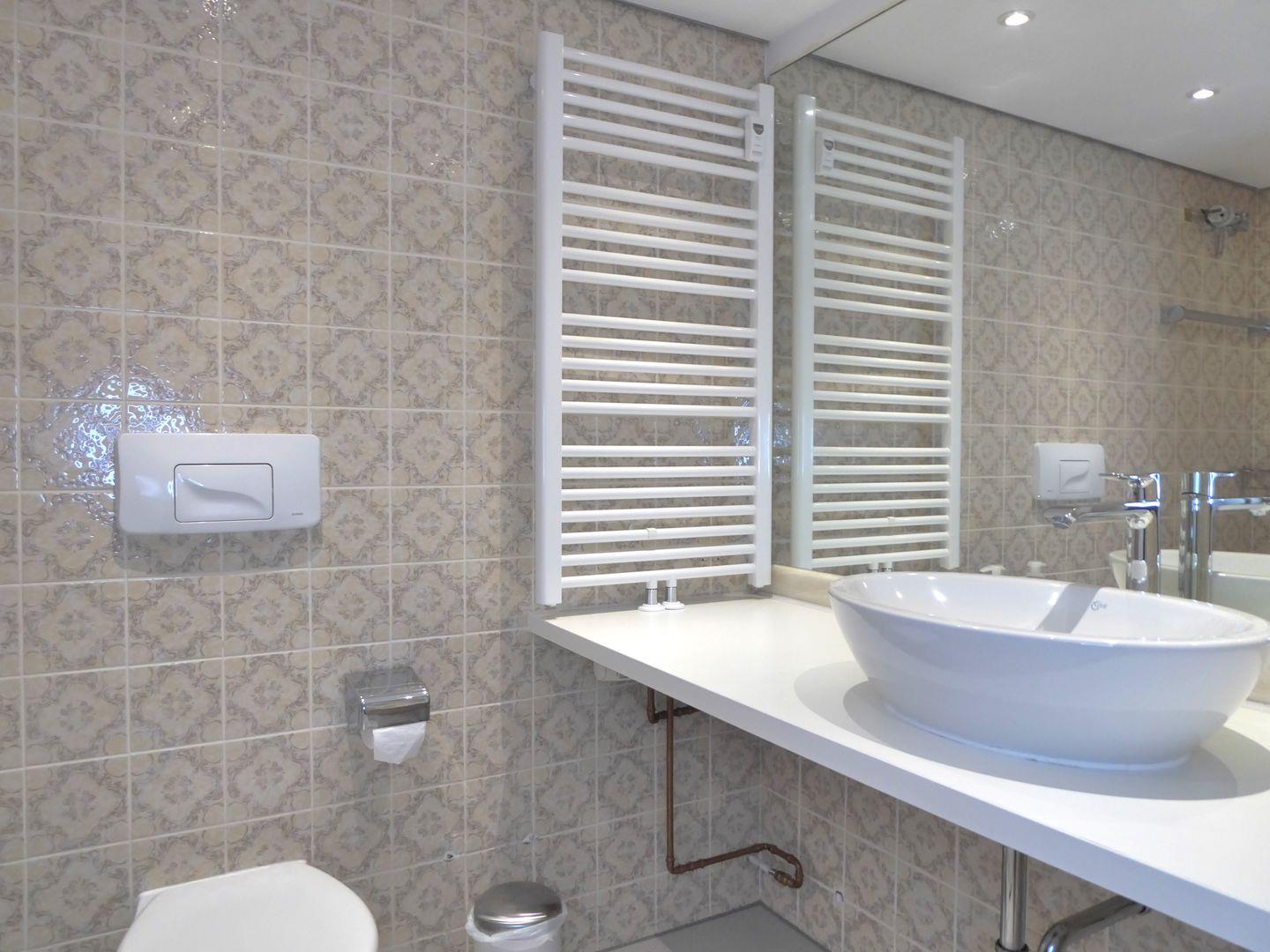 Im Badezimmer befindet sich eine Duschbadewanne ein großer Spiegel mit Waschtisch und eine Toilette.