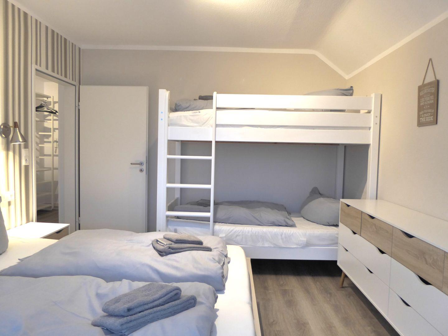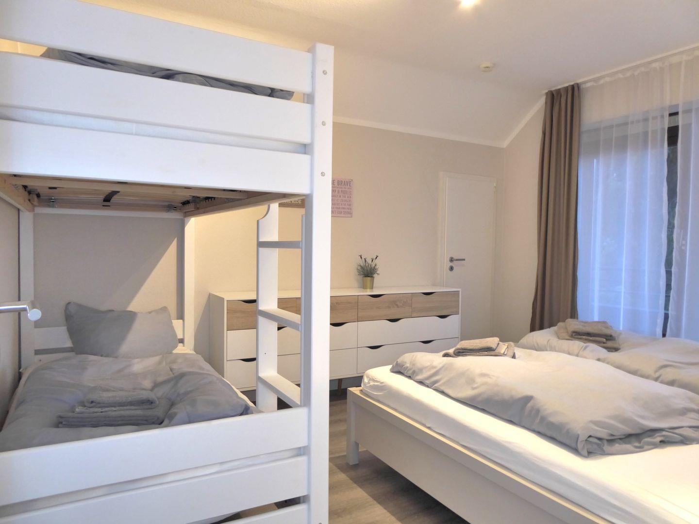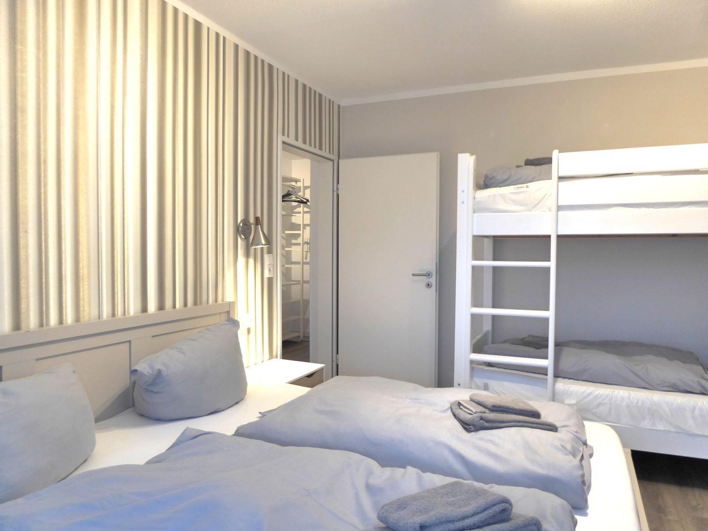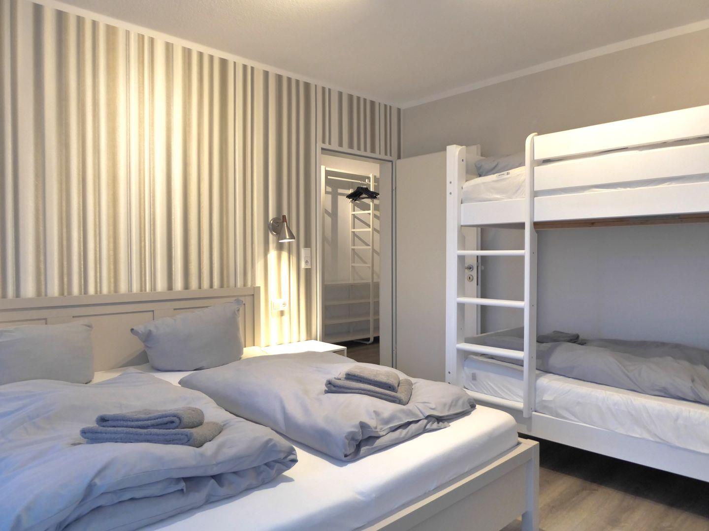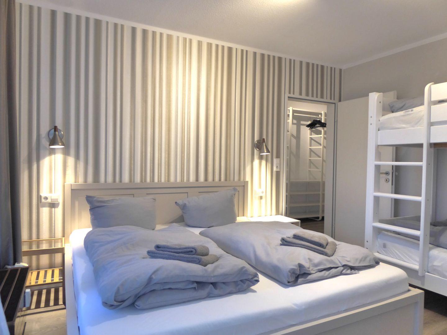 Ein Schlafzimmer ist ausgestattet mit einem Doppelbett (180x200cm) und einem Etagenbett für Erwachsene (90x200) einer großen Kommode . Das zweite Schlafzimmer verfügt über 2 Doppelbetten(90x200) und 2 weitere Kleiderschränke. Hier können ohne Probleme 6 Erwachsene Personen schlafen.