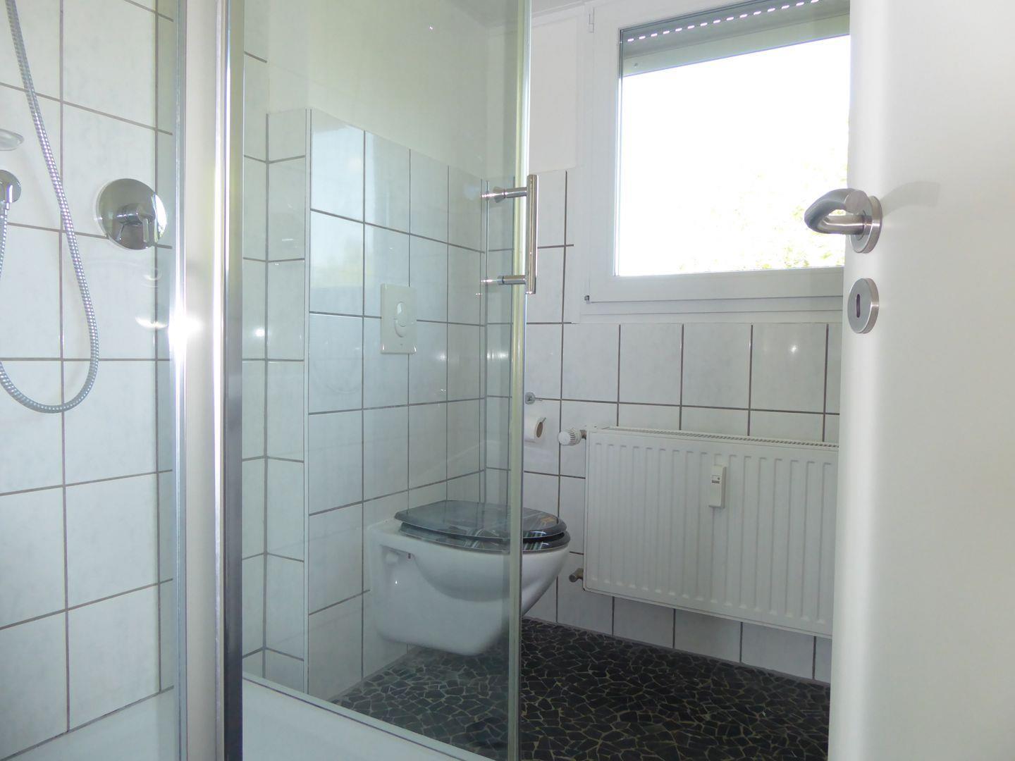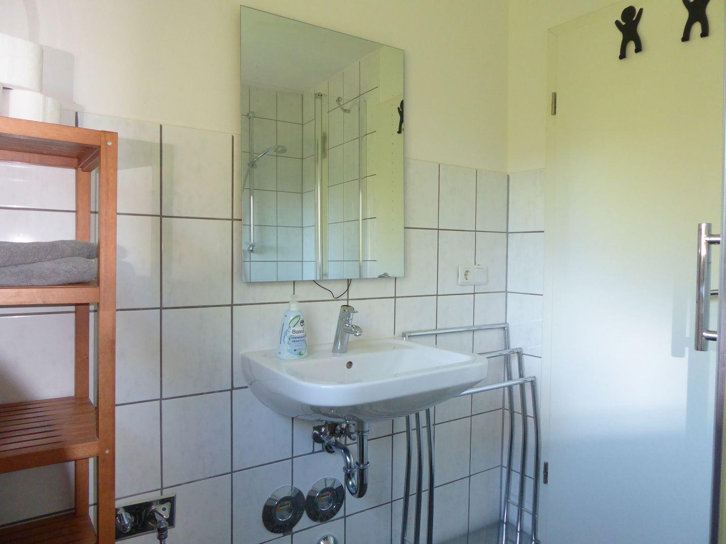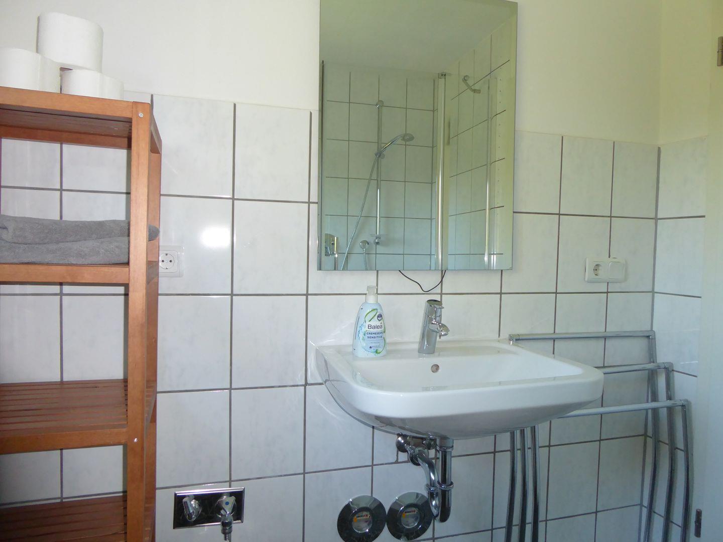 Das Badezimmer ist komplett gefliest und verfügt über eine Dusche, ein WC und ein Waschbecken.