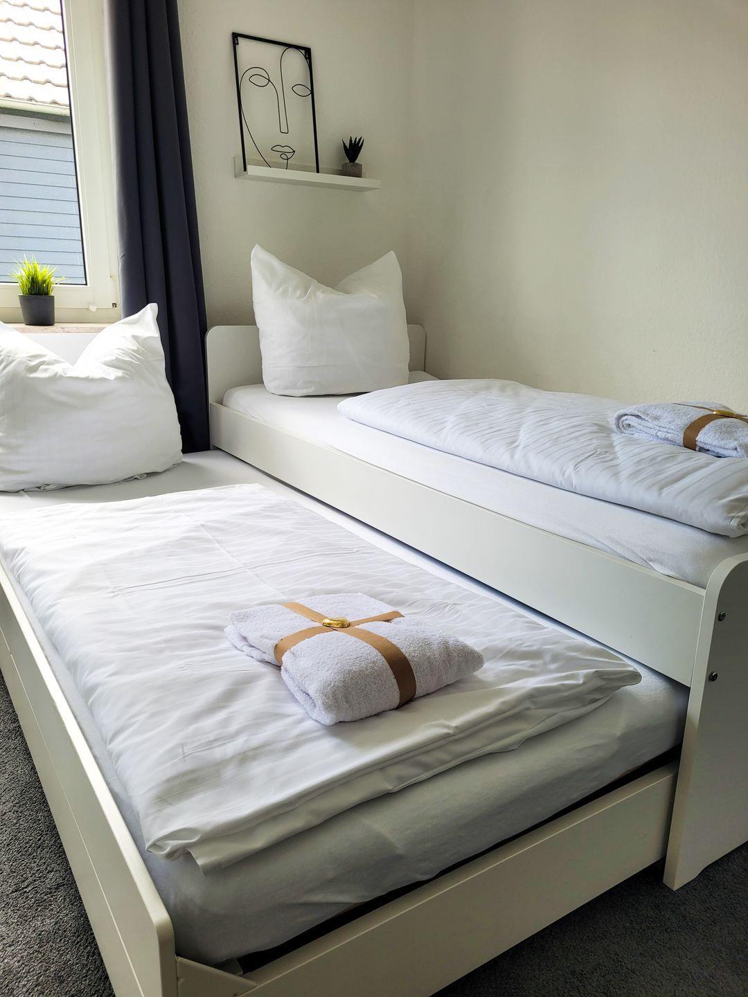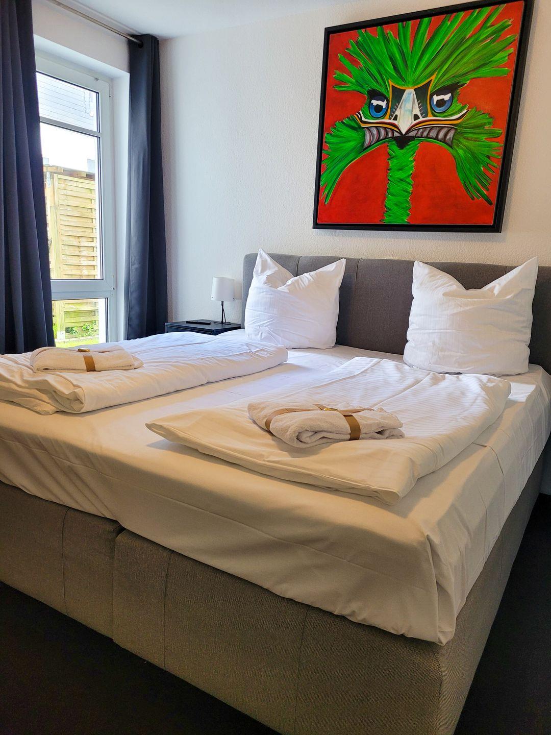 Insgesamt gut 72 m² Wohnfläche verteilen sich auf eine Diele, einen großen Wohn-Essraum mit offener Küche und Zugang zum Balkon, ein geräumiges Doppelschlafzimmer, ein kleineres Doppelschlafzimmer mit einem für die 2. Person ausziehbaren Bett und ein hell gefliestes Bad mit Badewanne/Dusche/Waschtisch/WC. Sowohl das Wohnzimmer als auch die beiden Schlafzimmer verfügen über jeweils einen Fernseher. Das Appartement besitzt zudem einen Internet-Anschluss/W-LAN.