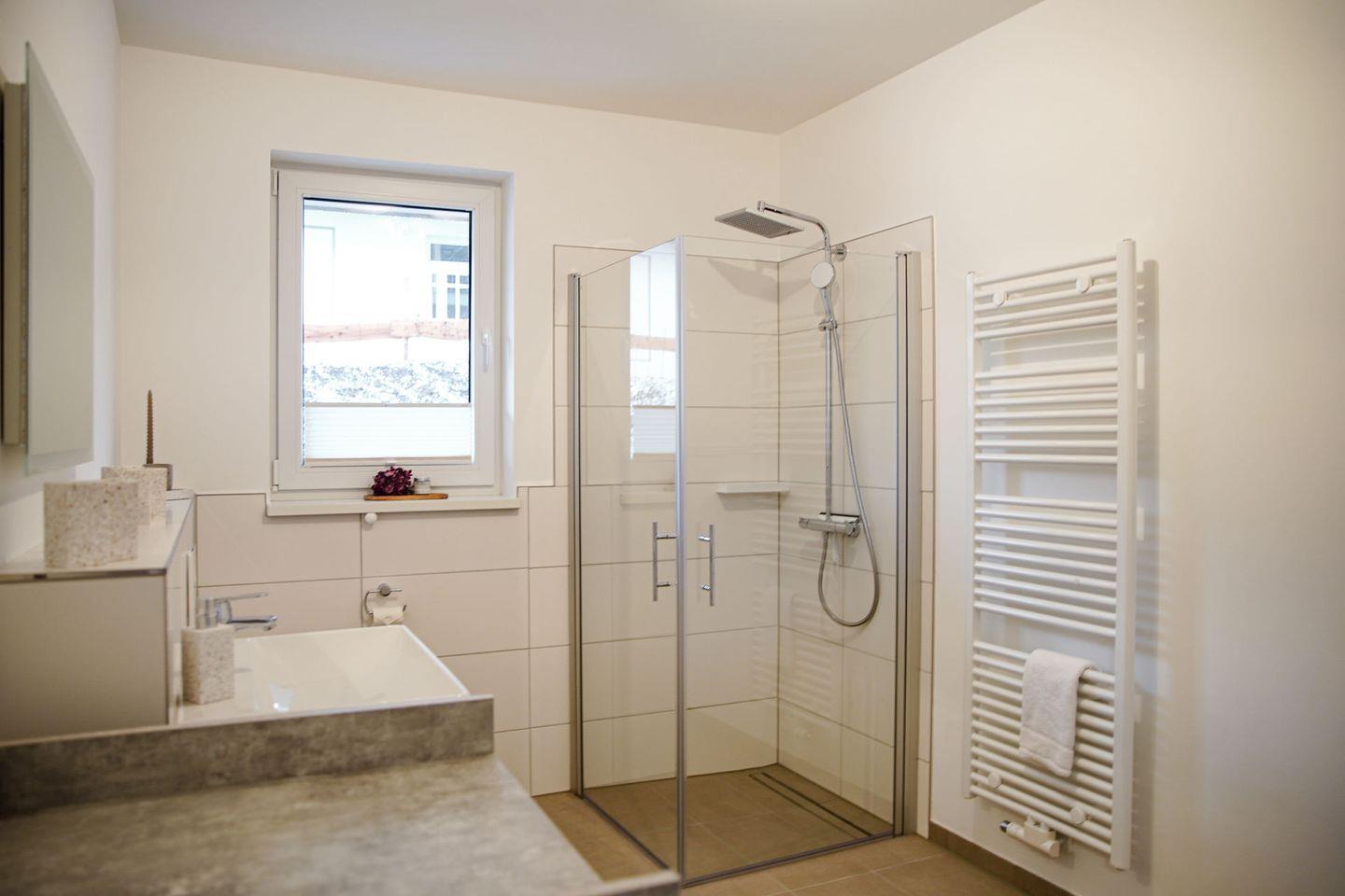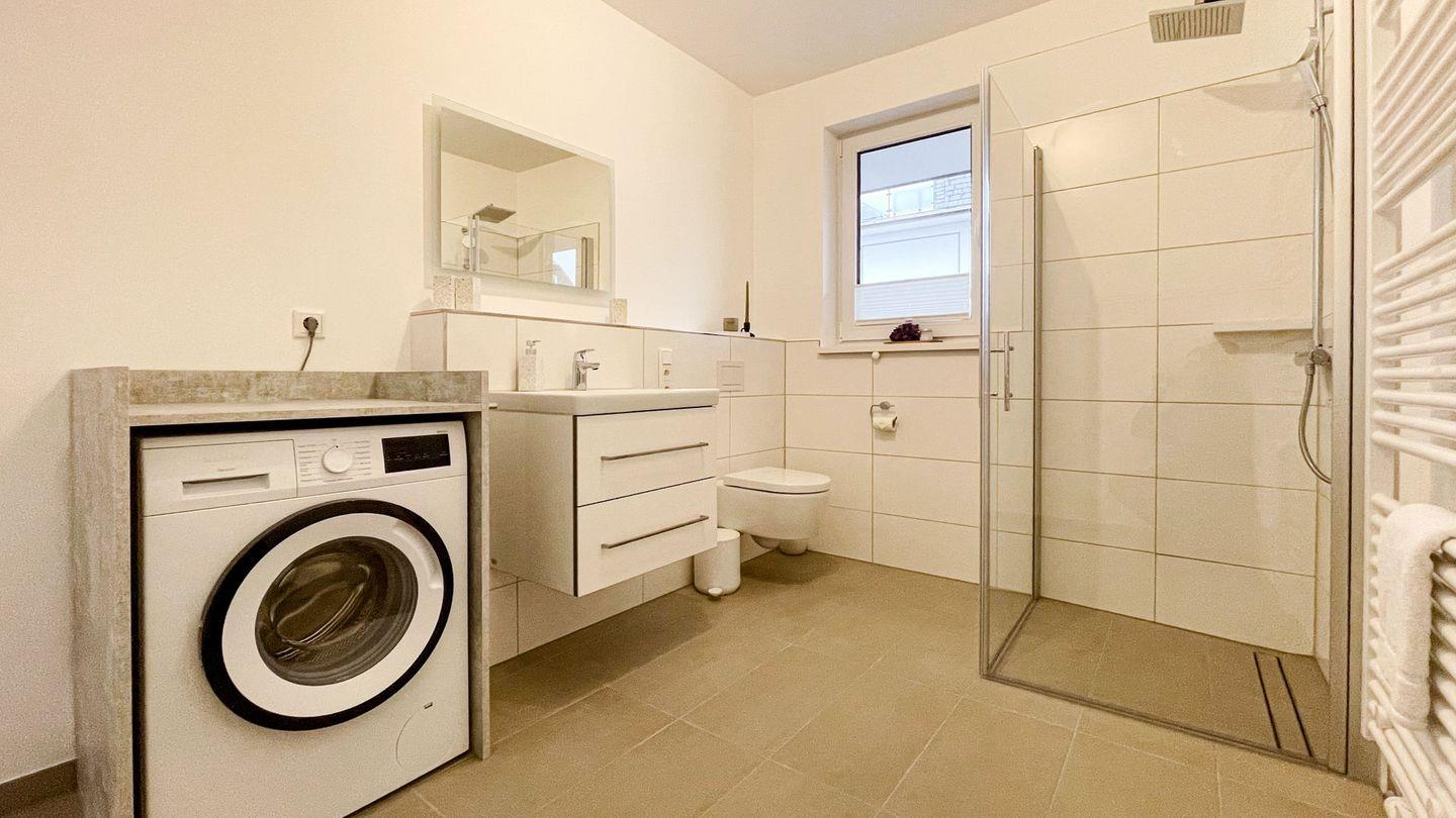 - Badezimmer mit ebenerdiger Dusche und Waschmaschine
